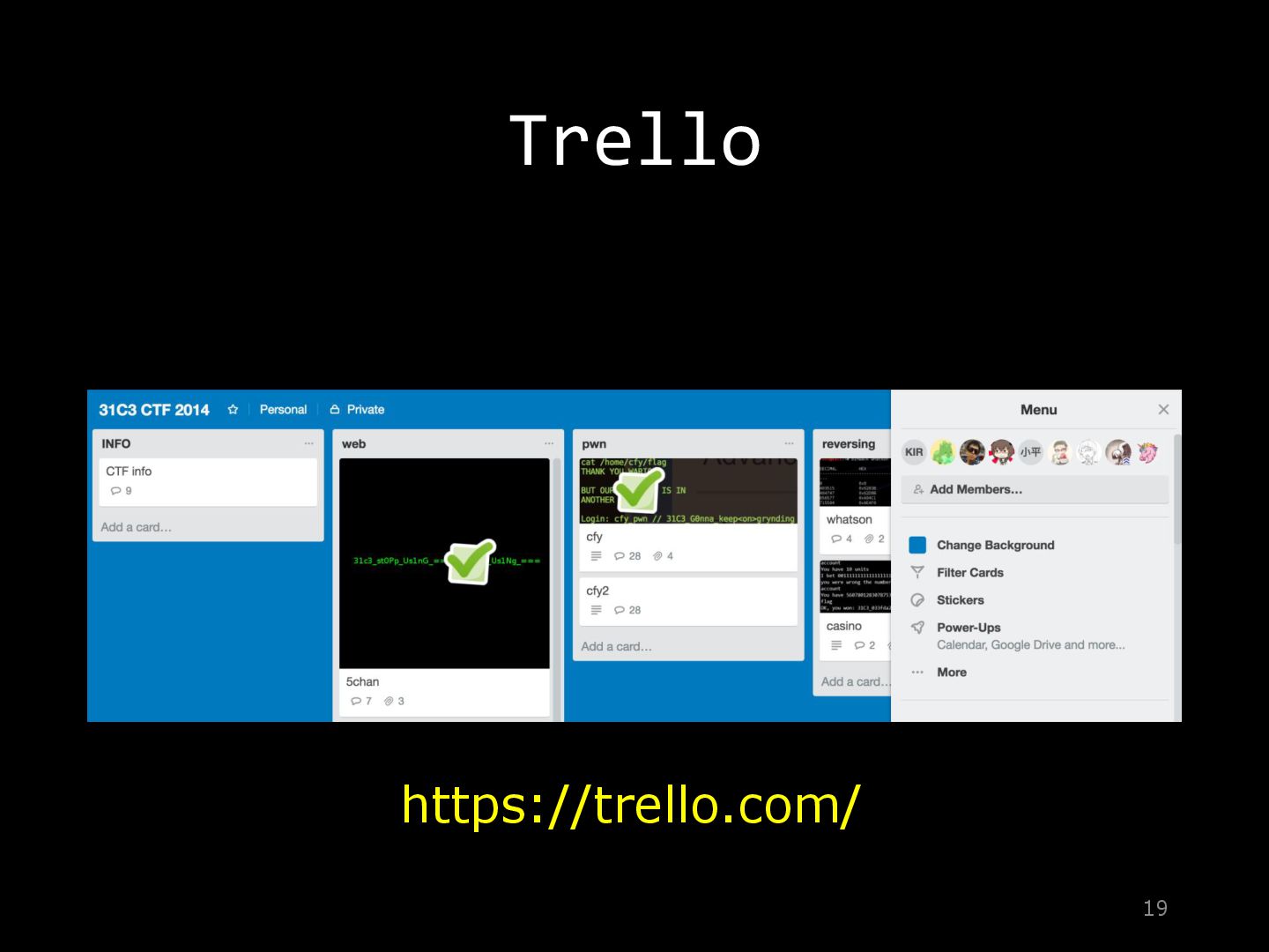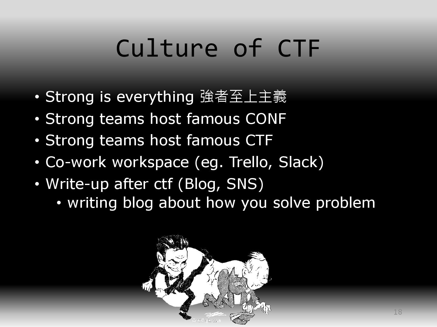 teams host famous CONF • Strong teams host famous CTF • Co-work workspace (eg. Trello, Slack) • Write-up after ctf (Blog, SNS) • writing blog about how you solve problem 18