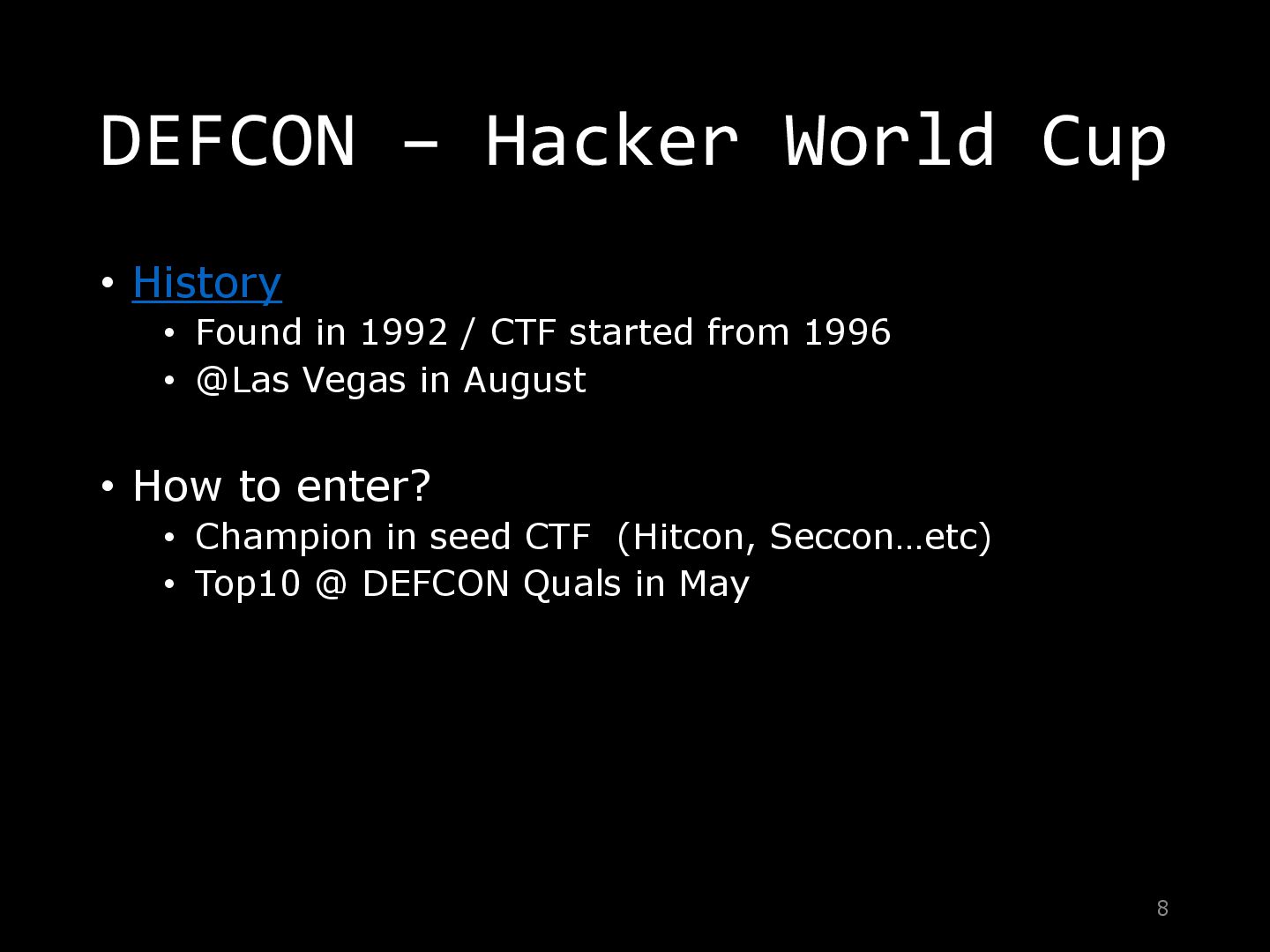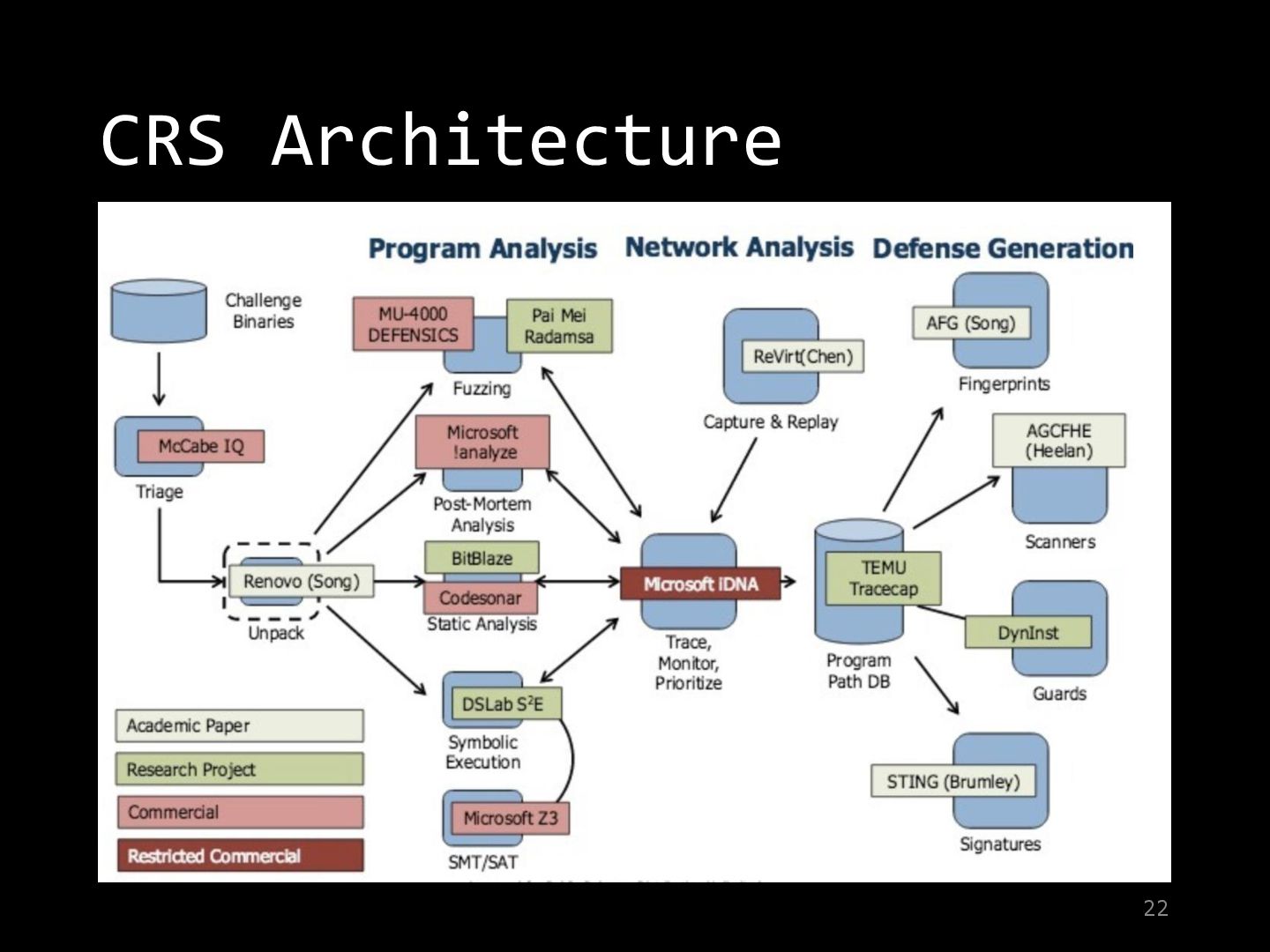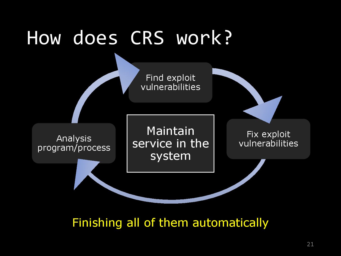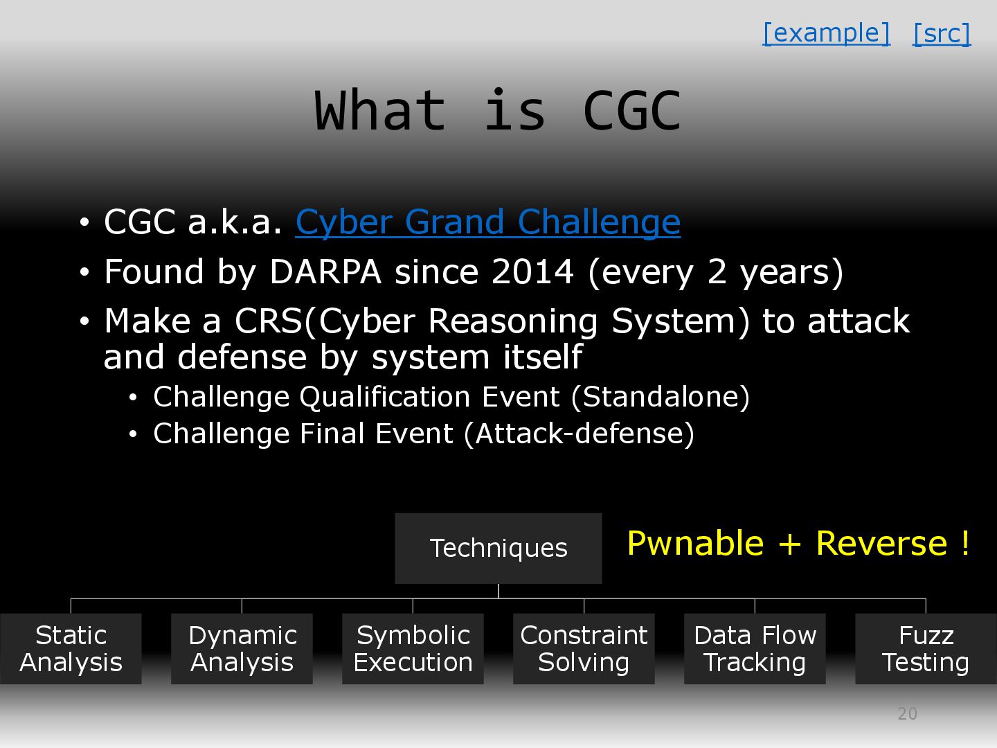 Found by DARPA since 2014 (every 2 years) • Make a CRS(Cyber Reasoning System) to attack and defense by system itself • Challenge Qualification Event (Standalone) • Challenge Final Event (Attack-defense) 20 Techniques Static Analysis Dynamic Analysis Symbolic Execution Constraint Solving Data Flow Tracking Fuzz Testing [src] [example] Pwnable + Reverse !