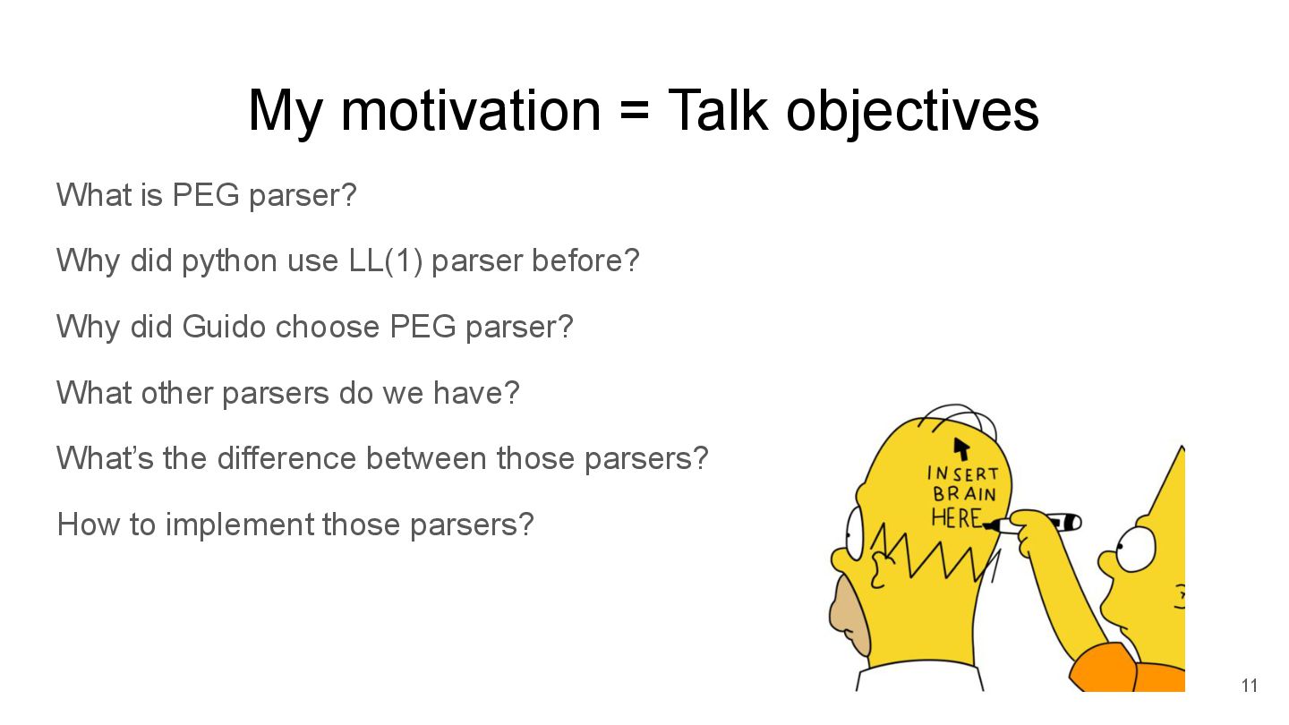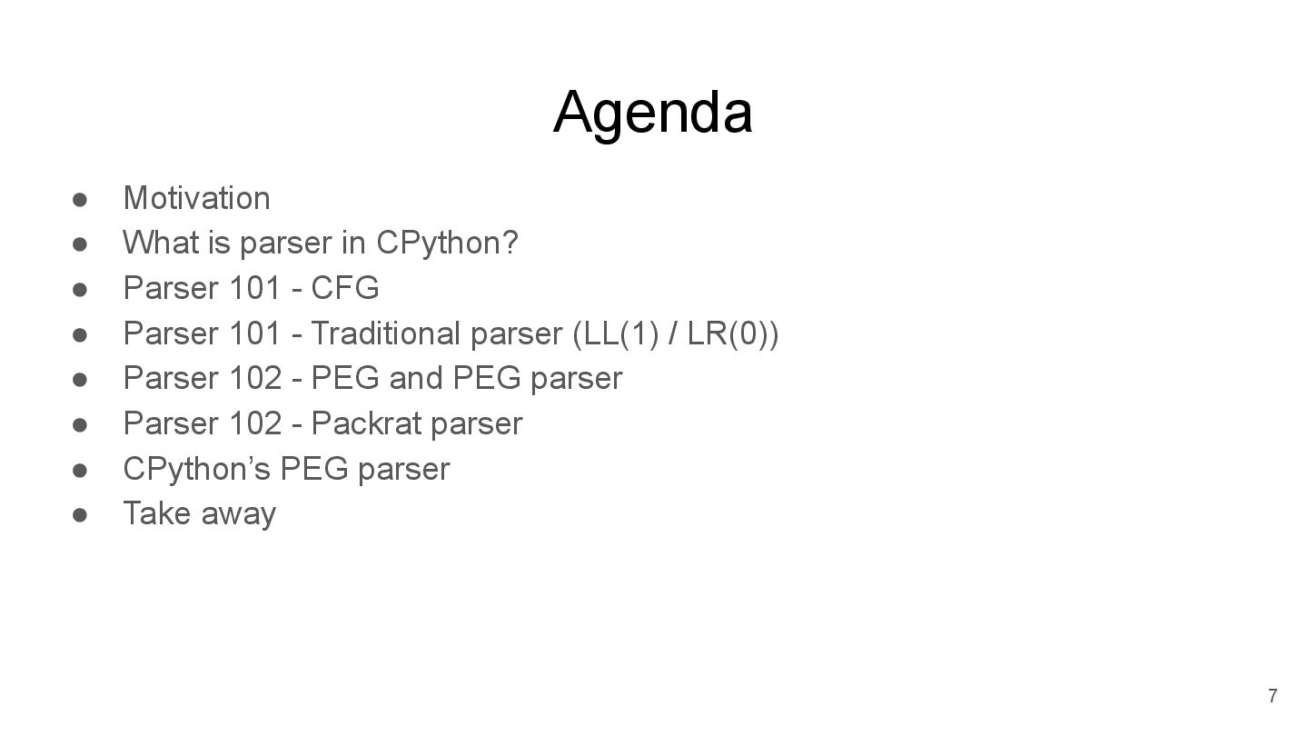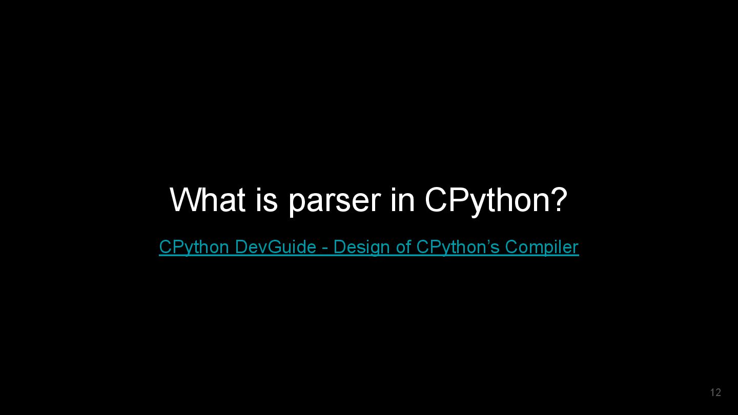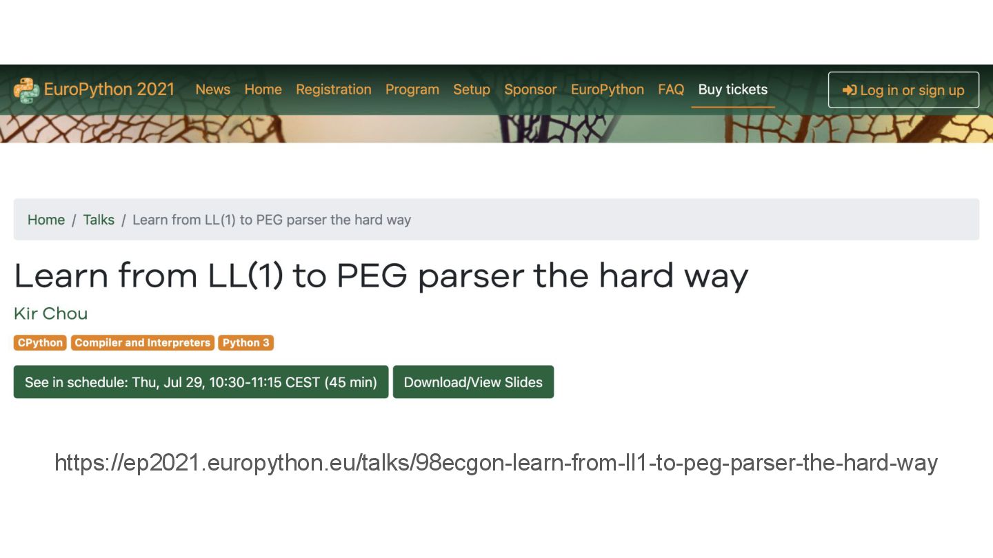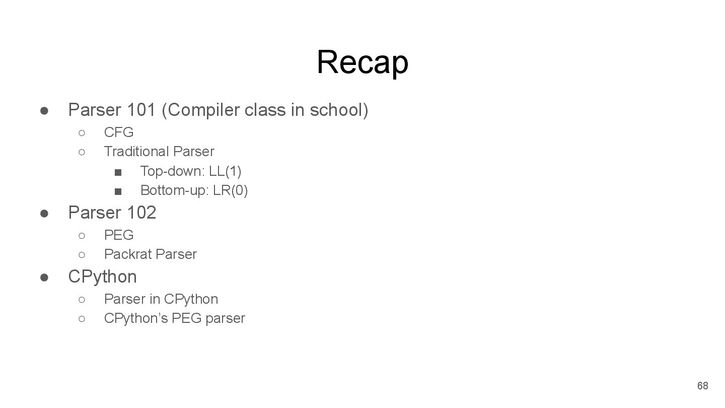 did python use LL(1) parser before? Why did Guido choose PEG parser? What other parsers do we have? What’s the difference between those parsers? How to implement those parsers? 11