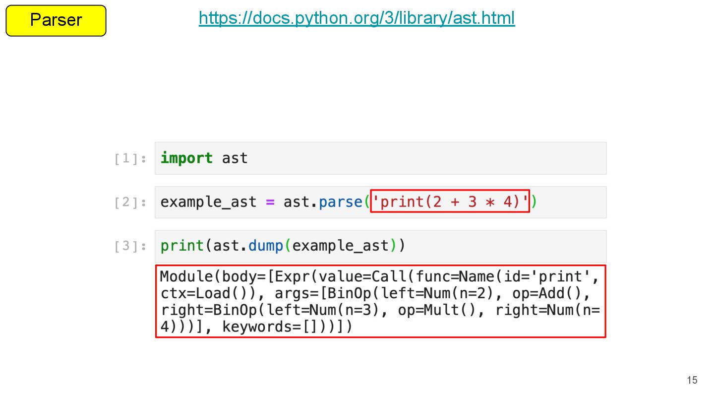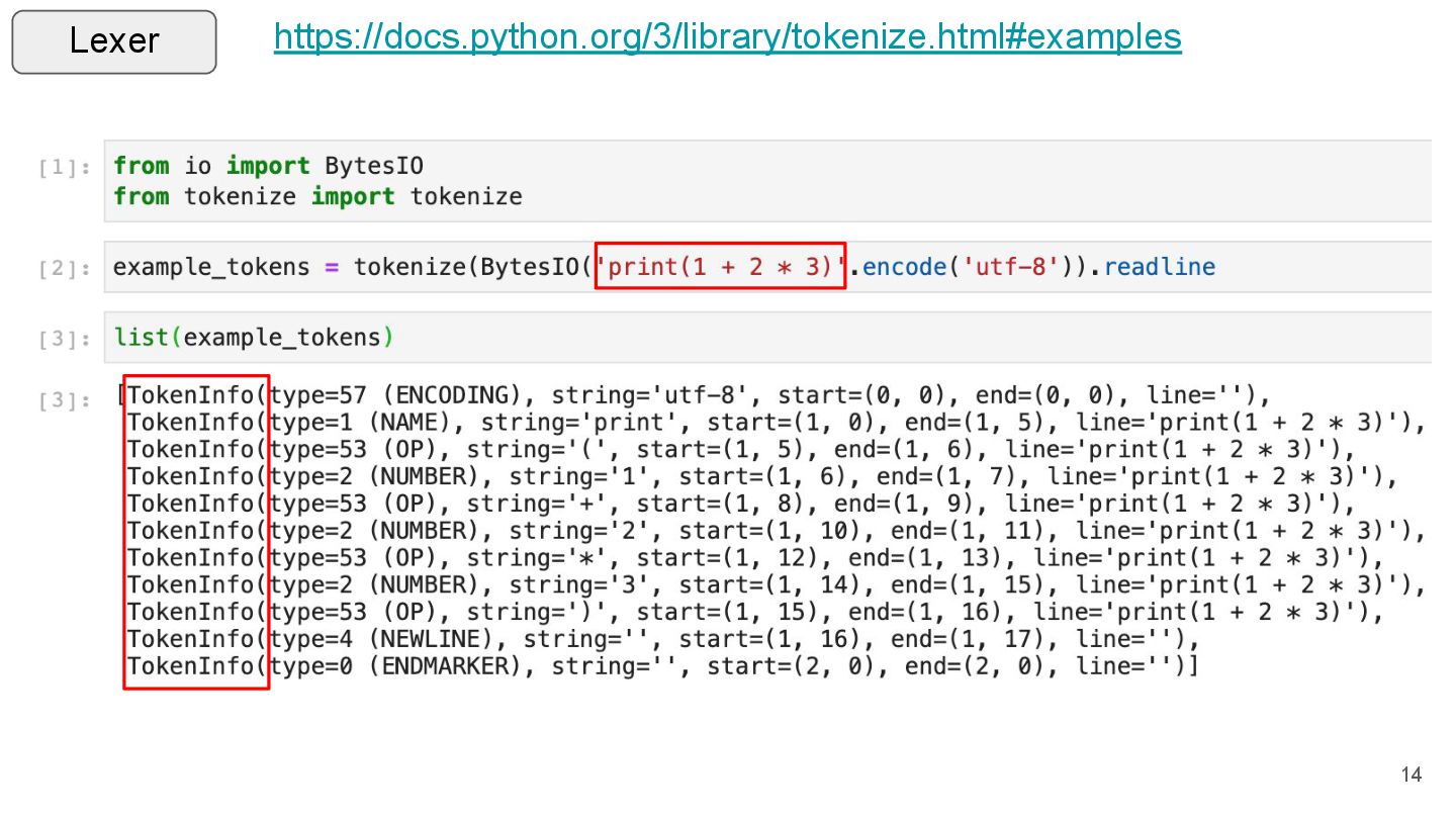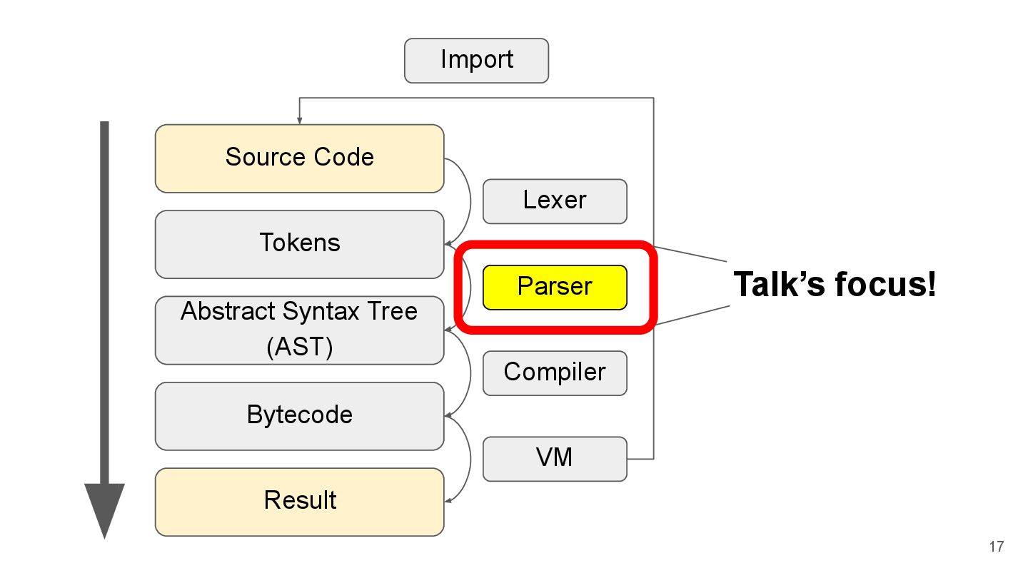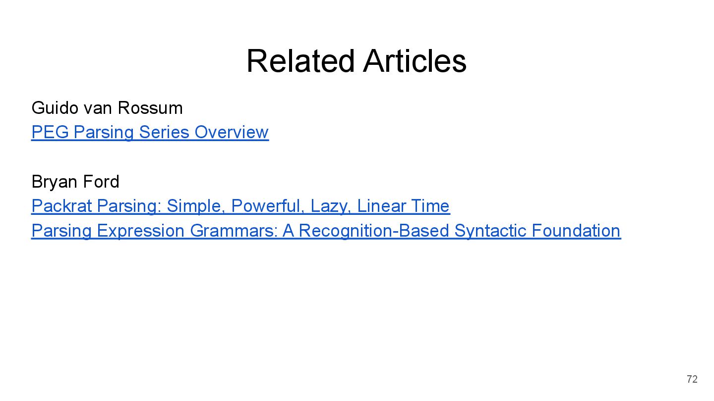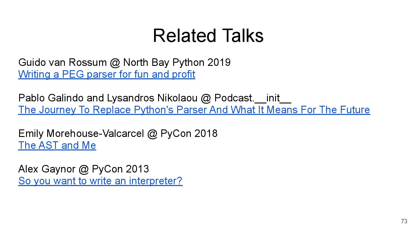 Writing a PEG parser for fun and profit Pablo Galindo and Lysandros Nikolaou @ Podcast.__init__ The Journey To Replace Python's Parser And What It Means For The Future Emily Morehouse-Valcarcel @ PyCon 2018 The AST and Me Alex Gaynor @ PyCon 2013 So you want to write an interpreter? 73