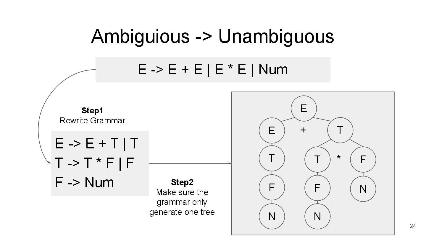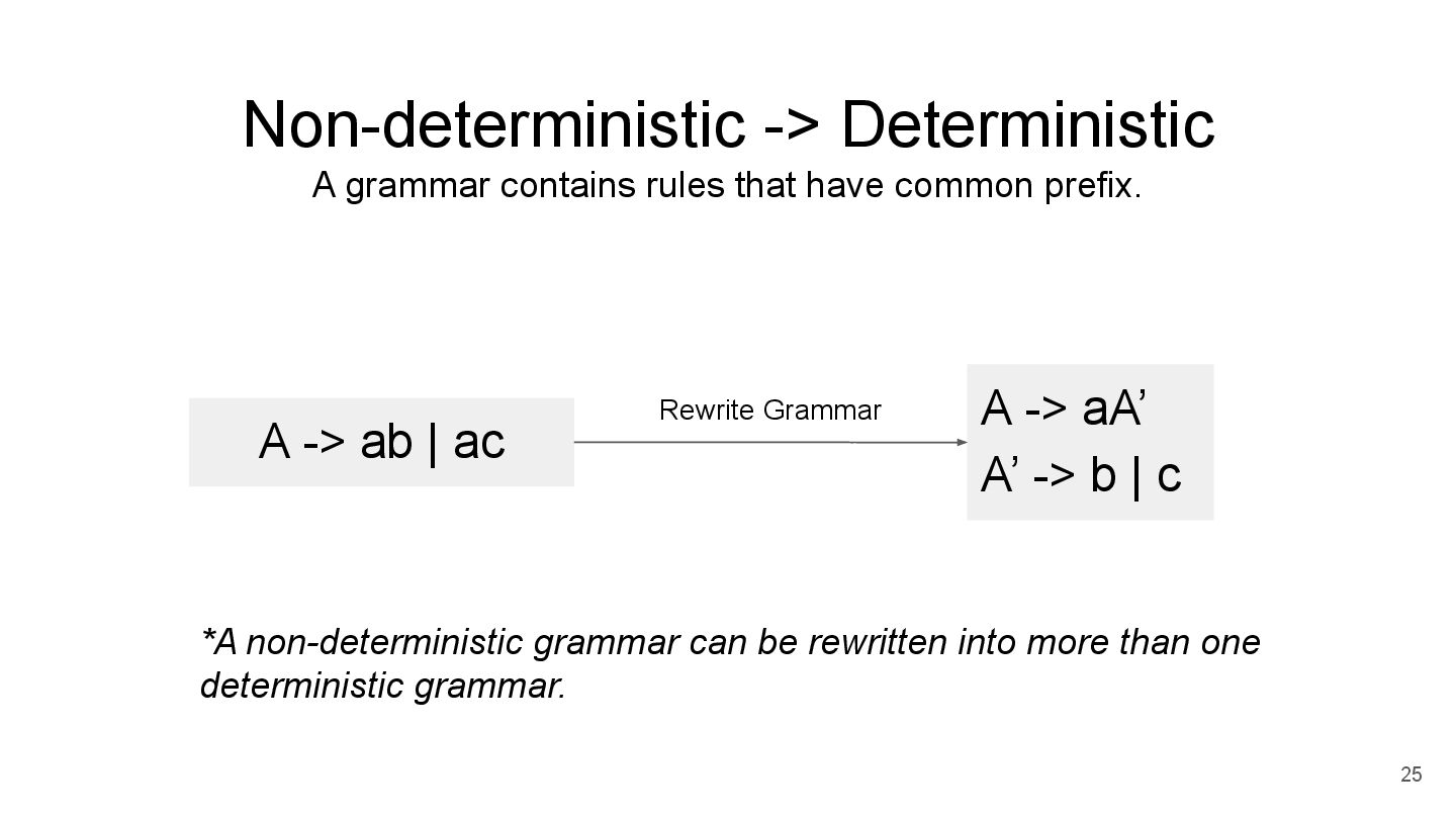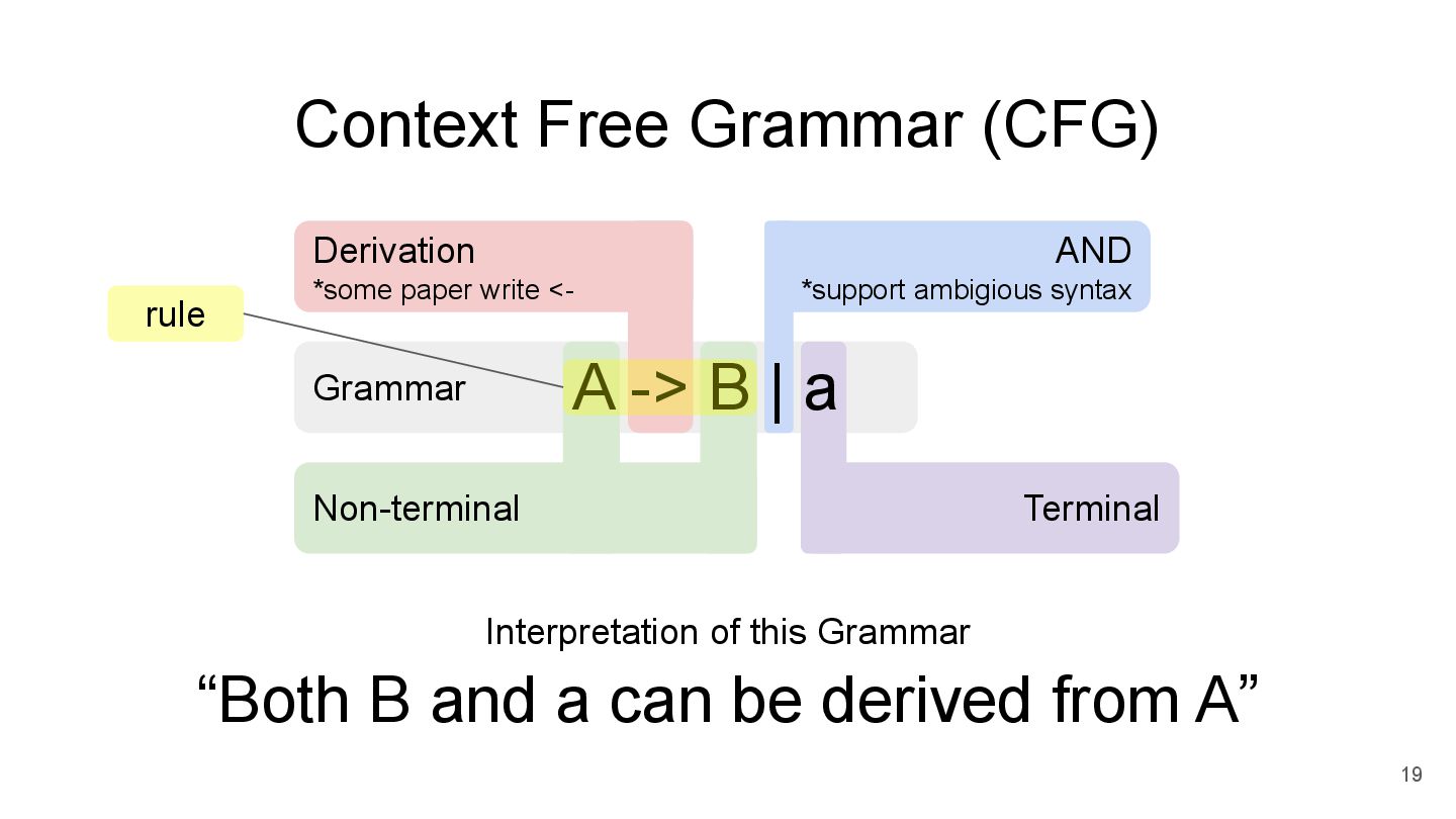 A will try A -> B first. Only after it fails at A -> B, A will only try A -> a. Derivation *some paper write <- Non-Terminal OR (if / elif / ...) *disallow ambigious syntax A -> B | a Terminal *Introduced in 2002 (Packrat Parsing: Simple, Powerful, Lazy, Linear Time) rule *support Regular Expression (EBNF grammar) in another paper