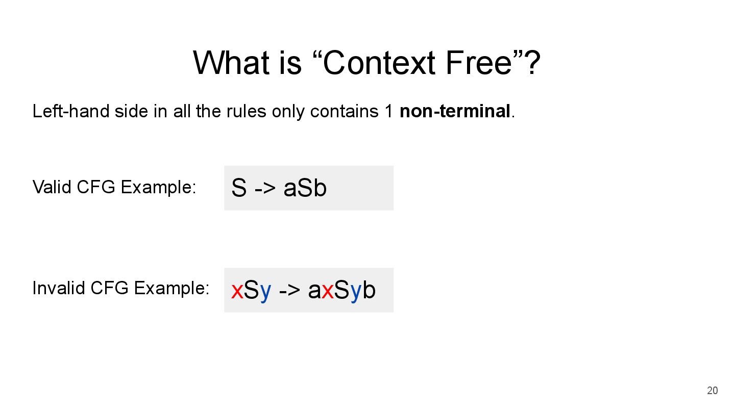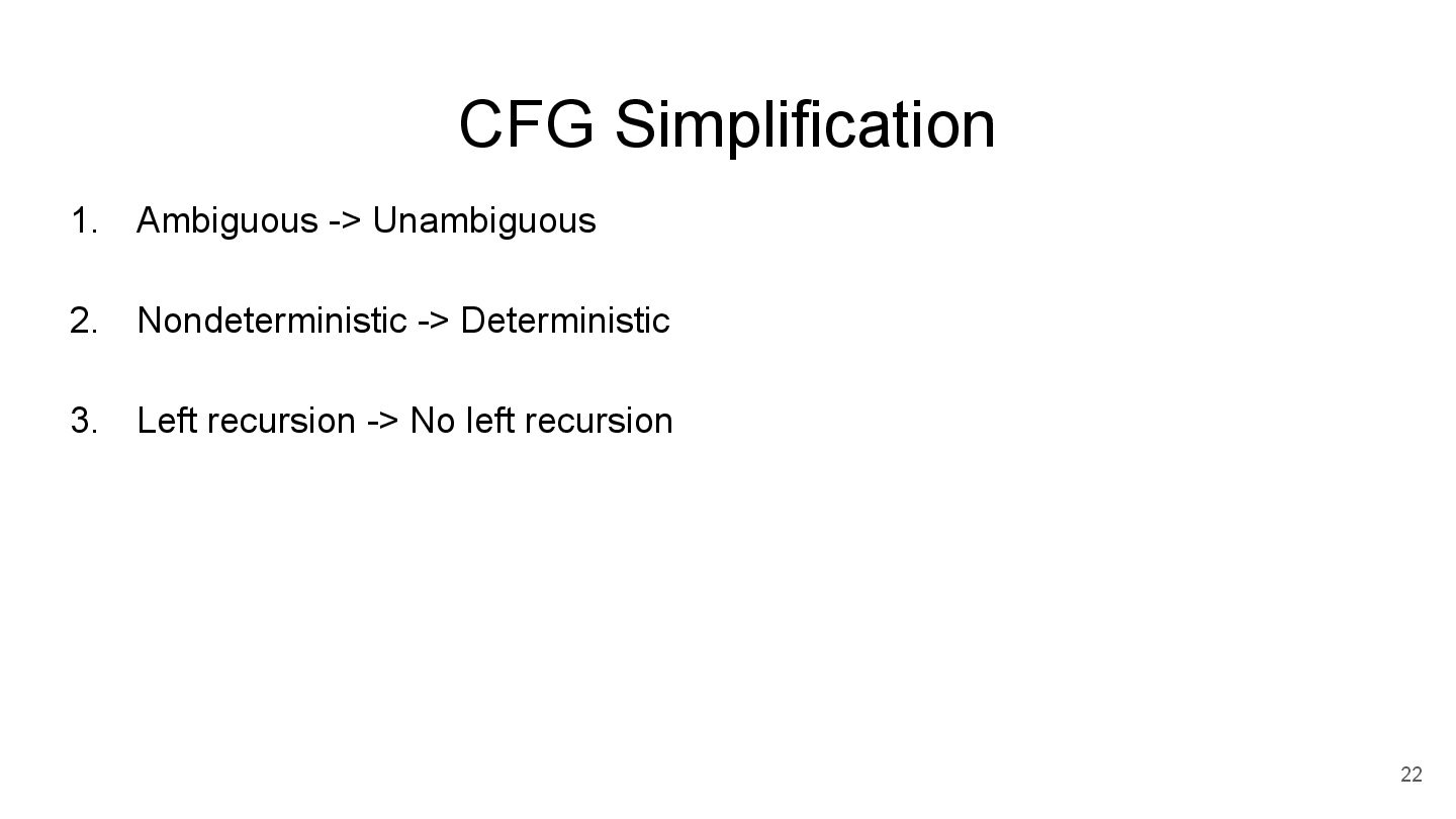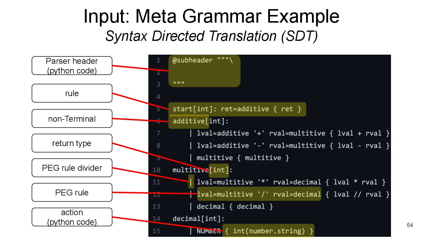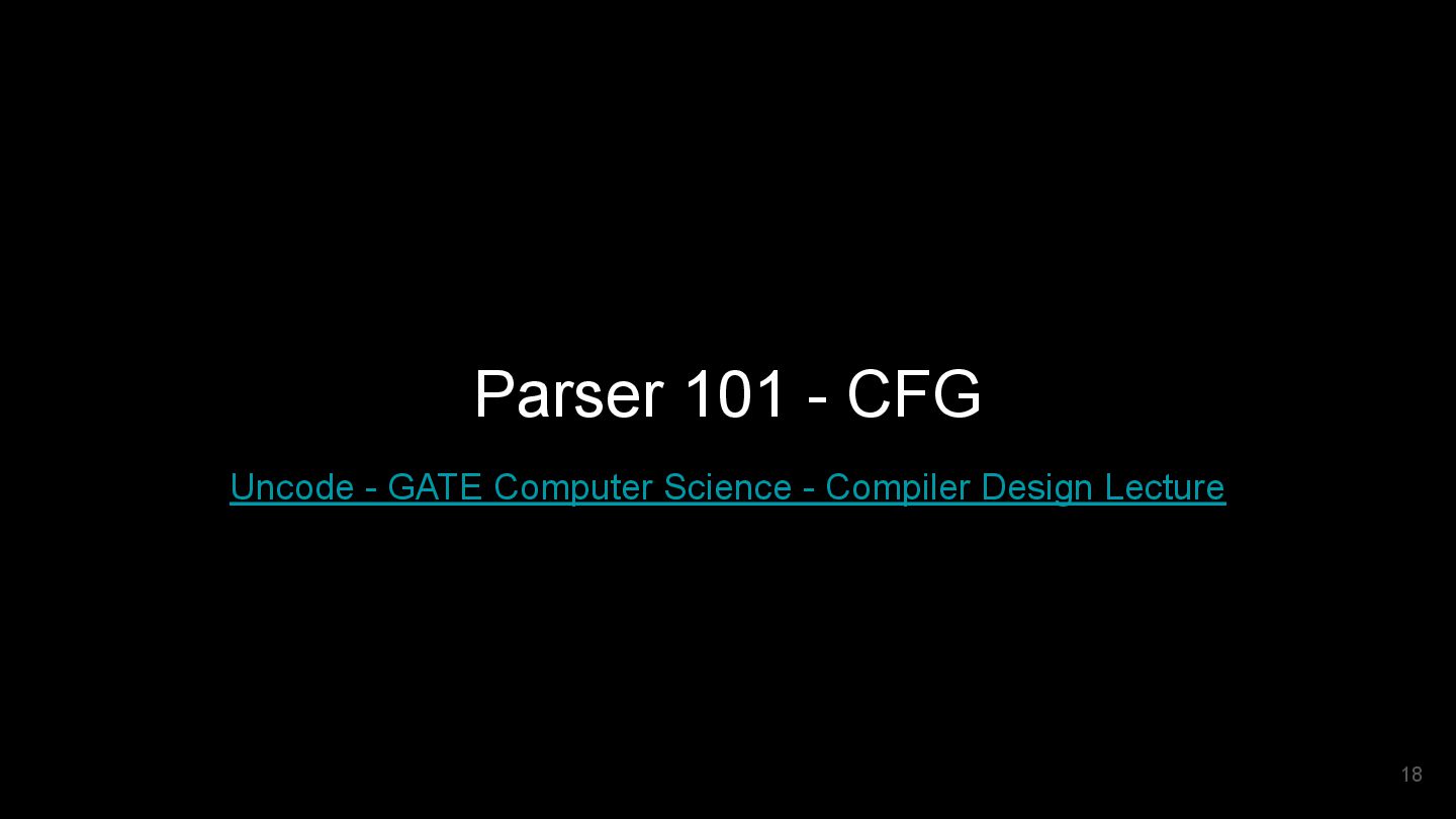 A will try A -> B first. Only after it fails at A -> B, A will only try A -> a. Derivation *some paper write <- Non-Terminal OR (if / elif / ...) *disallow ambigious syntax A -> B | a Terminal *Introduced in 2002 (Packrat Parsing: Simple, Powerful, Lazy, Linear Time) rule *support Regular Expression (EBNF grammar) in another paper