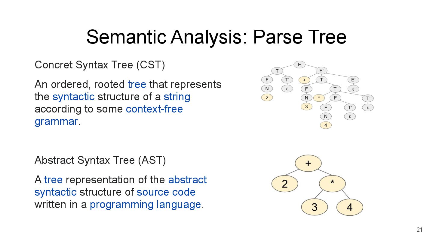 rooted tree that represents the syntactic structure of a string according to some context-free grammar. Abstract Syntax Tree (AST) A tree representation of the abstract syntactic structure of source code written in a programming language. 21