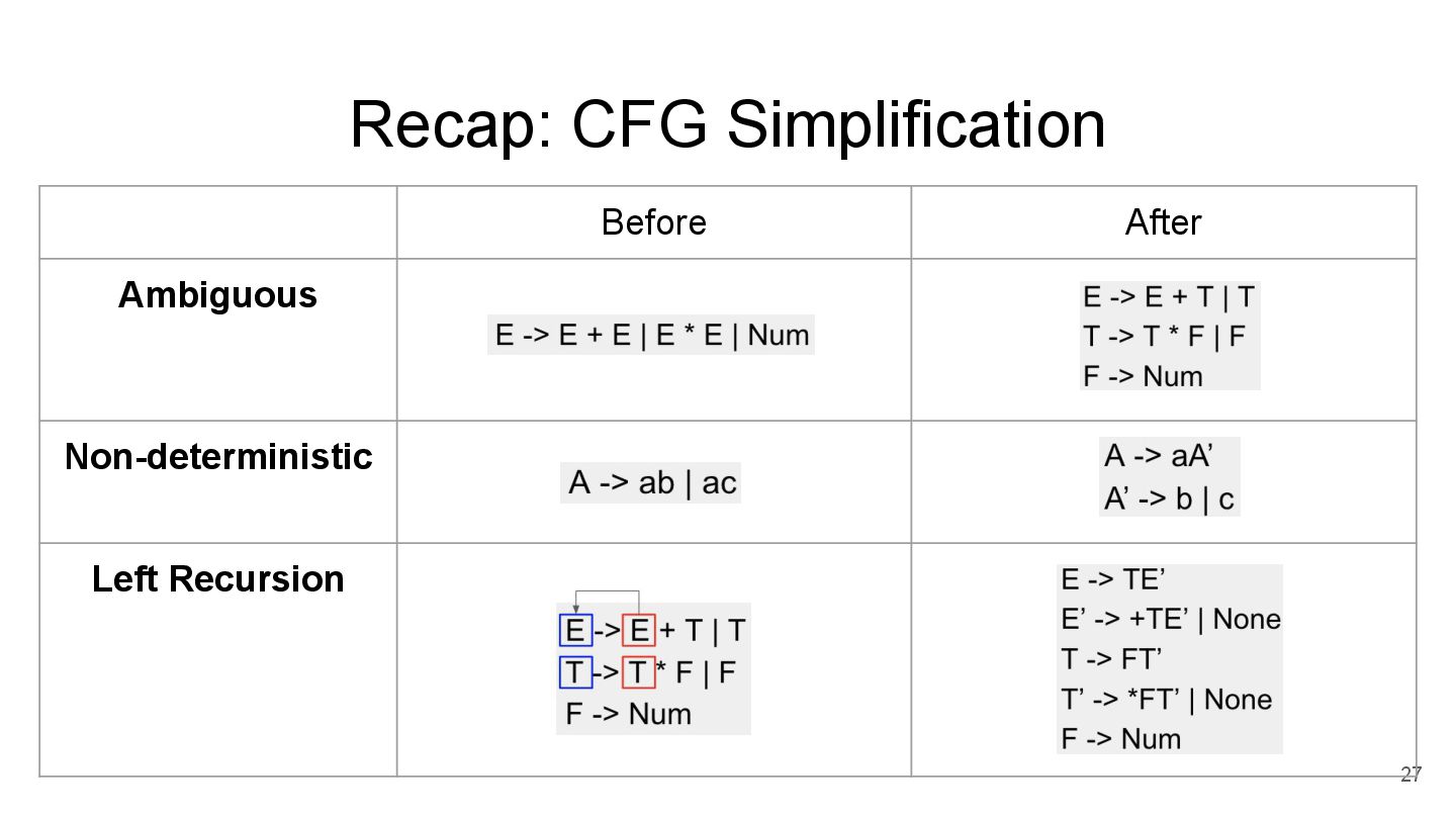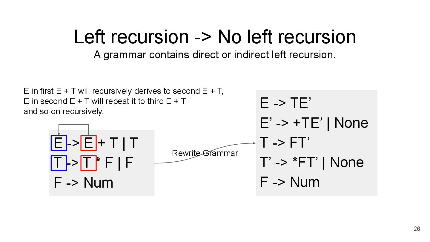 or indirect left recursion. 26 E -> E + T | T T -> T * F | F F -> Num E -> TE’ E’ -> +TE’ | None T -> FT’ T’ -> *FT’ | None F -> Num Rewrite Grammar E in first E + T will recursively derives to second E + T, E in second E + T will repeat it to third E + T, and so on recursively.