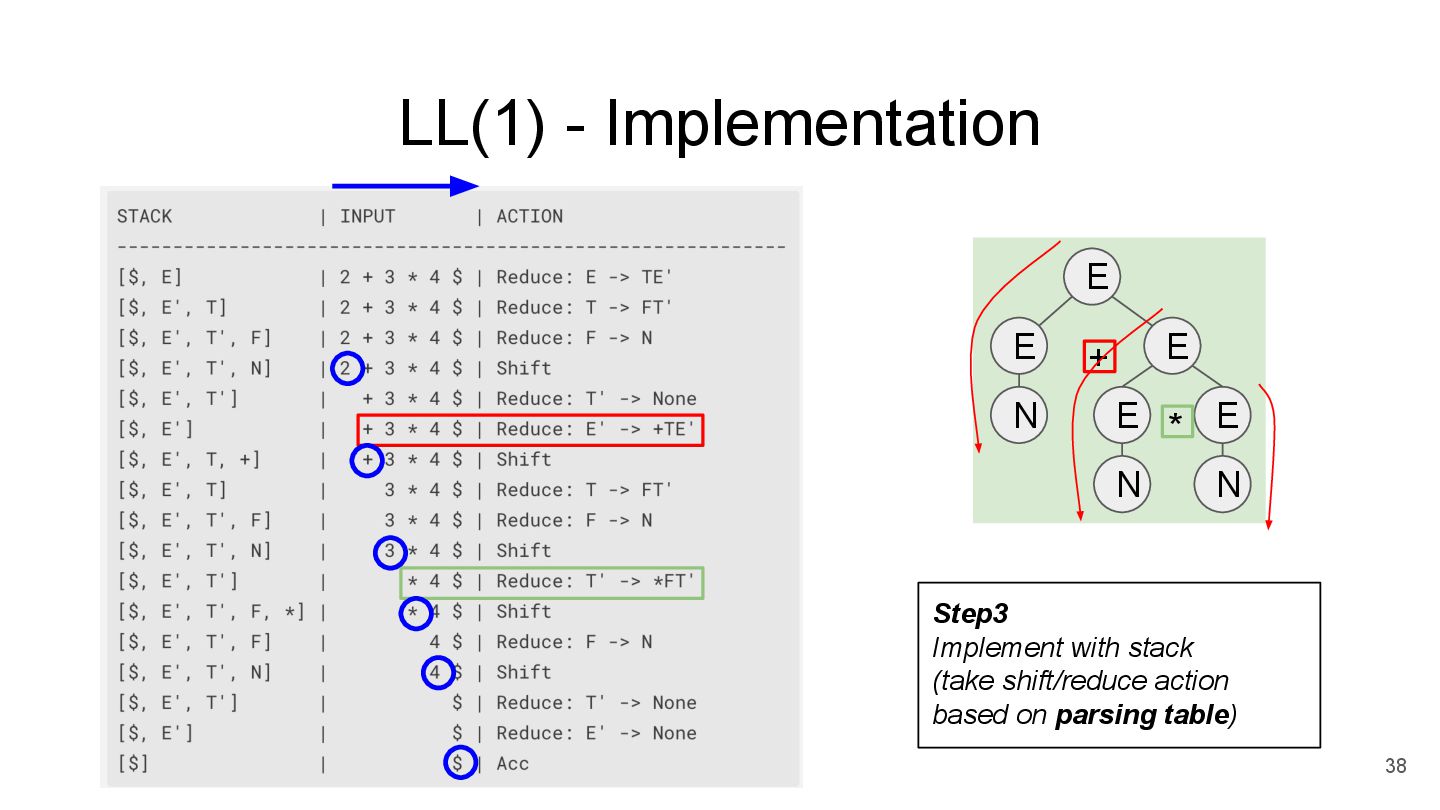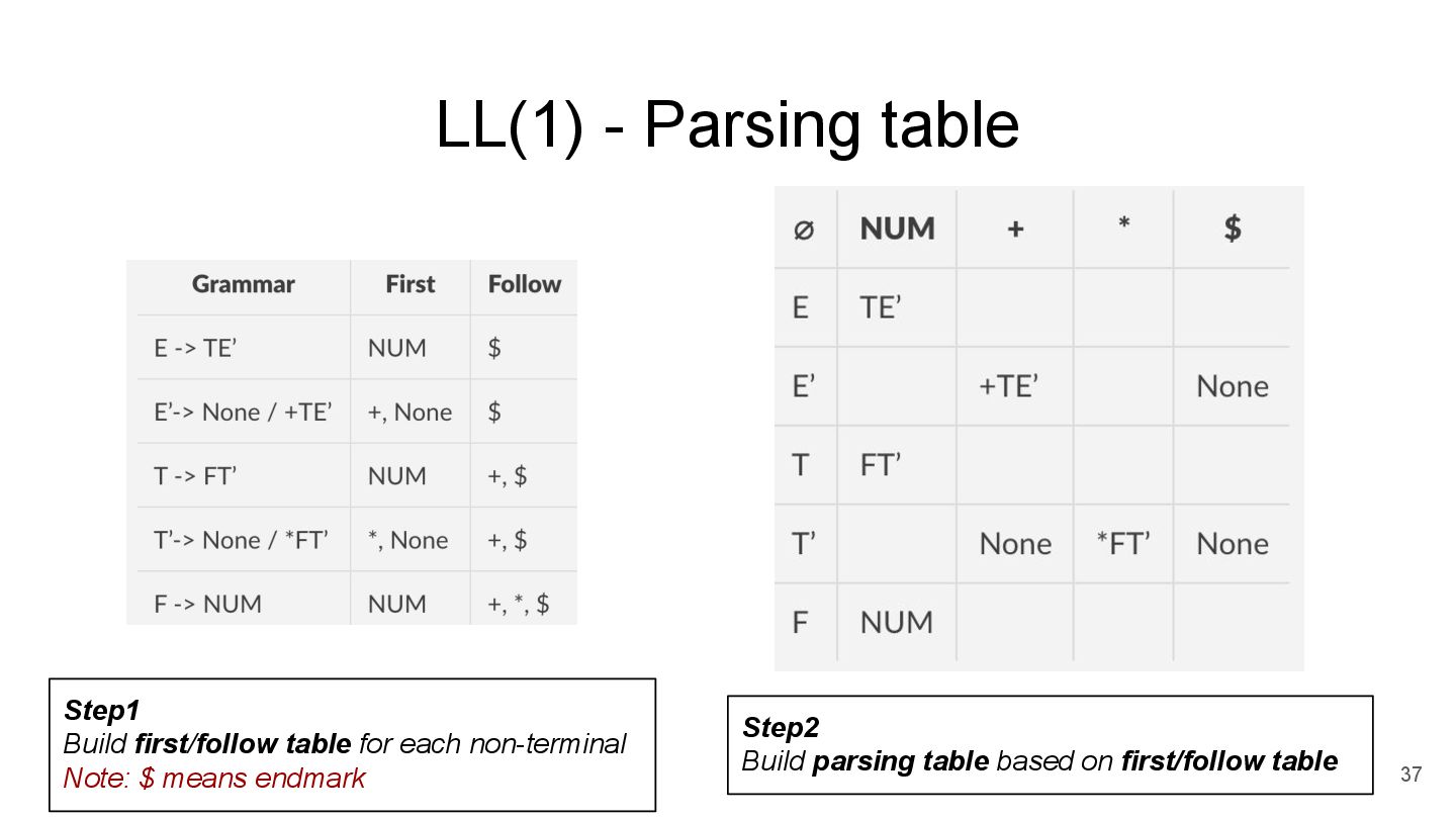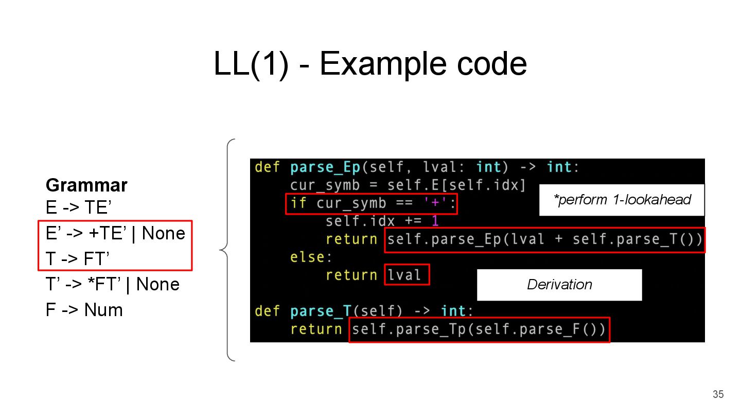 E -> TE’ E’ -> +TE’ | None T -> FT’ T’ -> *FT’ | None F -> Num parse_Tp(parse_F()) parse_Ep( ) Step3 *recursively parse the input string started from first rule parse_E() Step2 *parse from left to right *perform k-lookahead parse_T() Step1 write function for each non-terminal