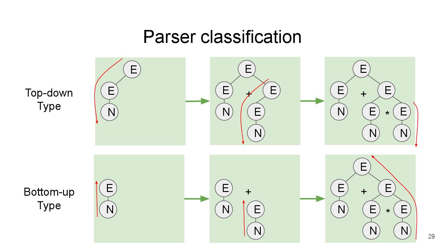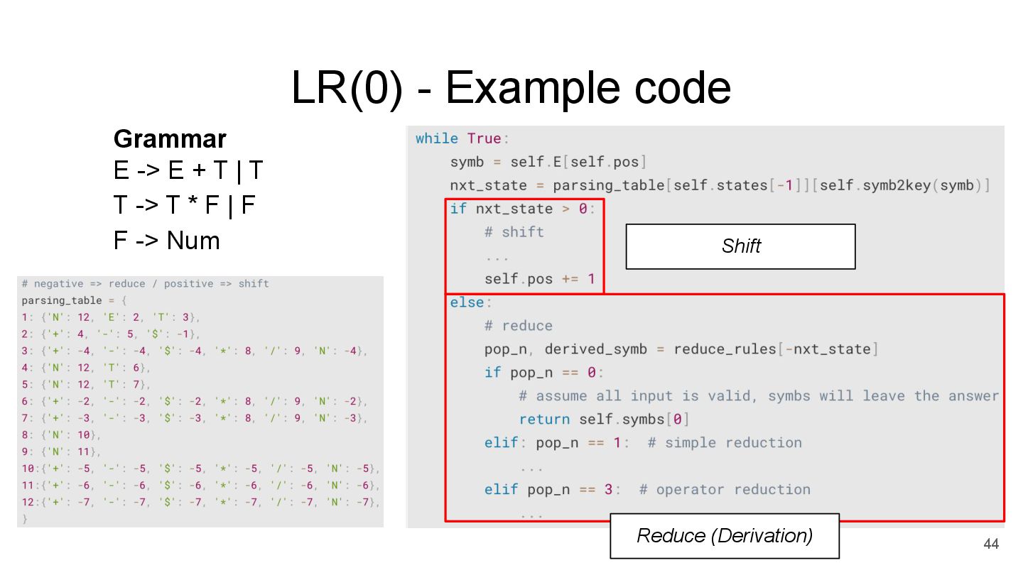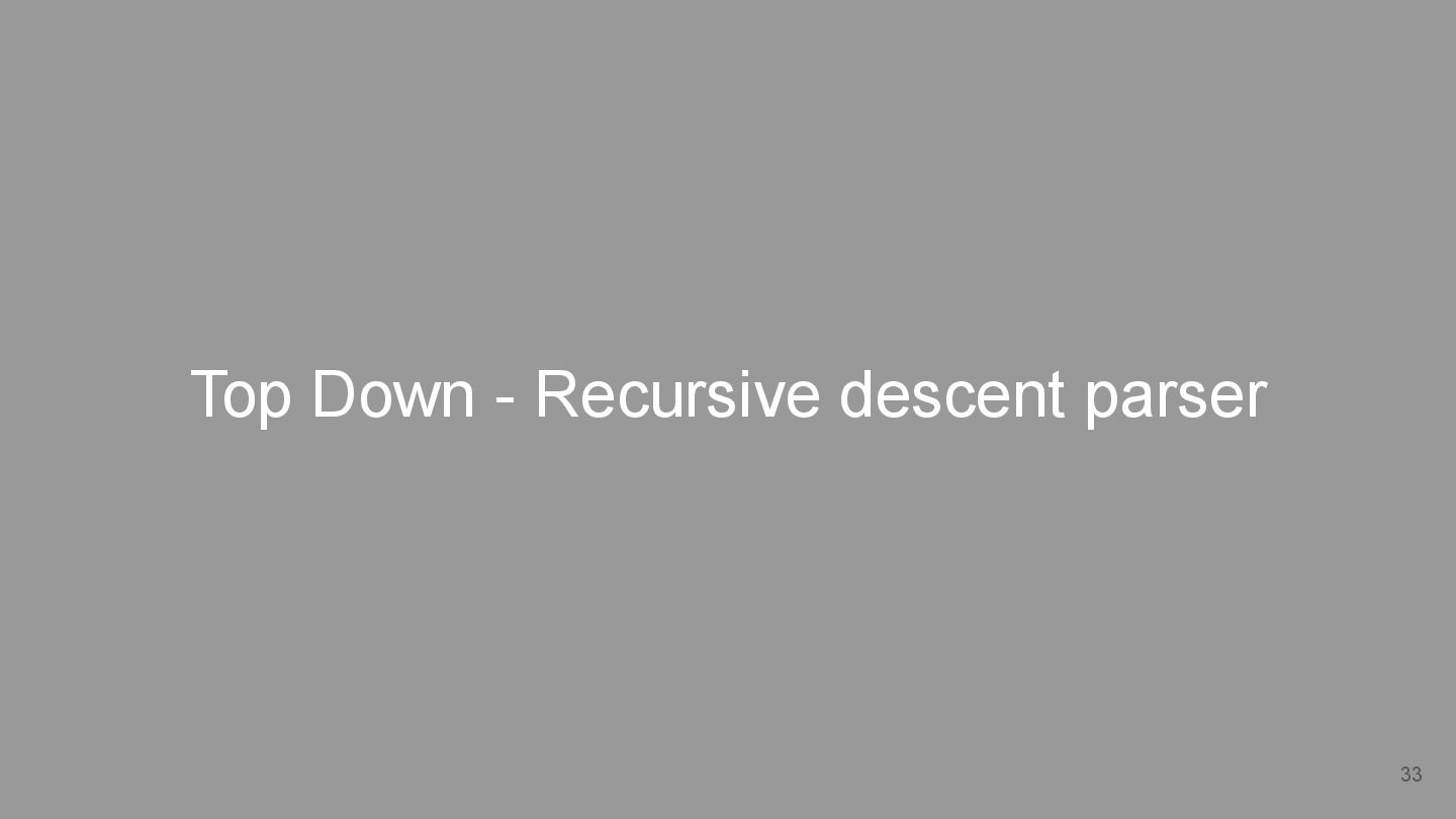 E -> TE’ E’ -> +TE’ | None T -> FT’ T’ -> *FT’ | None F -> Num parse_Tp(parse_F()) parse_Ep( ) Step3 *recursively parse the input string started from first rule parse_E() Step2 *parse from left to right *perform k-lookahead parse_T() Step1 write function for each non-terminal