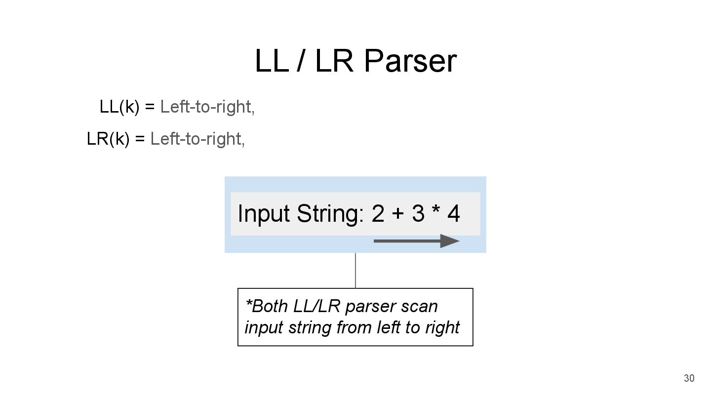 lookahead (k>0) LR(k) = Left-to-right, Rightmost derivation, k-token lookahead (k>=0) 32 Input String: 2 + 3 * 4 I am "a token of number". If I perform 1-token lookahead and meet "a token of +", what to do next?