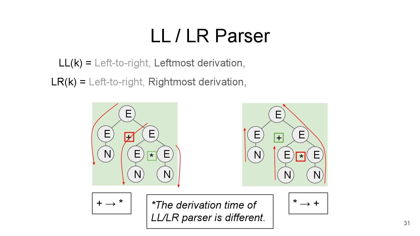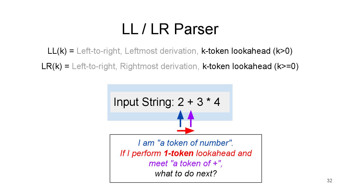lookahead (k>0) LR(k) = Left-to-right, Rightmost derivation, k-token lookahead (k>=0) 31 *The derivation time of LL/LR parser is different. N E E N N E E E * + N E E N N E E E * + + → * * → +