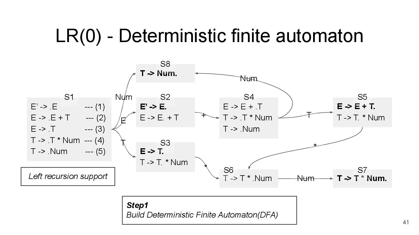 (1) E -> .E + T --- (2) E -> .T --- (3) T -> .T * Num --- (4) T -> .Num --- (5) Step1 Build Deterministic Finite Automaton(DFA) E’ -> E. E -> E. + T E -> T. T -> T. * Num T -> Num. E -> E + .T T -> .T * Num T -> .Num T -> T * .Num E -> E + T. T -> T. * Num T -> T * Num. E T Num * + T Num * Num S1 S2 S3 S4 S5 S6 S7 S8 Left recursion support