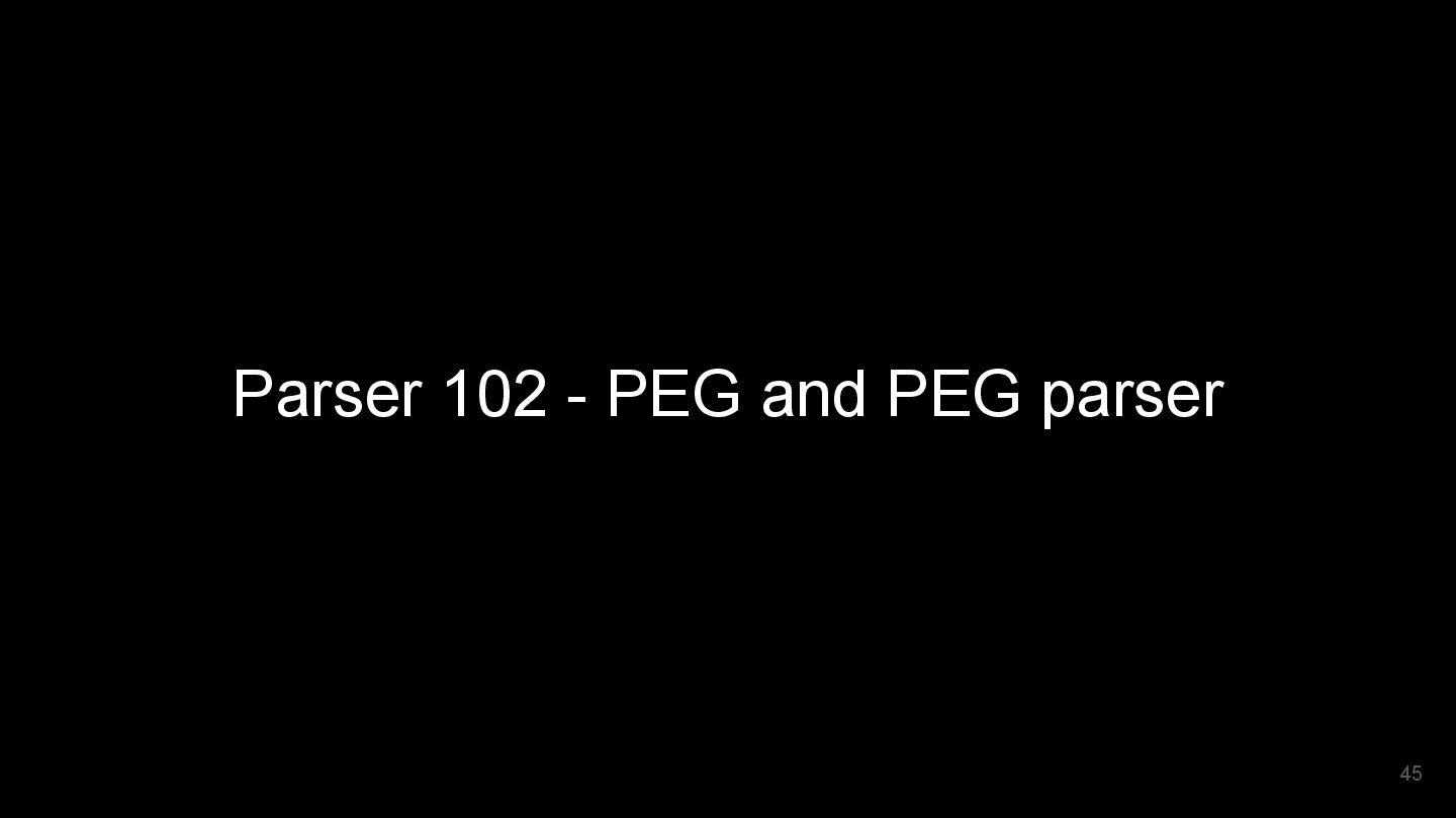 PEG parser can be a Packrat parser, or other traditional parser with k-lookahead limitation. Mostly, PEG parser means Packrat parser. 48 CFG EBNF grammar PEG Packrat parser Traditional parser PEG Parser