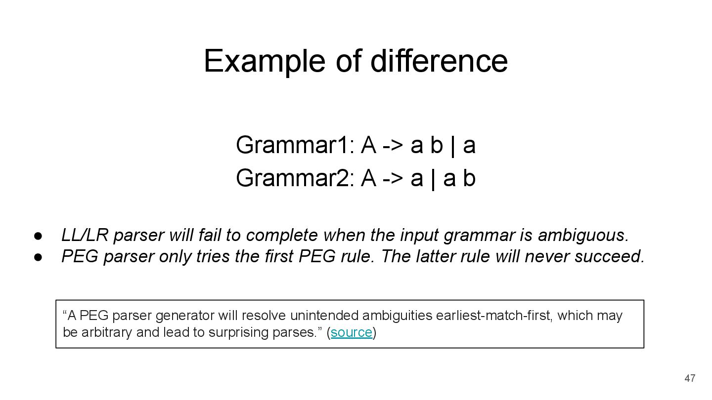 a Grammar2: A -> a | a b • LL/LR parser will fail to complete when the input grammar is ambiguous. • PEG parser only tries the first PEG rule. The latter rule will never succeed. “A PEG parser generator will resolve unintended ambiguities earliest-match-first, which may be arbitrary and lead to surprising parses.” (source)