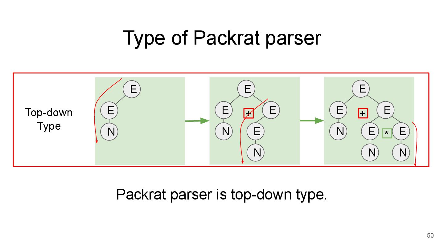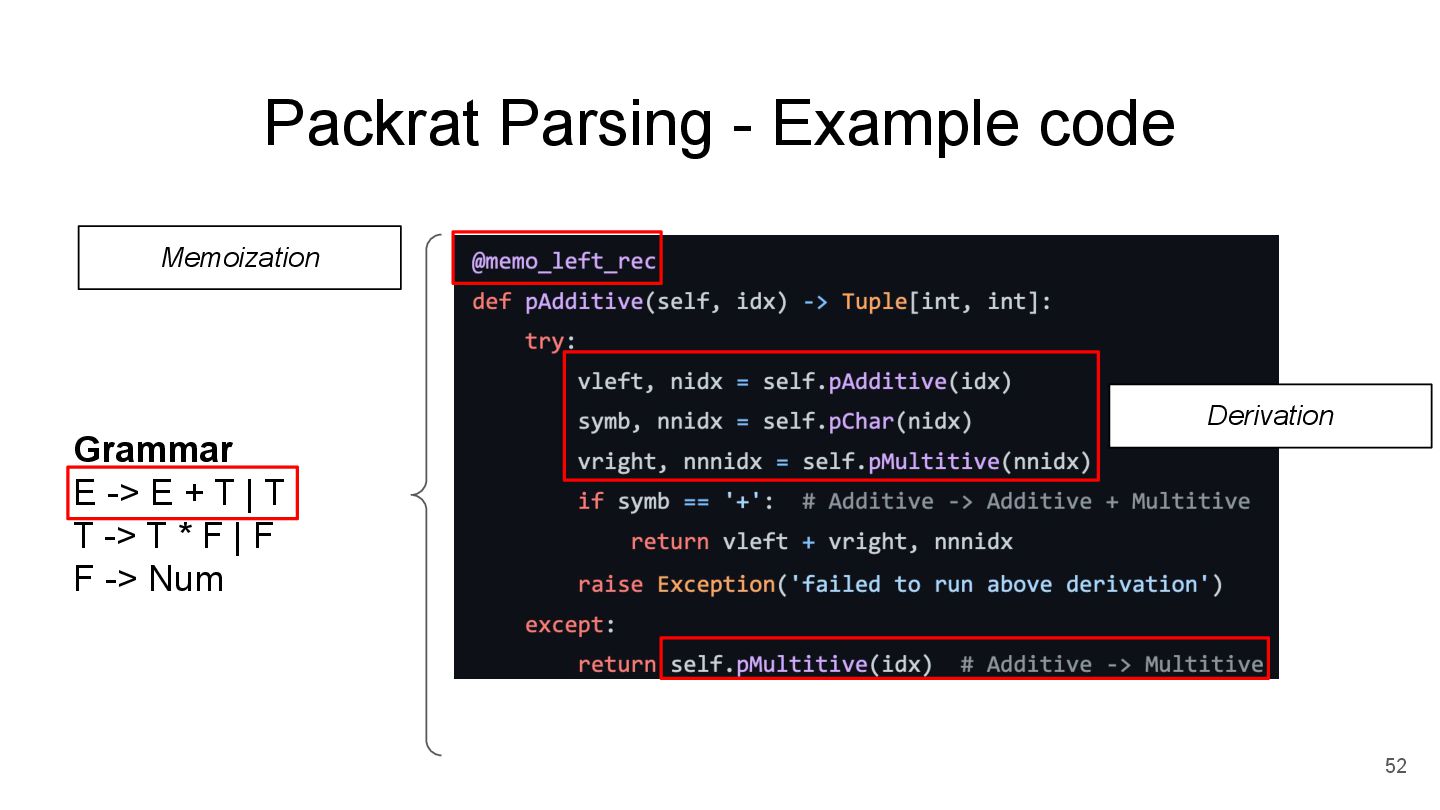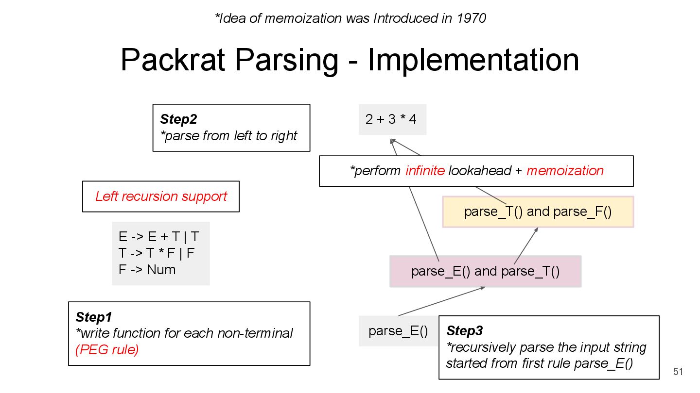 parse_E() E -> E + T | T T -> T * F | F F -> Num parse_T() and parse_F() parse_E() and parse_T() Step2 *parse from left to right *perform infinite lookahead + memoization Step1 *write function for each non-terminal (PEG rule) *Idea of memoization was Introduced in 1970 Step3 *recursively parse the input string started from first rule parse_E() Left recursion support