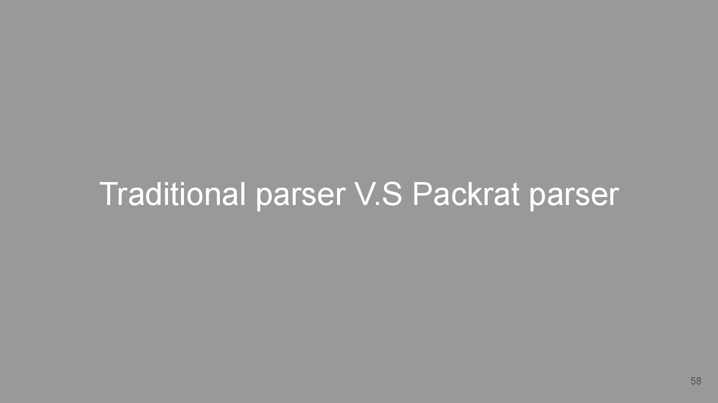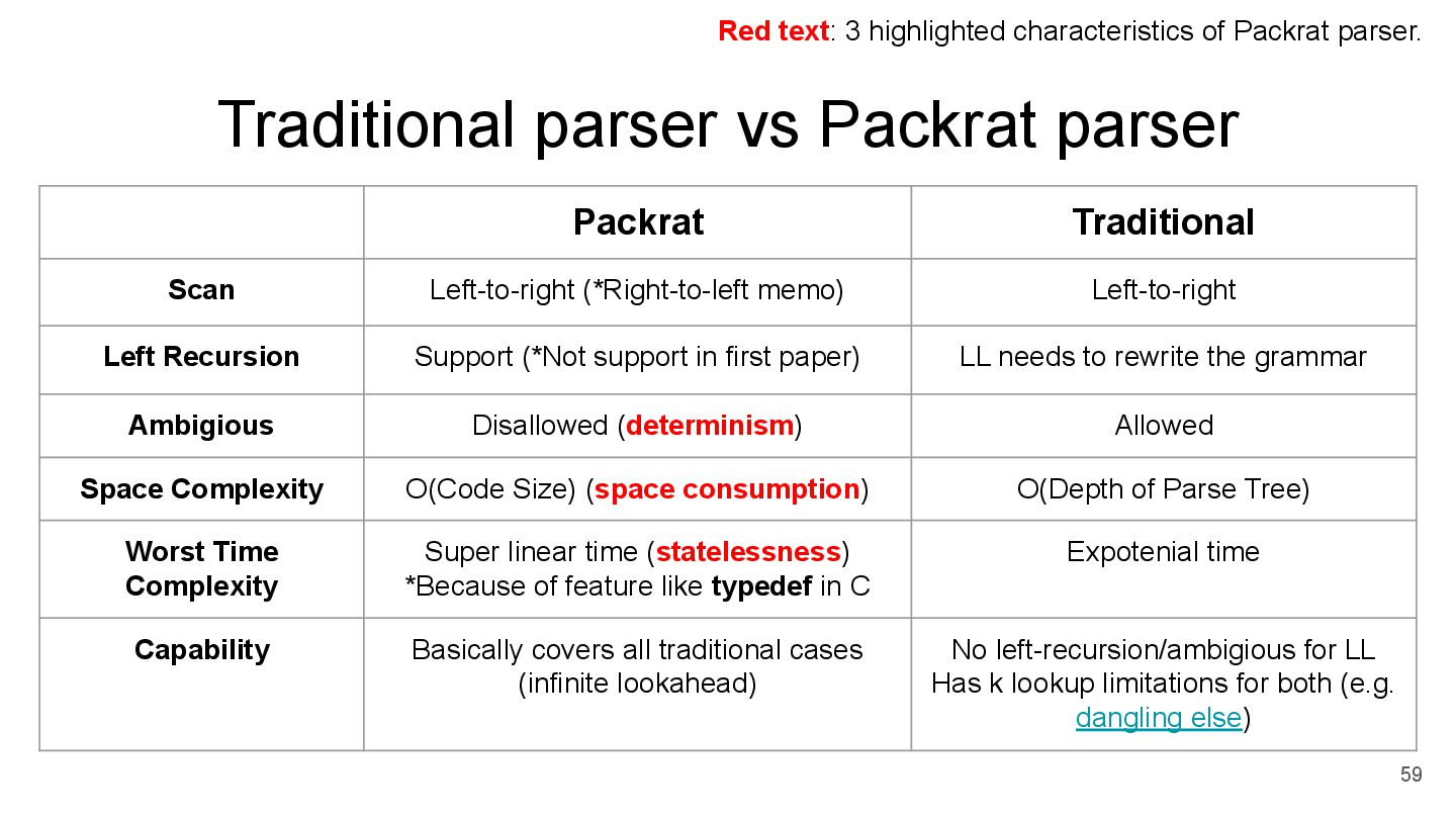 (*Right-to-left memo) Left-to-right Left Recursion Support (*Not support in first paper) LL needs to rewrite the grammar Ambigious Disallowed (determinism) Allowed Space Complexity O(Code Size) (space consumption) O(Depth of Parse Tree) Worst Time Complexity Super linear time (statelessness) *Because of feature like typedef in C Expotenial time Capability Basically covers all traditional cases (infinite lookahead) No left-recursion/ambigious for LL Has k lookup limitations for both (e.g. dangling else) Red text: 3 highlighted characteristics of Packrat parser.