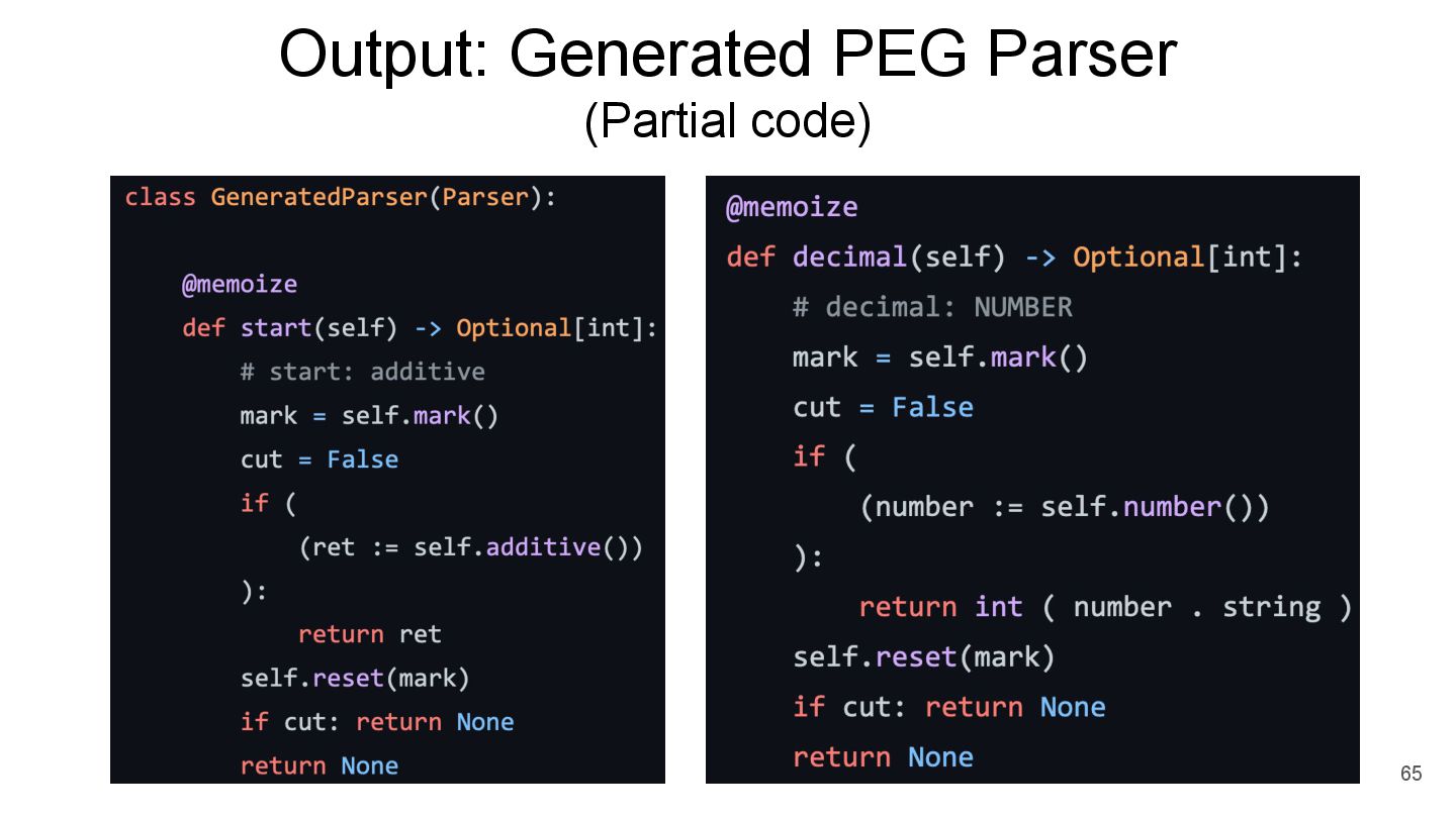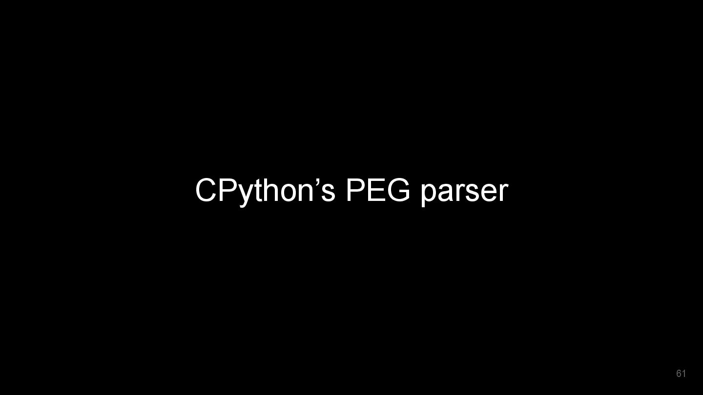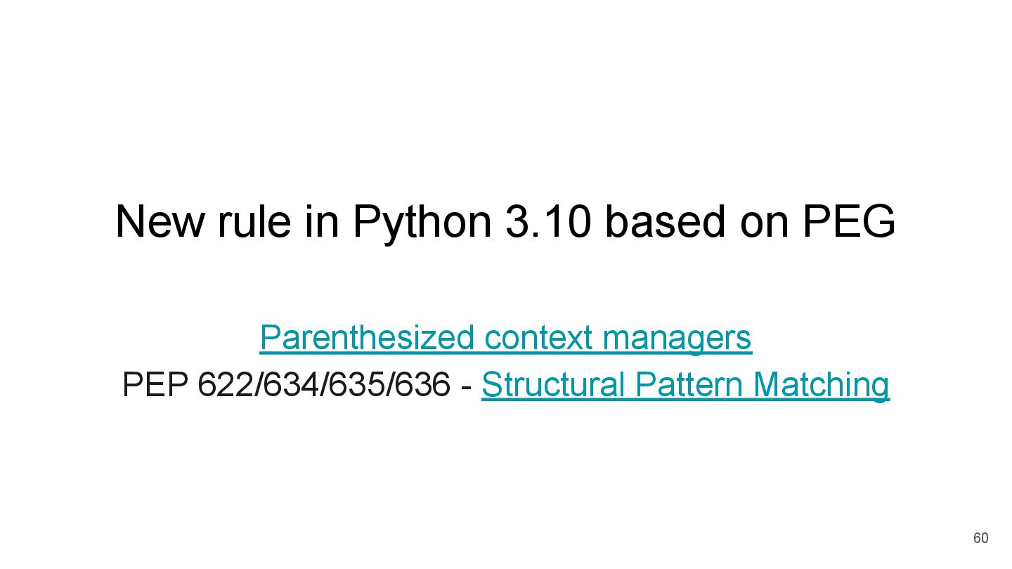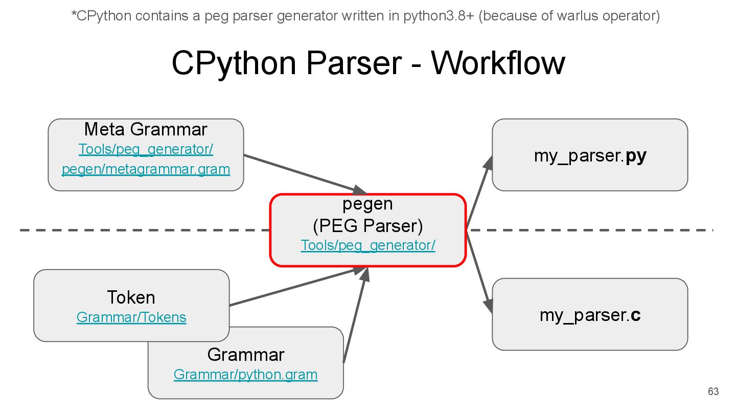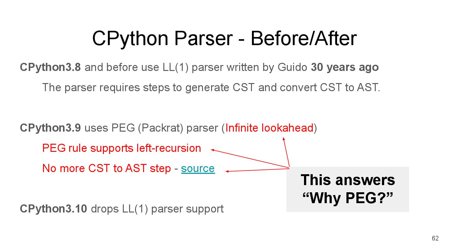 written by Guido 30 years ago The parser requires steps to generate CST and convert CST to AST. CPython3.9 uses PEG (Packrat) parser (Infinite lookahead) PEG rule supports left-recursion No more CST to AST step - source CPython3.10 drops LL(1) parser support 62 This answers “Why PEG?”