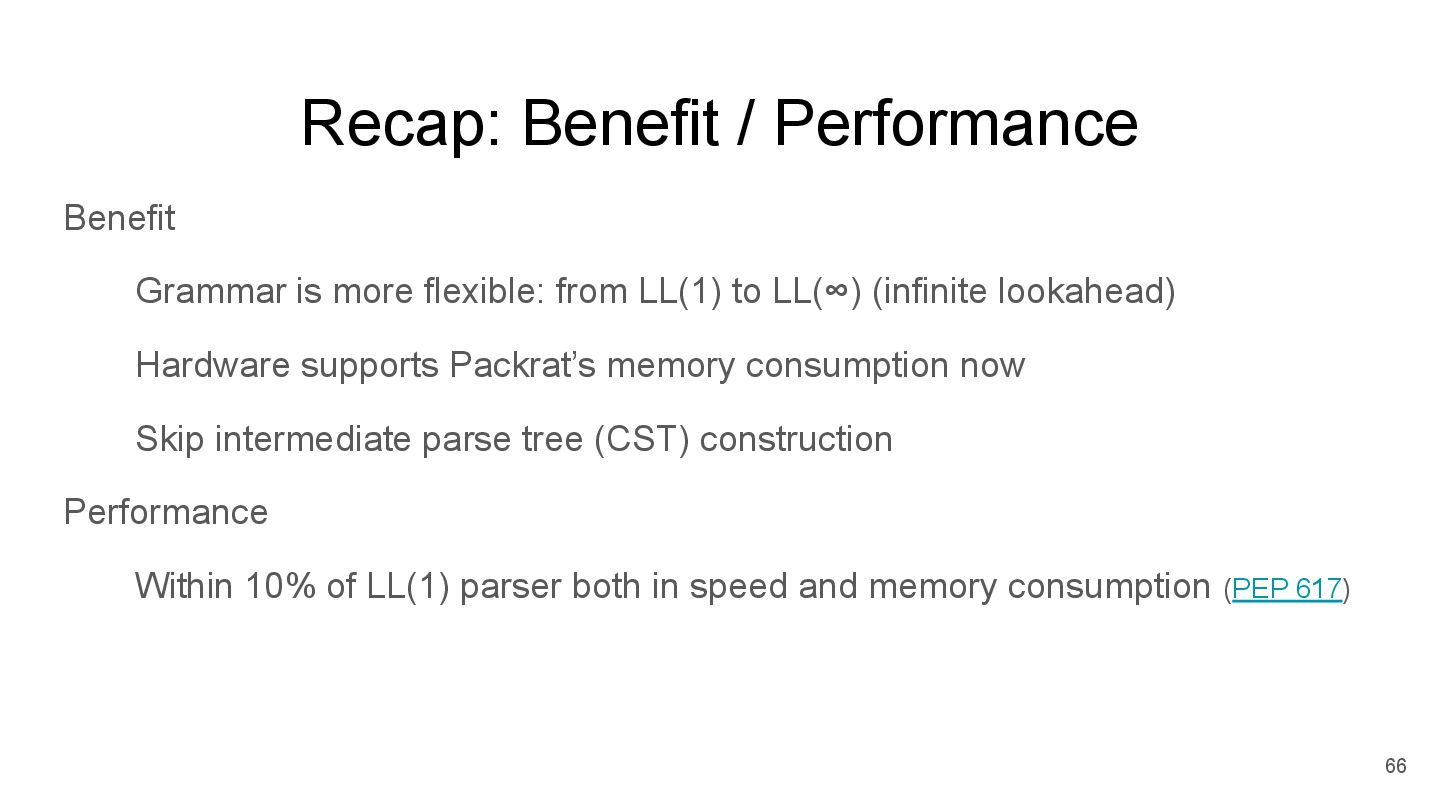 LL(1) to LL(∞) (infinite lookahead) Hardware supports Packrat’s memory consumption now Skip intermediate parse tree (CST) construction Performance Within 10% of LL(1) parser both in speed and memory consumption (PEP 617) 66