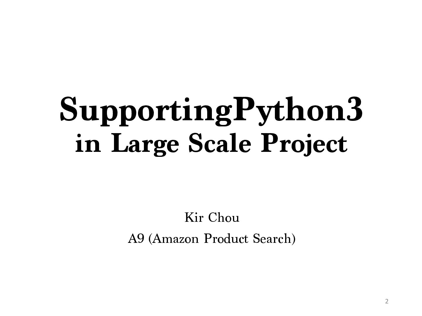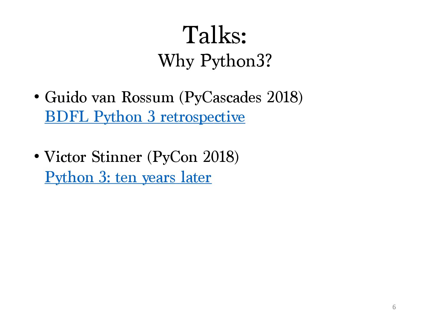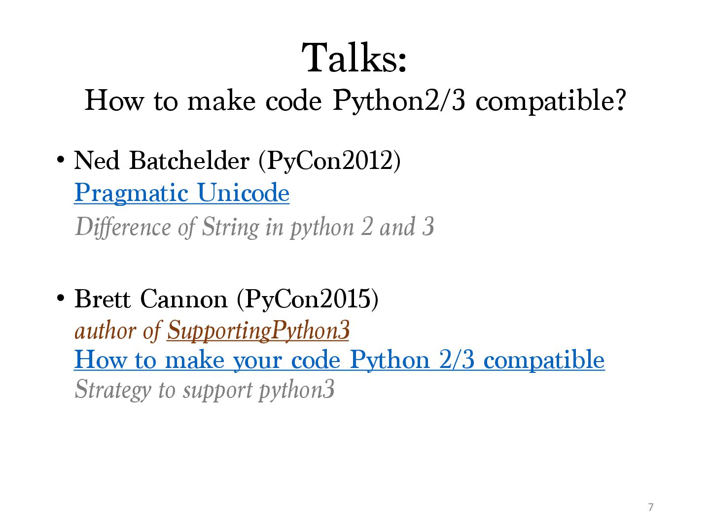 (PyCon2012) Pragmatic Unicode Difference of String in python 2 and 3 • Brett Cannon (PyCon2015) author of SupportingPython3 How to make your code Python 2/3 compatible Strategy to support python3 7