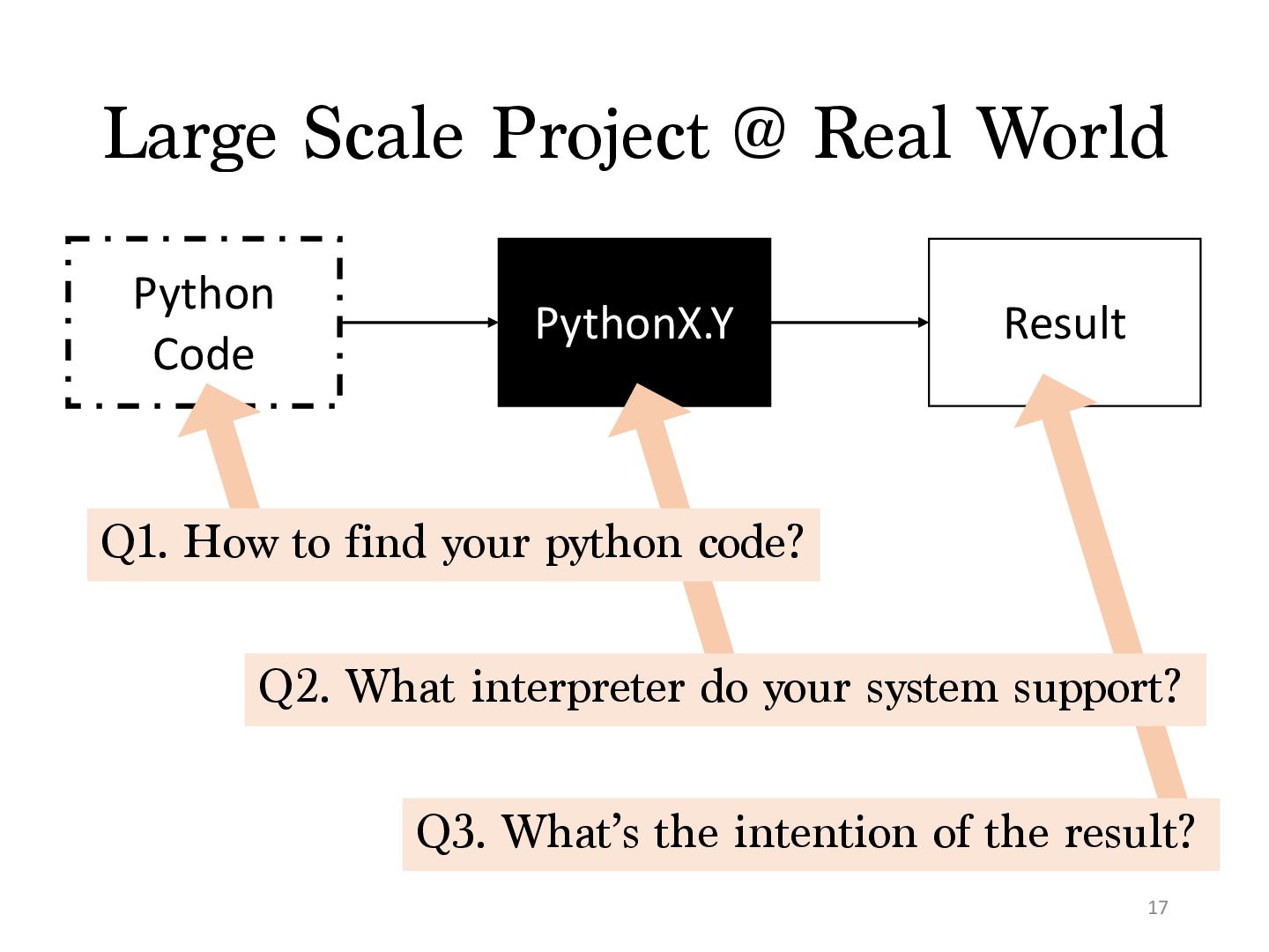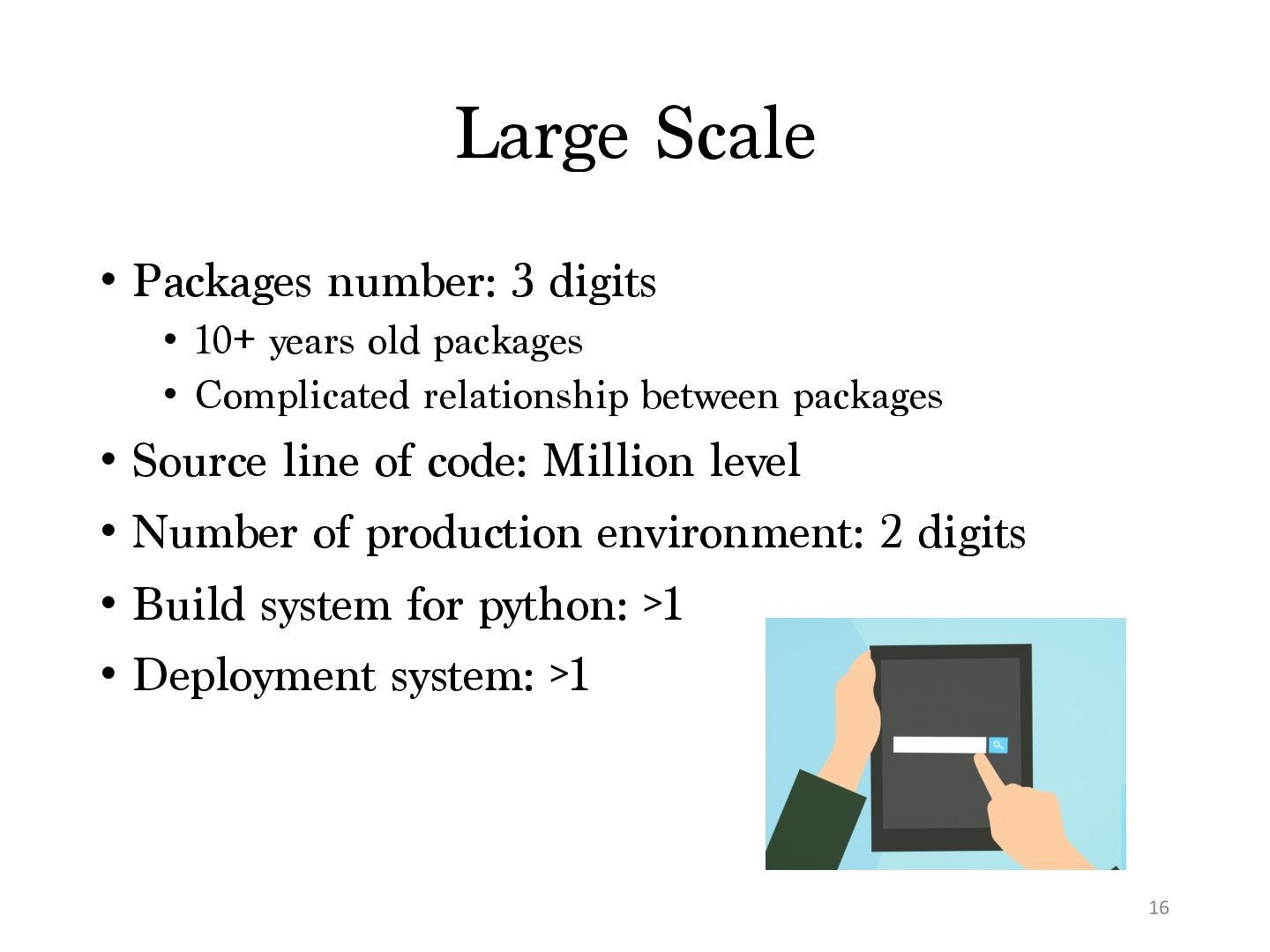 old packages • Complicated relationship between packages • Source line of code: Million level • Number of production environment: 2 digits • Build system for python: >1 • Deployment system: >1 16