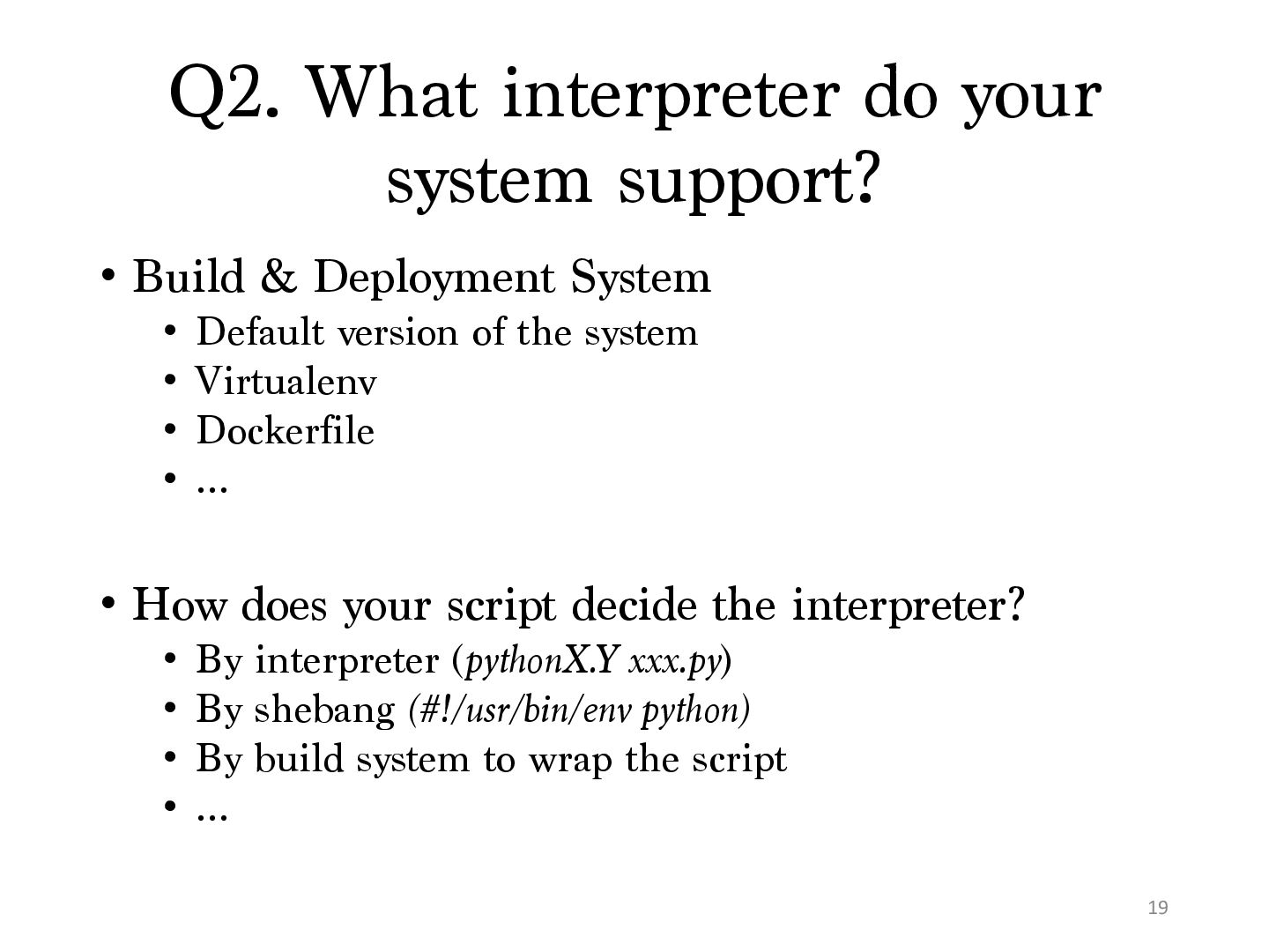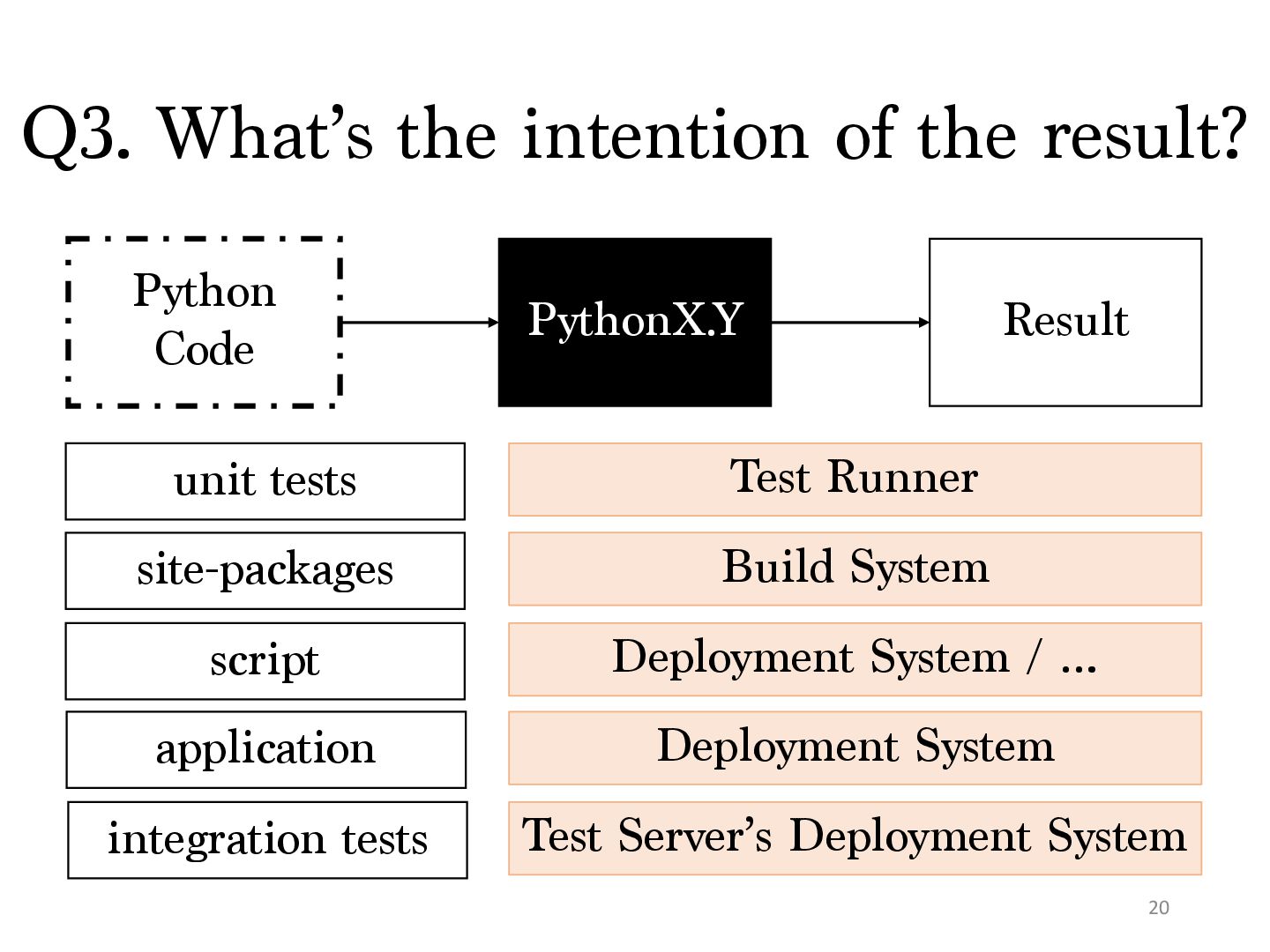 Deployment System • Default version of the system • Virtualenv • Dockerfile • … • How does your script decide the interpreter? • By interpreter (pythonX.Y xxx.py) • By shebang (#!/usr/bin/env python) • By build system to wrap the script • … 19