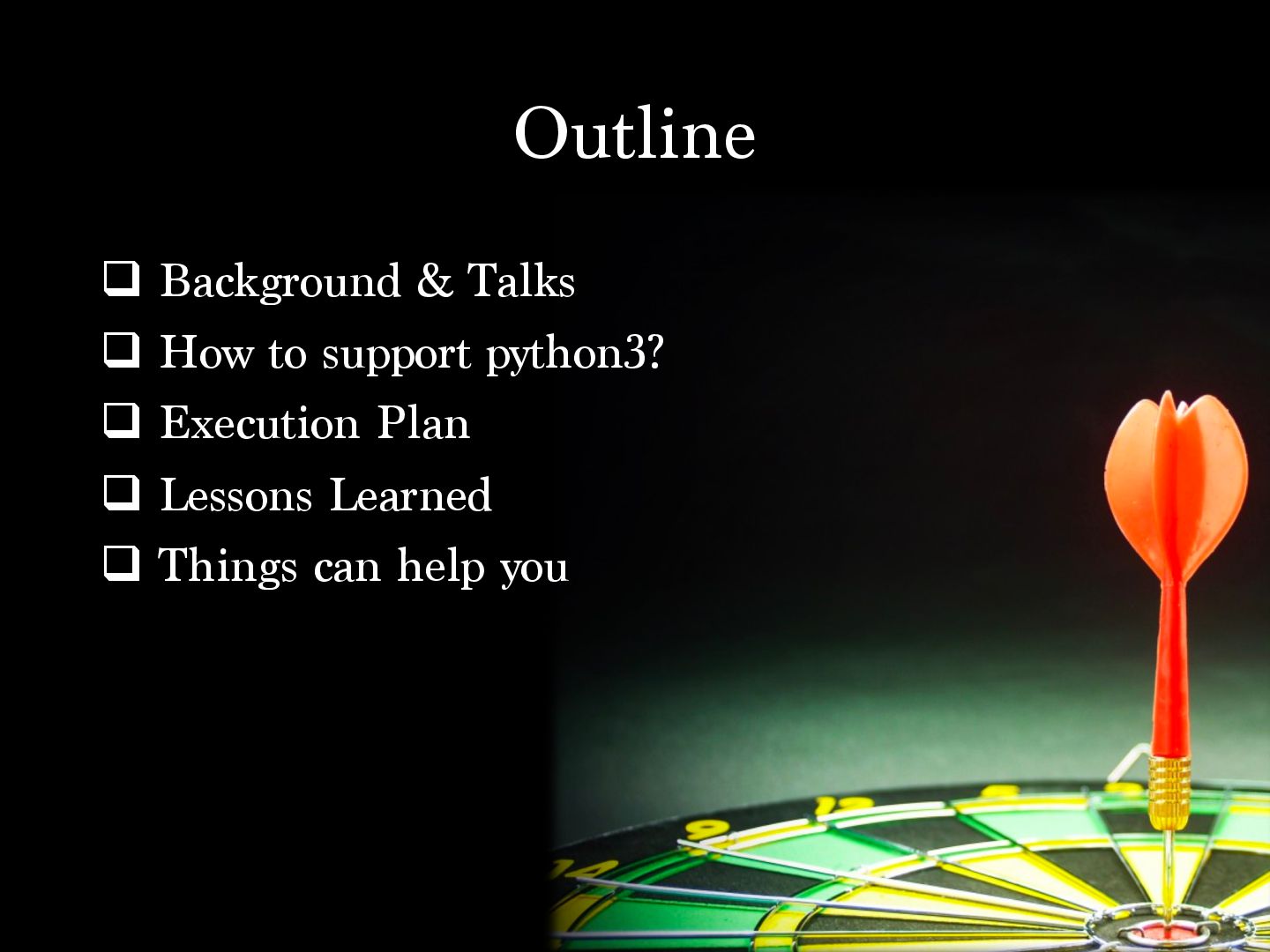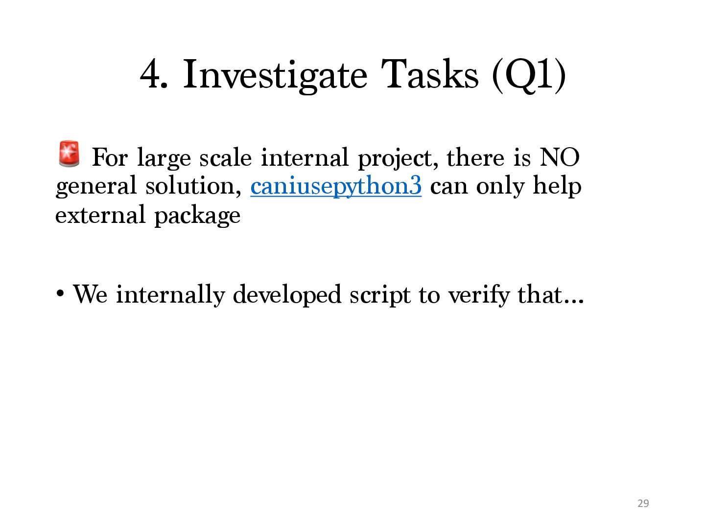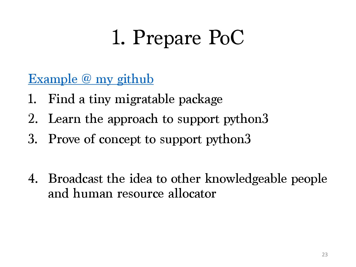 tiny migratable package 2. Learn the approach to support python3 3. Prove of concept to support python3 4. Broadcast the idea to other knowledgeable people and human resource allocator 23