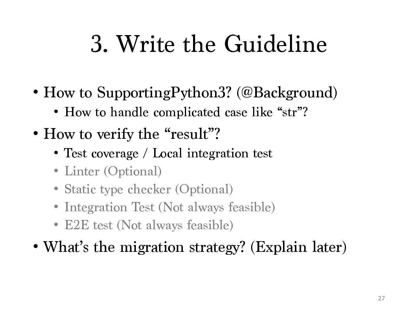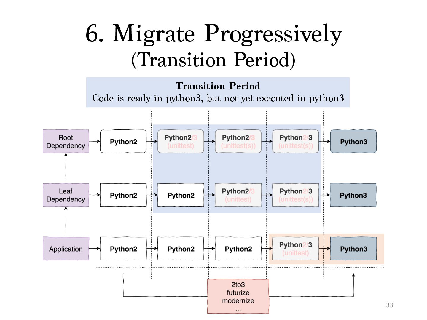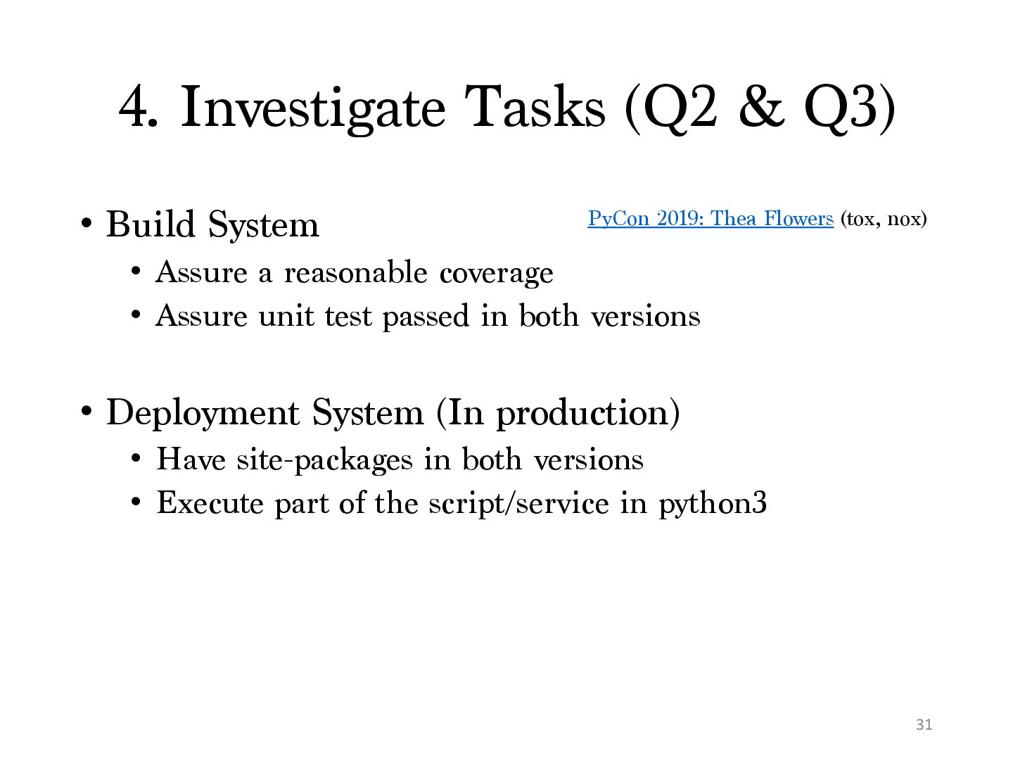 tiny migratable package 2. Learn the approach to support python3 3. Prove of concept to support python3 4. Broadcast the idea to other knowledgeable people and human resource allocator 23