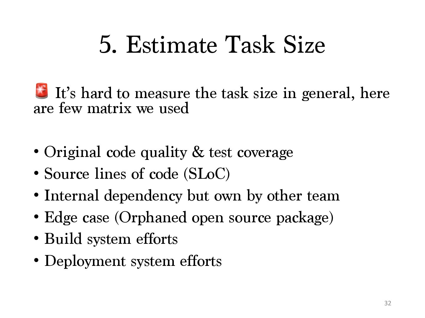 task size in general, here are few matrix we used • Original code quality & test coverage • Source lines of code (SLoC) • Internal dependency but own by other team • Edge case (Orphaned open source package) • Build system efforts • Deployment system efforts 32