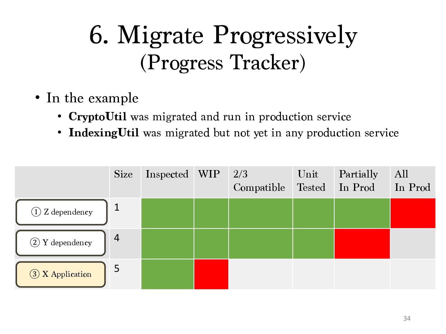 CryptoUtil was migrated and run in production service • IndexingUtil was migrated but not yet in any production service 34 Size Inspected WIP 2/3 Compatible Unit Tested Partially In Prod All In Prod 1 4 5 ② Y dependency ① Z dependency ③ X Application