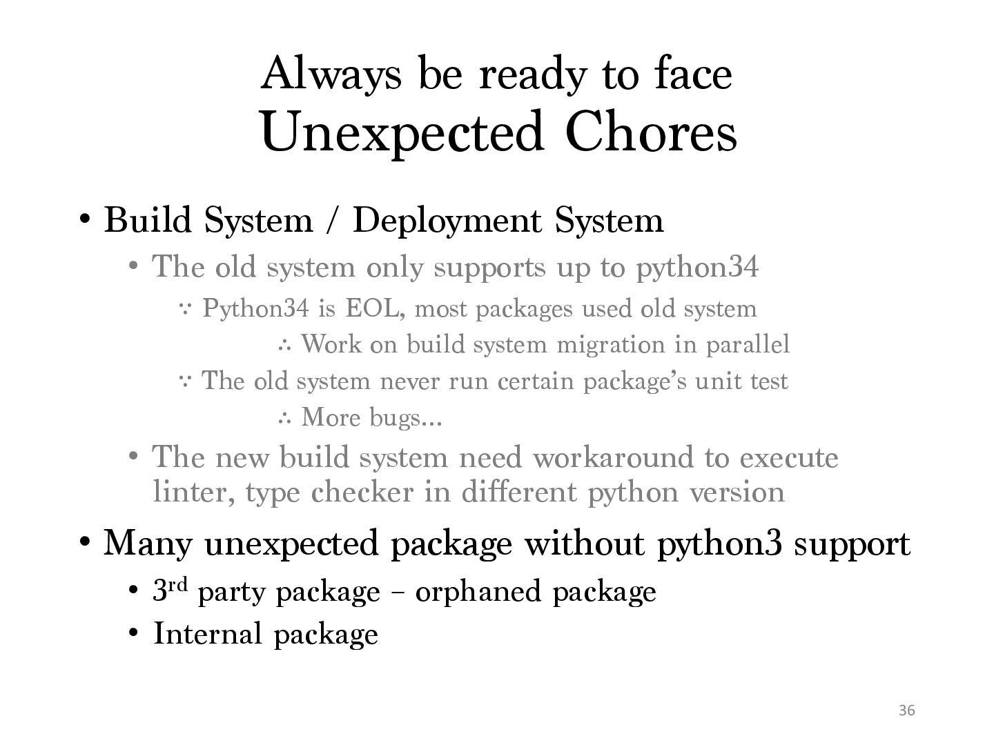 / Deployment System • The old system only supports up to python34 ∵ Python34 is EOL, most packages used old system ∴ Work on build system migration in parallel ∵ The old system never run certain package’s unit test ∴ More bugs… • The new build system need workaround to execute linter, type checker in different python version • Many unexpected package without python3 support • 3rd party package – orphaned package • Internal package 36