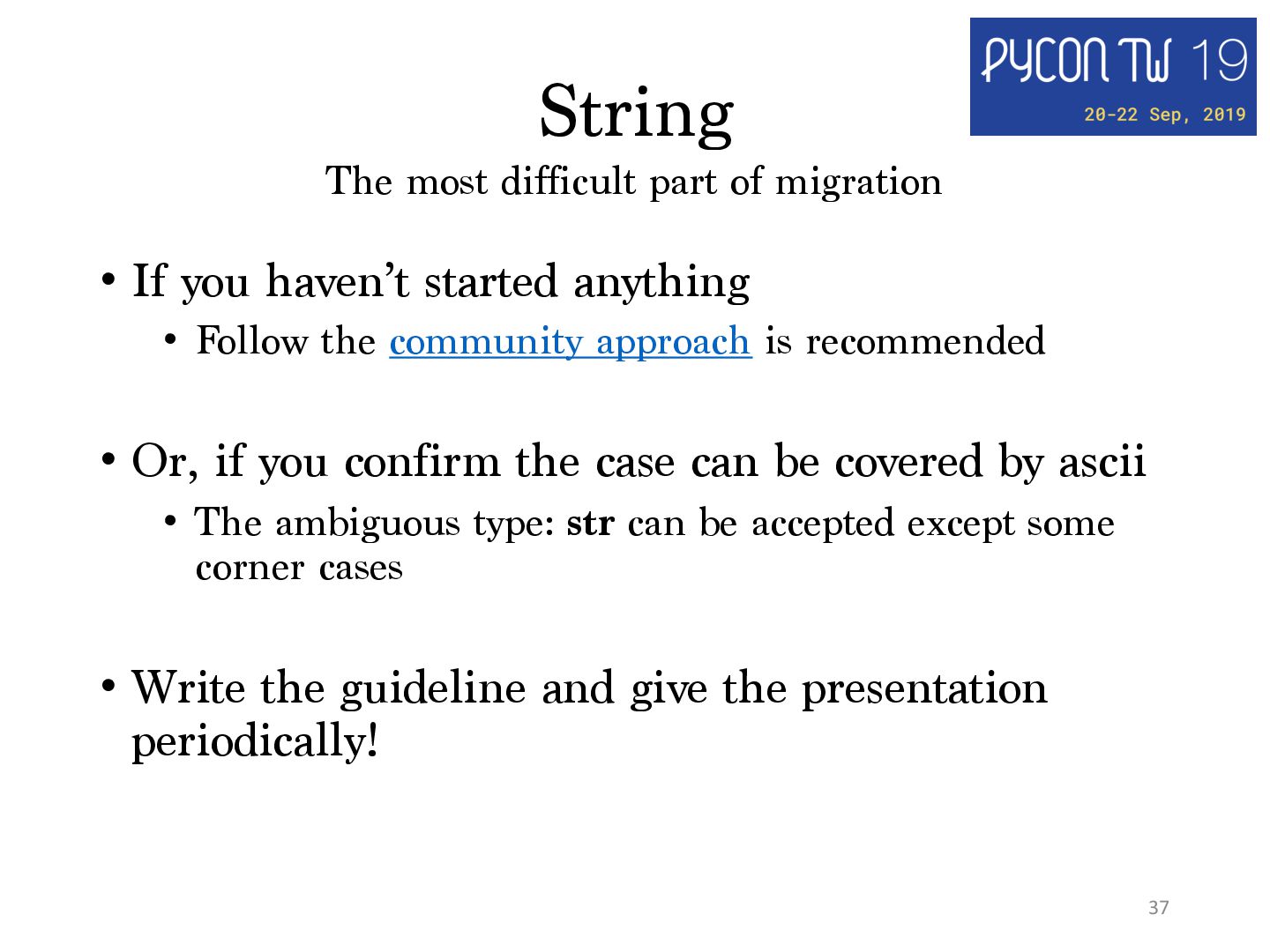 haven’t started anything • Follow the community approach is recommended • Or, if you confirm the case can be covered by ascii • The ambiguous type: str can be accepted except some corner cases • Write the guideline and give the presentation periodically! 37