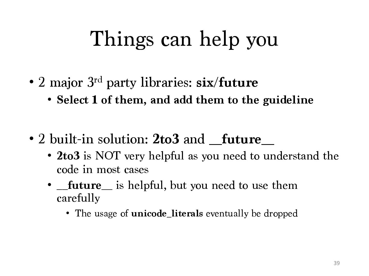 six/future • Select 1 of them, and add them to the guideline • 2 built-in solution: 2to3 and __future__ • 2to3 is NOT very helpful as you need to understand the code in most cases • __future__ is helpful, but you need to use them carefully • The usage of unicode_literals eventually be dropped 39
