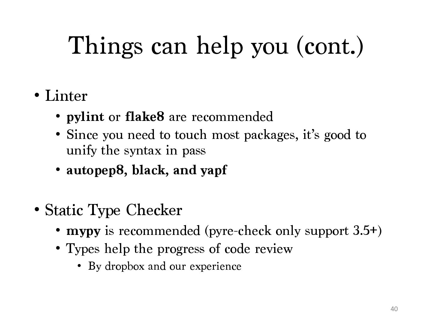 flake8 are recommended • Since you need to touch most packages, it’s good to unify the syntax in pass • autopep8, black, and yapf • Static Type Checker • mypy is recommended (pyre-check only support 3.5+) • Types help the progress of code review • By dropbox and our experience 40