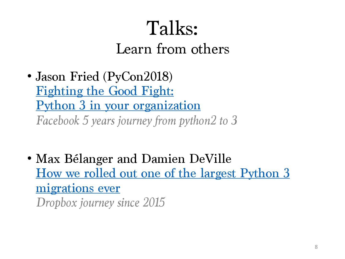 Good Fight: Python 3 in your organization Facebook 5 years journey from python2 to 3 • Max Bélanger and Damien DeVille How we rolled out one of the largest Python 3 migrations ever Dropbox journey since 2015 8
