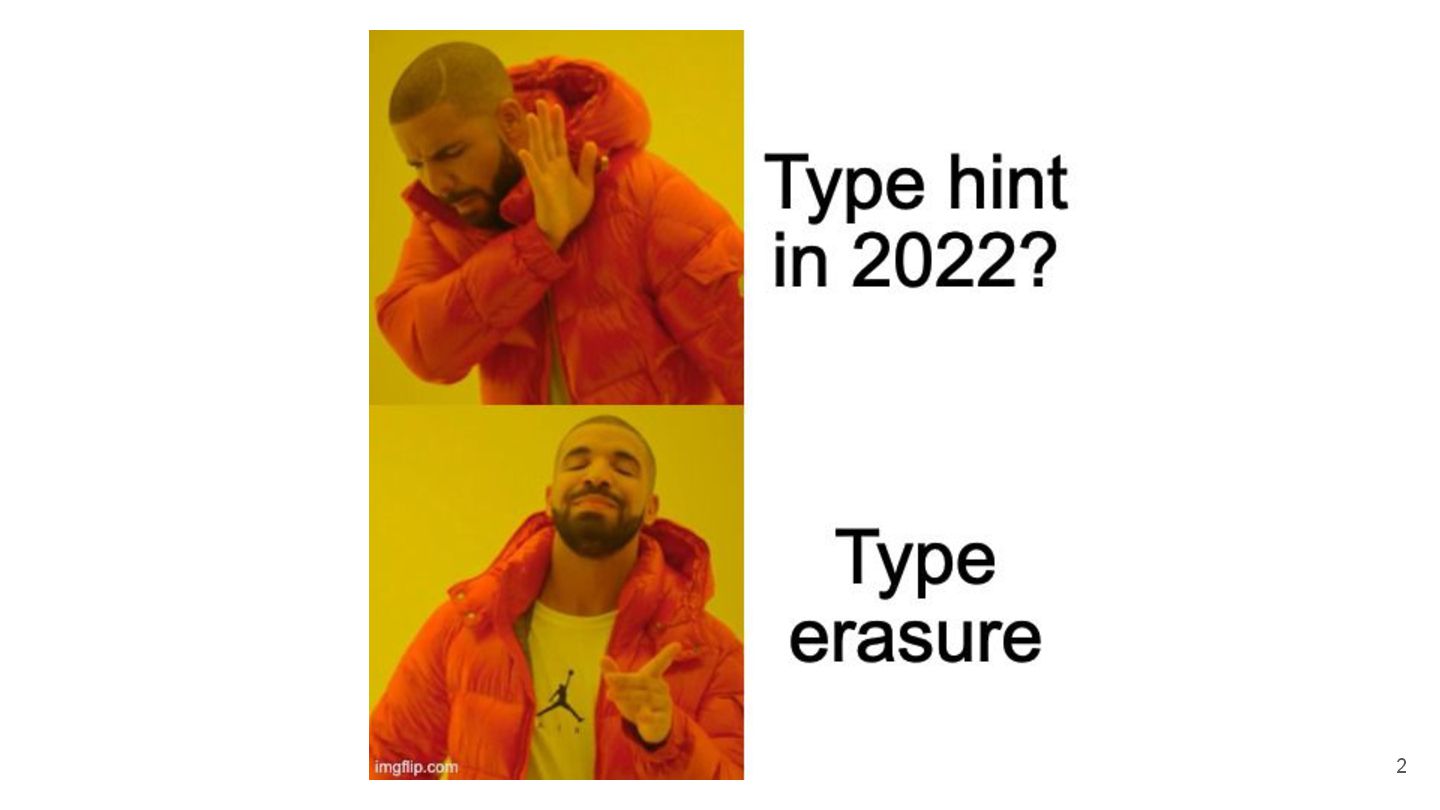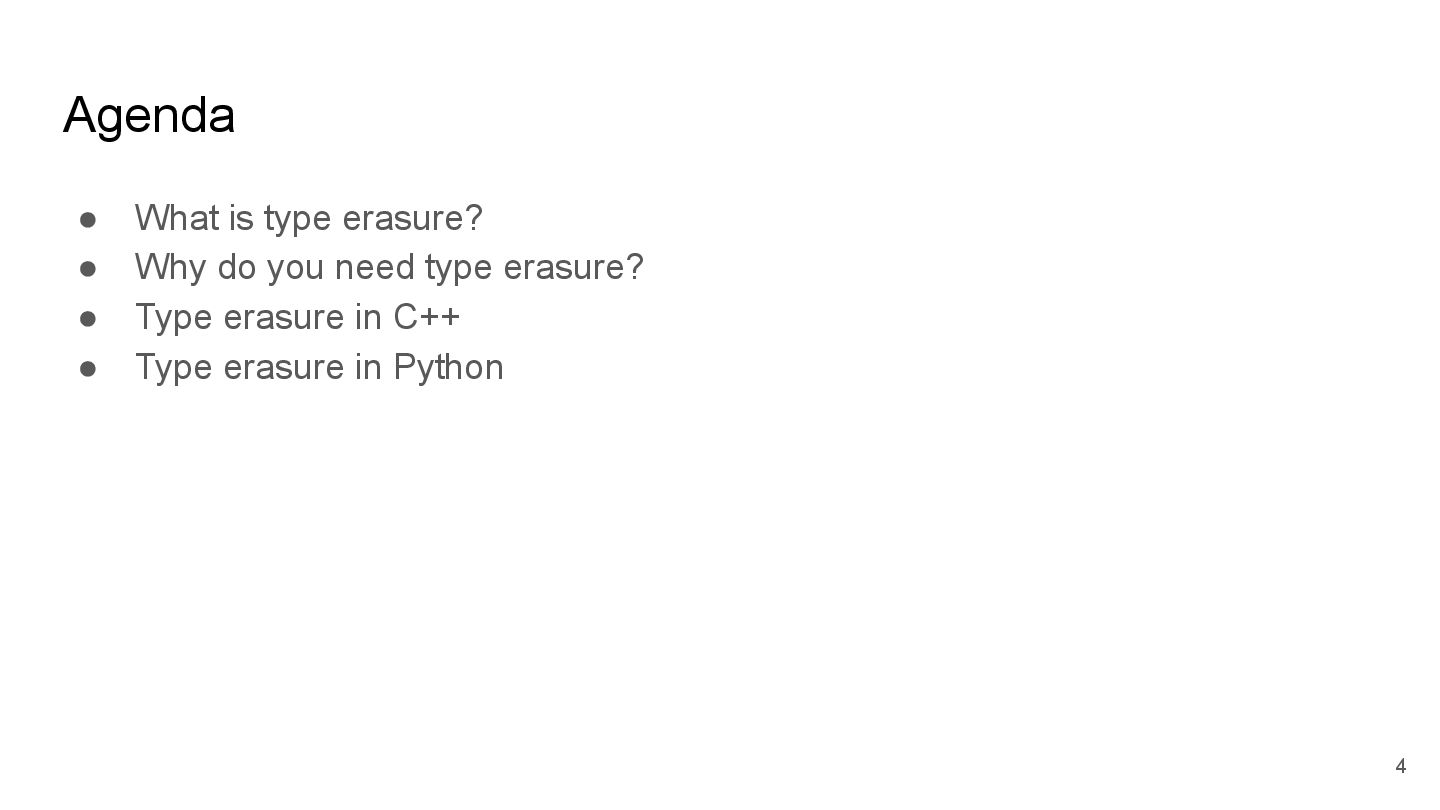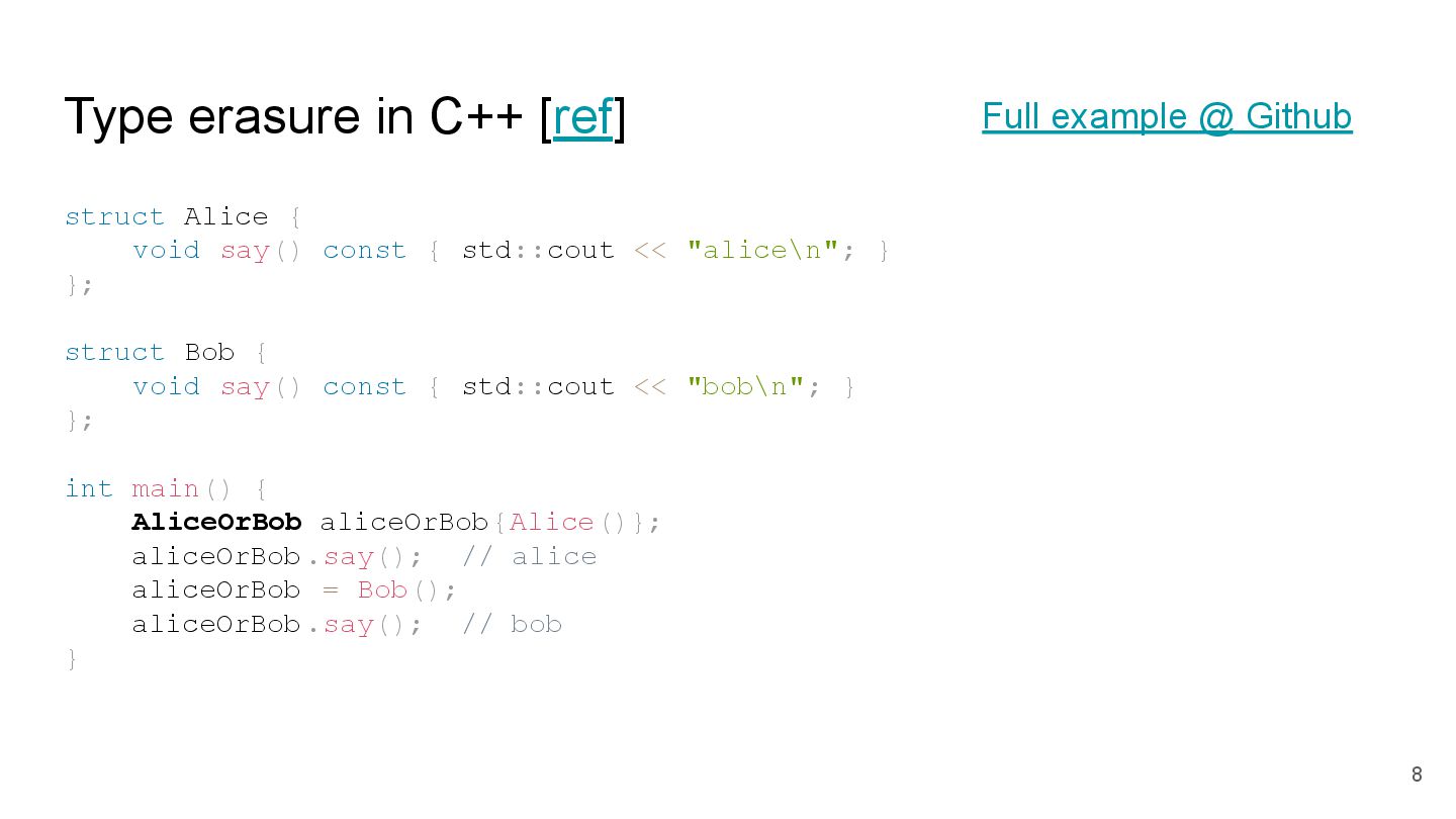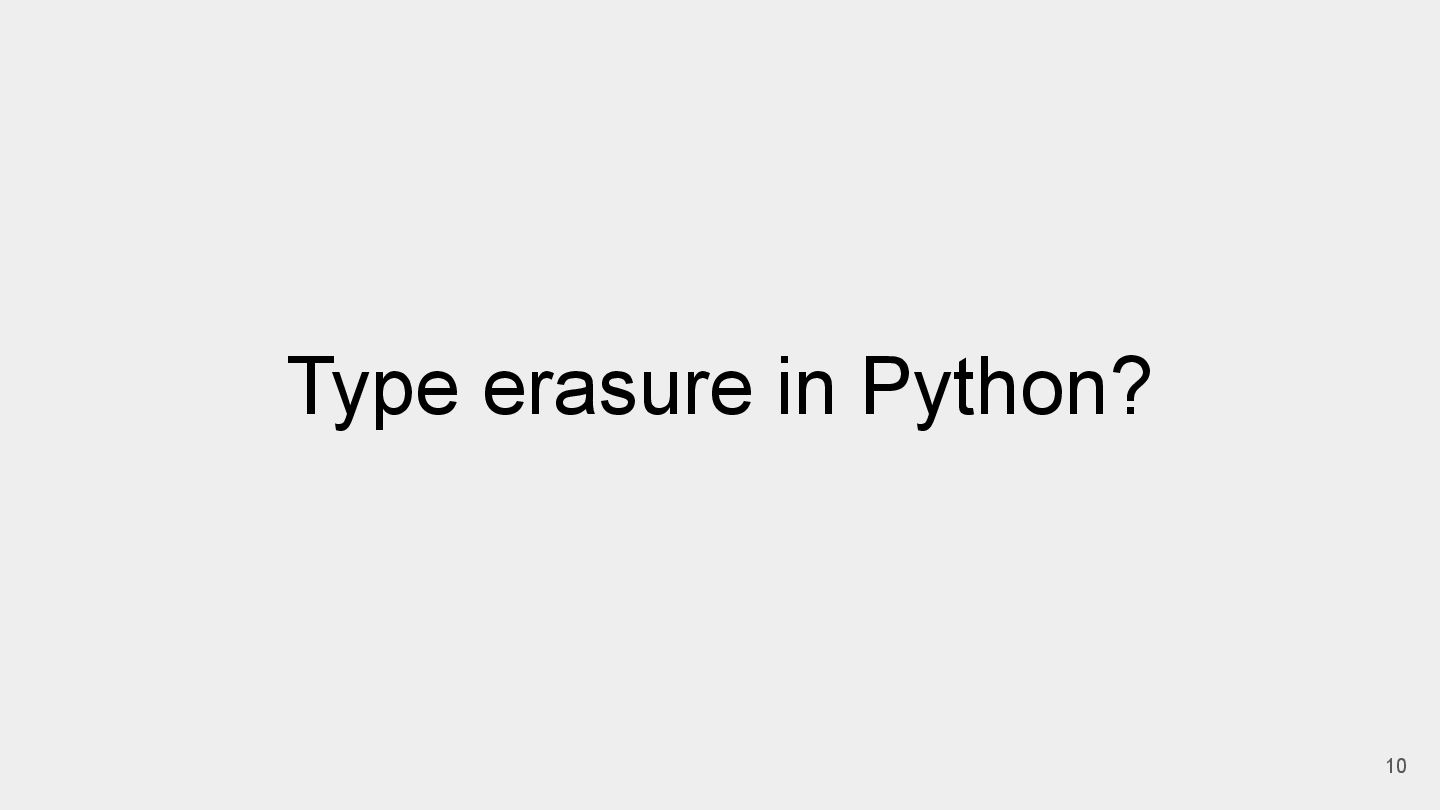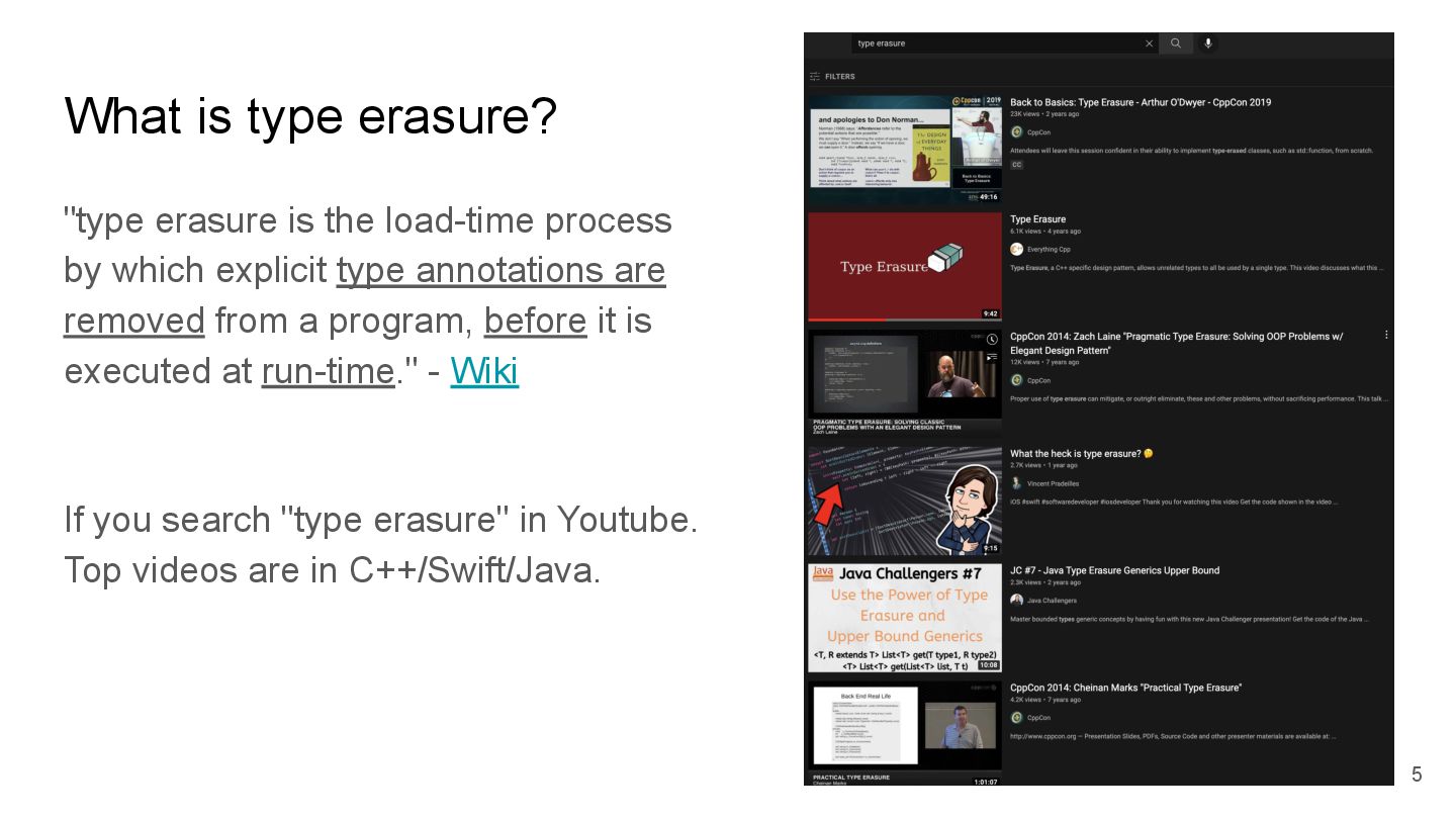 by which explicit type annotations are removed from a program, before it is executed at run-time." - Wiki If you search "type erasure" in Youtube. Top videos are in C++/Swift/Java. 5