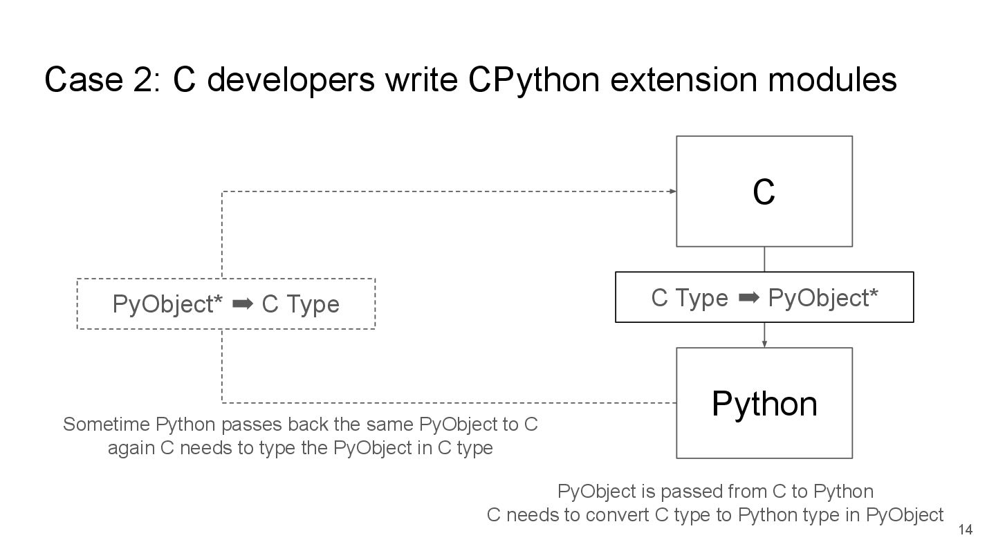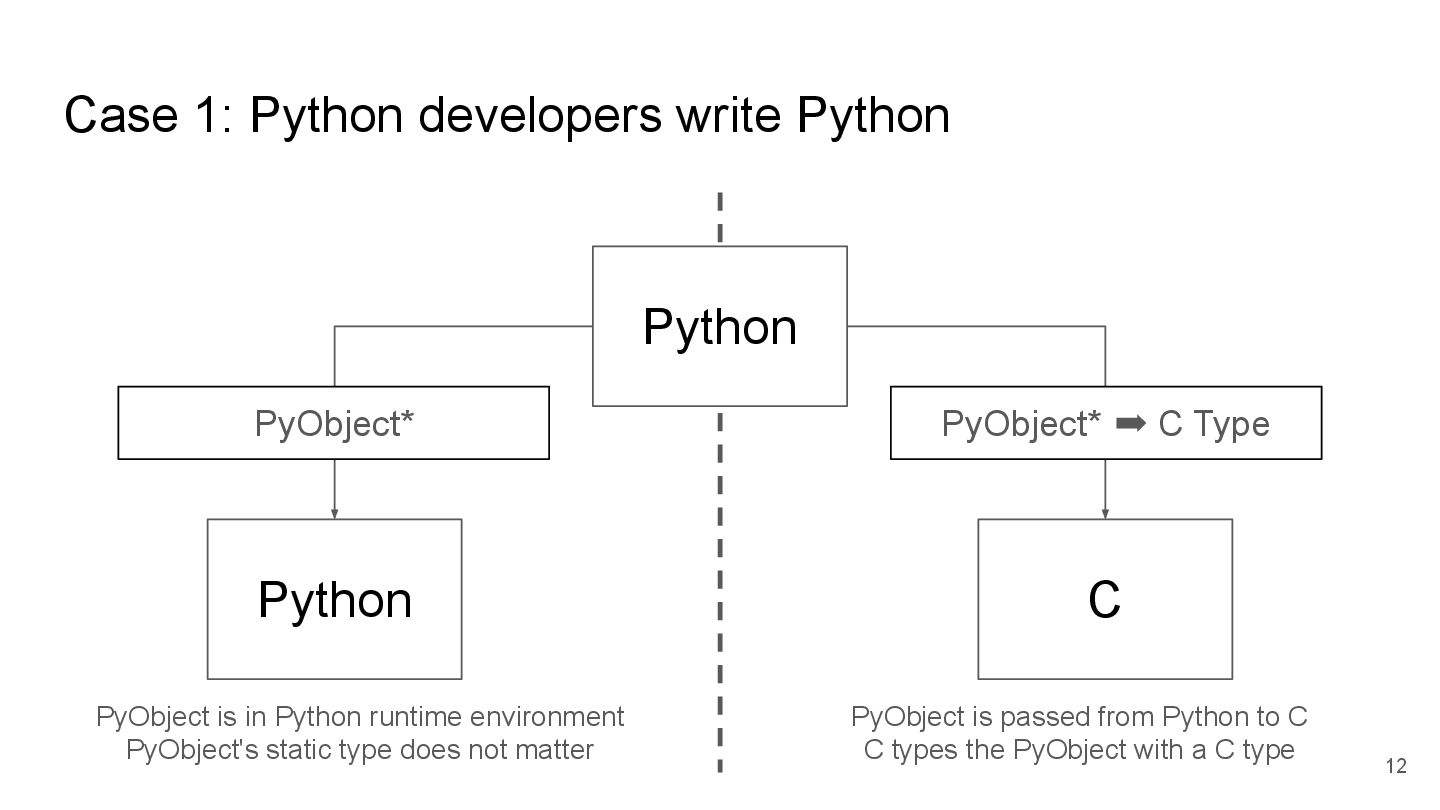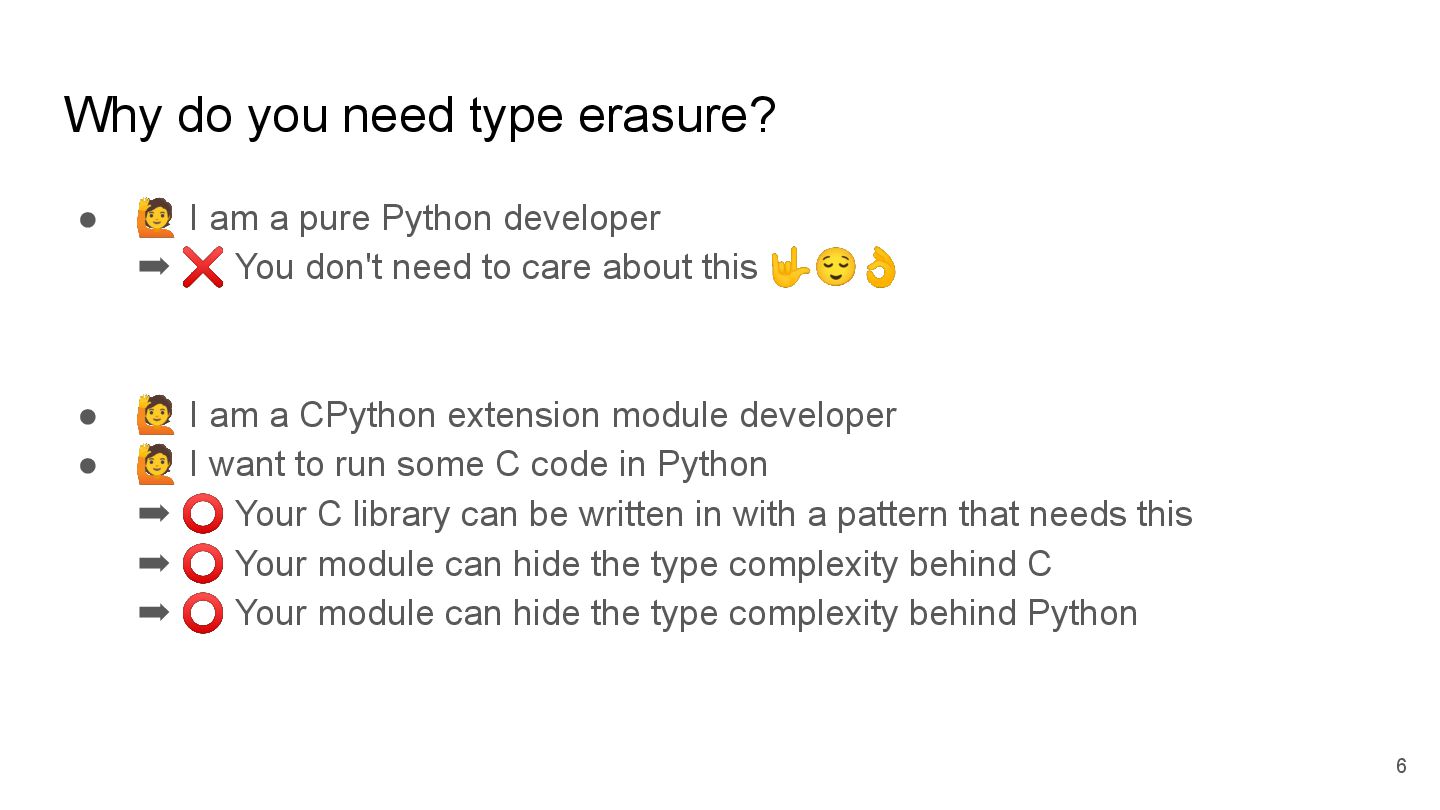 a pure Python developer ➡ ❌ You don't need to care about this 🤟😌👌 • 🙋 I am a CPython extension module developer • 🙋 I want to run some C code in Python ➡ ⭕ Your C library can be written in with a pattern that needs this ➡ ⭕ Your module can hide the type complexity behind C ➡ ⭕ Your module can hide the type complexity behind Python 6