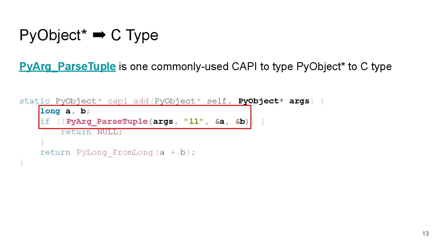 ➡ C Type PyObject* 12 PyObject is in Python runtime environment PyObject's static type does not matter PyObject is passed from Python to C C types the PyObject with a C type