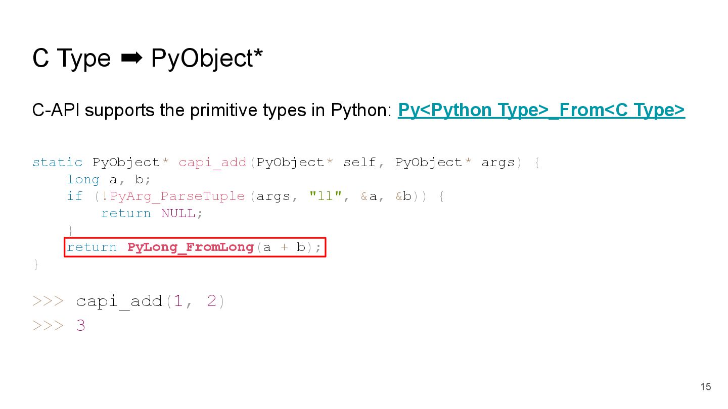 C Type ➡ PyObject* PyObject* ➡ C Type 14 PyObject is passed from C to Python C needs to convert C type to Python type in PyObject Sometime Python passes back the same PyObject to C again C needs to type the PyObject in C type