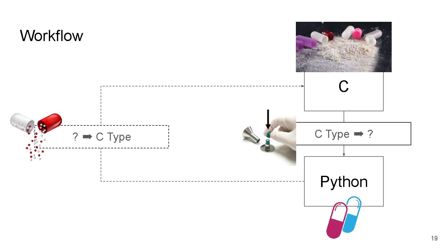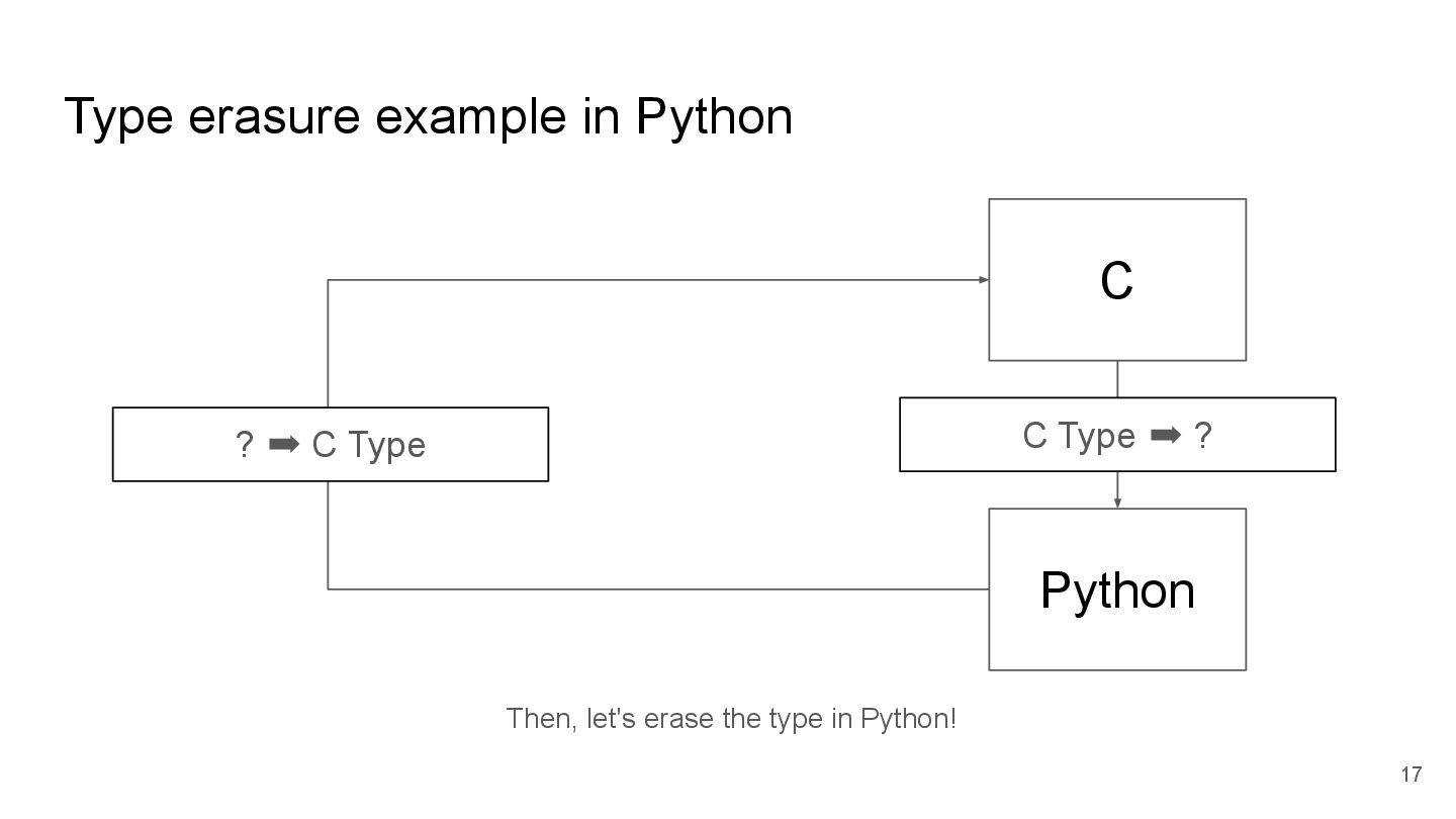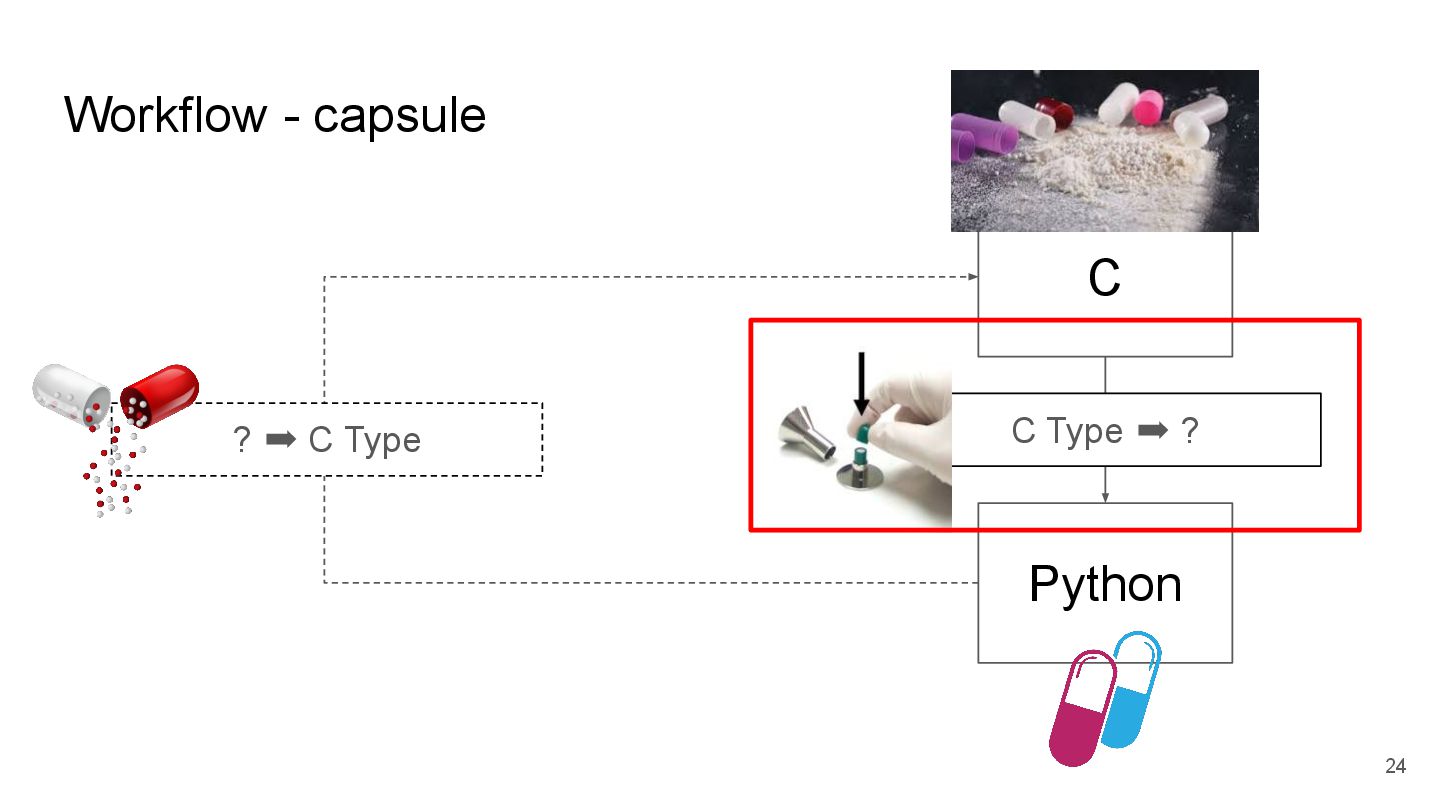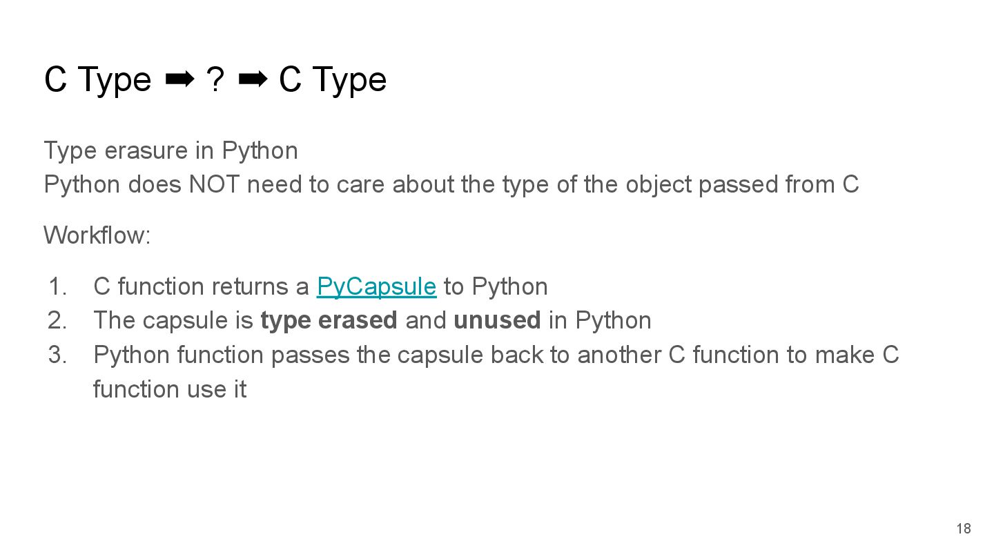 Python Python does NOT need to care about the type of the object passed from C Workflow: 1. C function returns a PyCapsule to Python 2. The capsule is type erased and unused in Python 3. Python function passes the capsule back to another C function to make C function use it 18