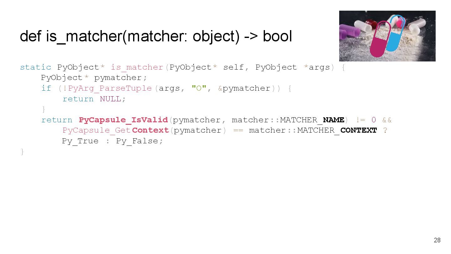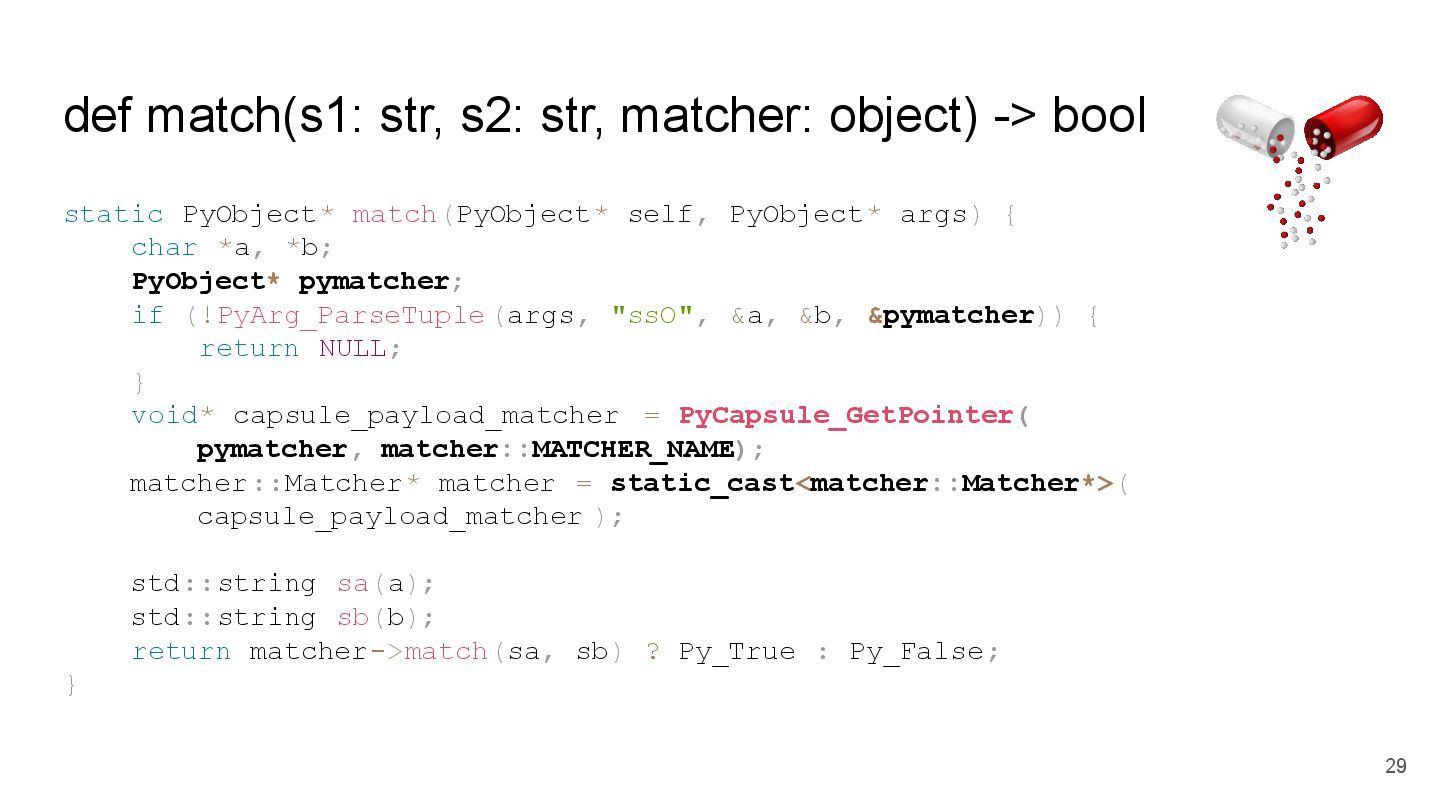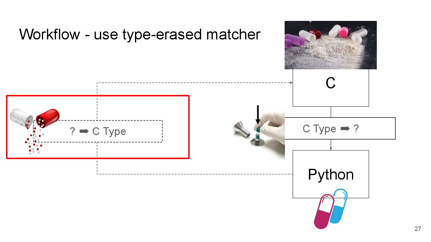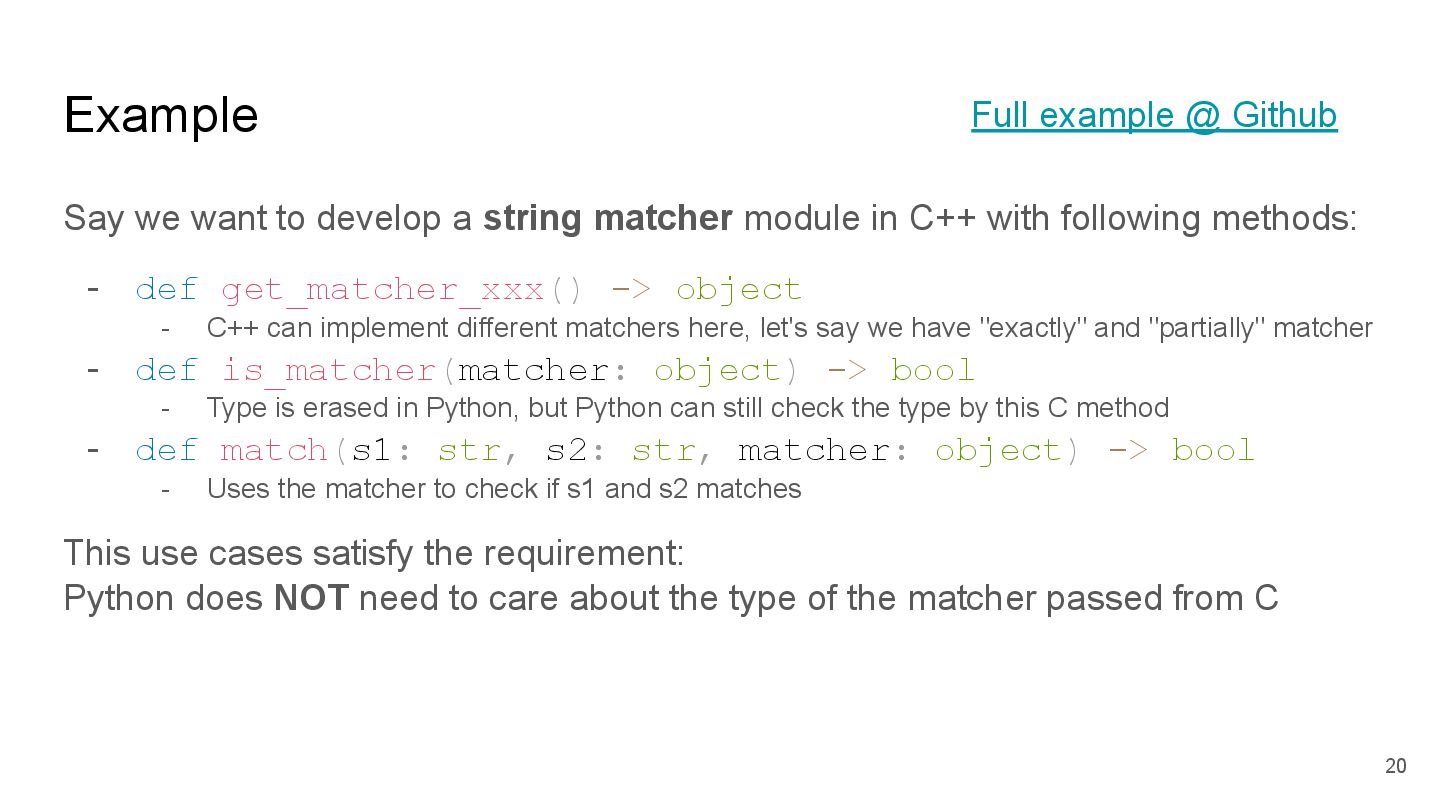 in C++ with following methods: - def get_matcher_xxx() -> object - C++ can implement different matchers here, let's say we have "exactly" and "partially" matcher - def is_matcher(matcher: object) -> bool - Type is erased in Python, but Python can still check the type by this C method - def match(s1: str, s2: str, matcher: object) -> bool - Uses the matcher to check if s1 and s2 matches This use cases satisfy the requirement: Python does NOT need to care about the type of the matcher passed from C 20 Full example @ Github
