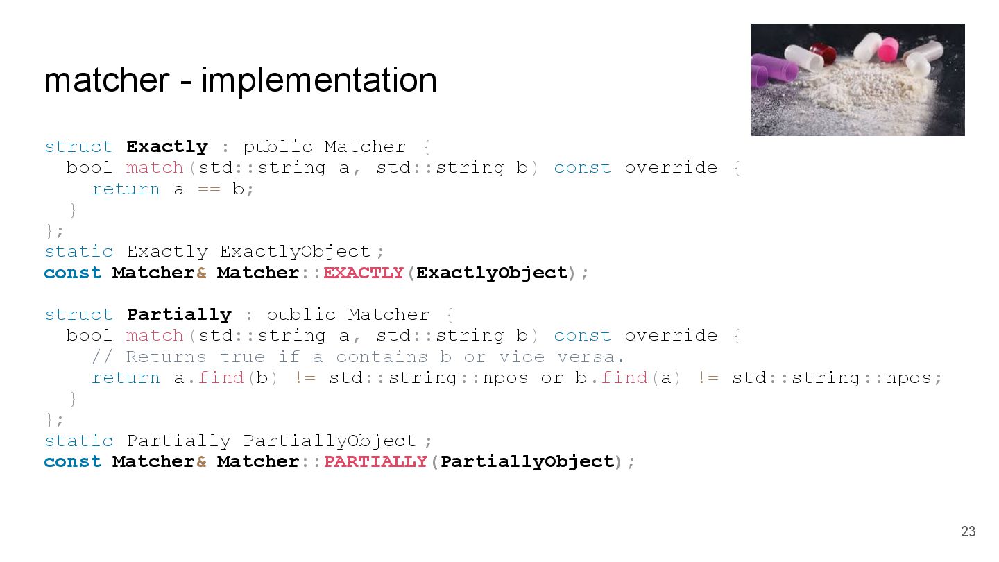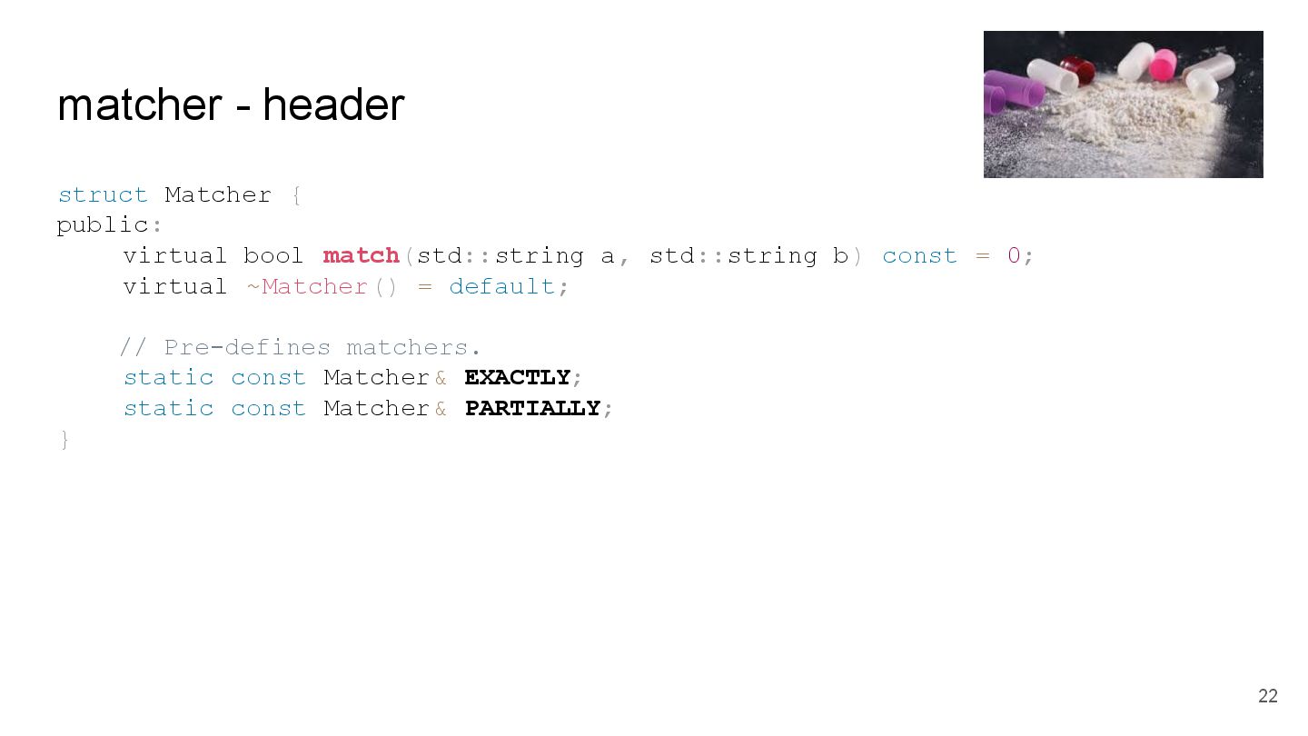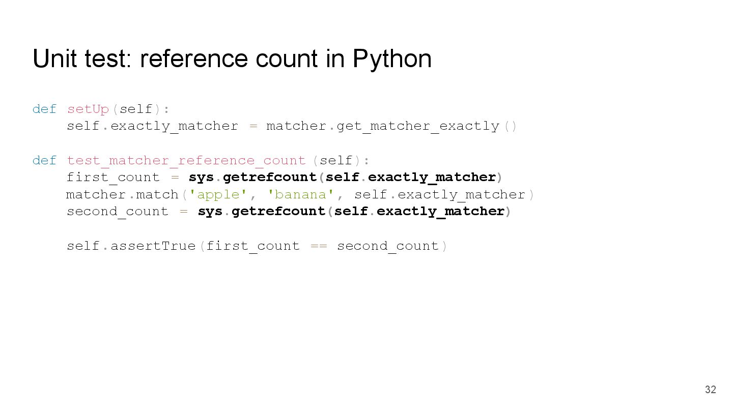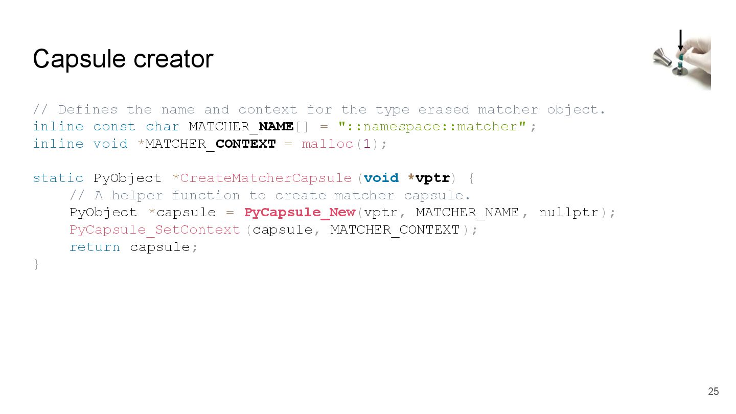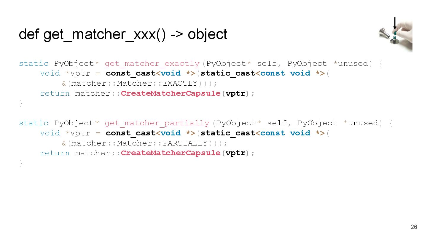 in C++ with following methods: - def get_matcher_xxx() -> object - C++ can implement different matchers here, let's say we have "exactly" and "partially" matcher - def is_matcher(matcher: object) -> bool - Type is erased in Python, but Python can still check the type by this C method - def match(s1: str, s2: str, matcher: object) -> bool - Uses the matcher to check if s1 and s2 matches This use cases satisfy the requirement: Python does NOT need to care about the type of the matcher passed from C 20 Full example @ Github