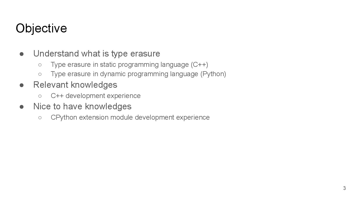 in static programming language (C++) ◦ Type erasure in dynamic programming language (Python) • Relevant knowledges ◦ C++ development experience • Nice to have knowledges ◦ CPython extension module development experience 3
