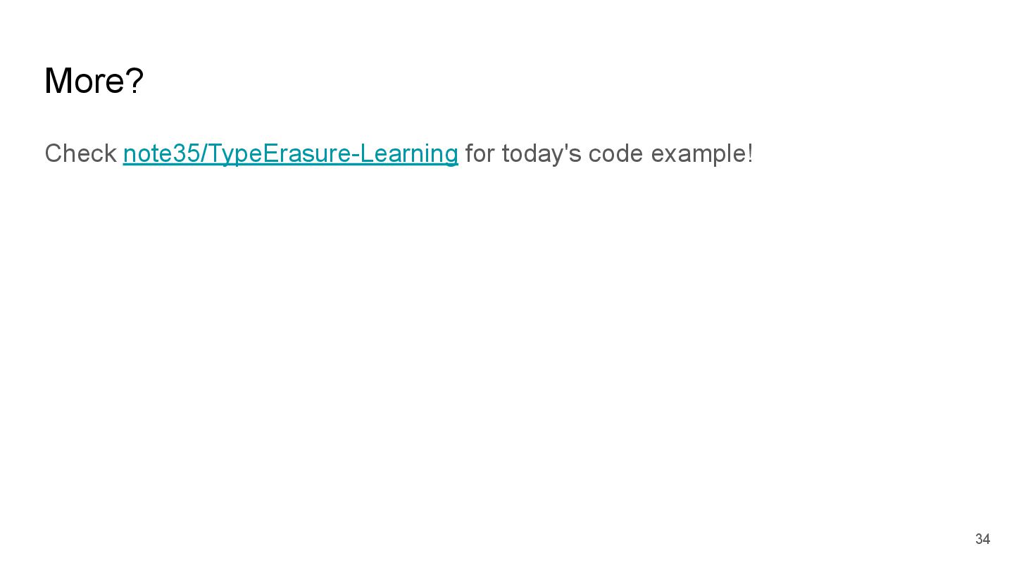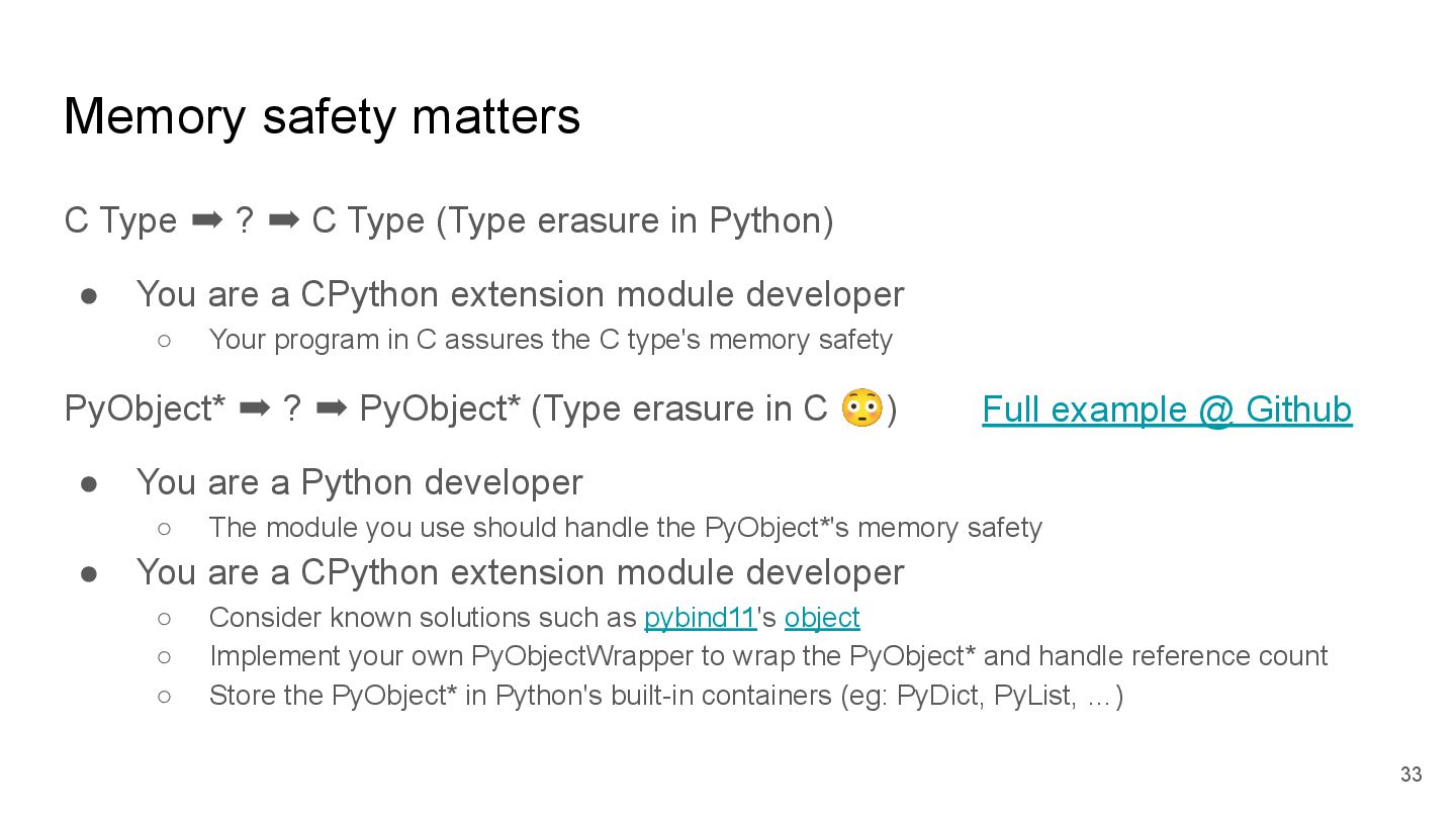 (Type erasure in Python) • You are a CPython extension module developer ◦ Your program in C assures the C type's memory safety PyObject* ➡ ? ➡ PyObject* (Type erasure in C 😳) • You are a Python developer ◦ The module you use should handle the PyObject*'s memory safety • You are a CPython extension module developer ◦ Consider known solutions such as pybind11's object ◦ Implement your own PyObjectWrapper to wrap the PyObject* and handle reference count ◦ Store the PyObject* in Python's built-in containers (eg: PyDict, PyList, …) 33 Full example @ Github