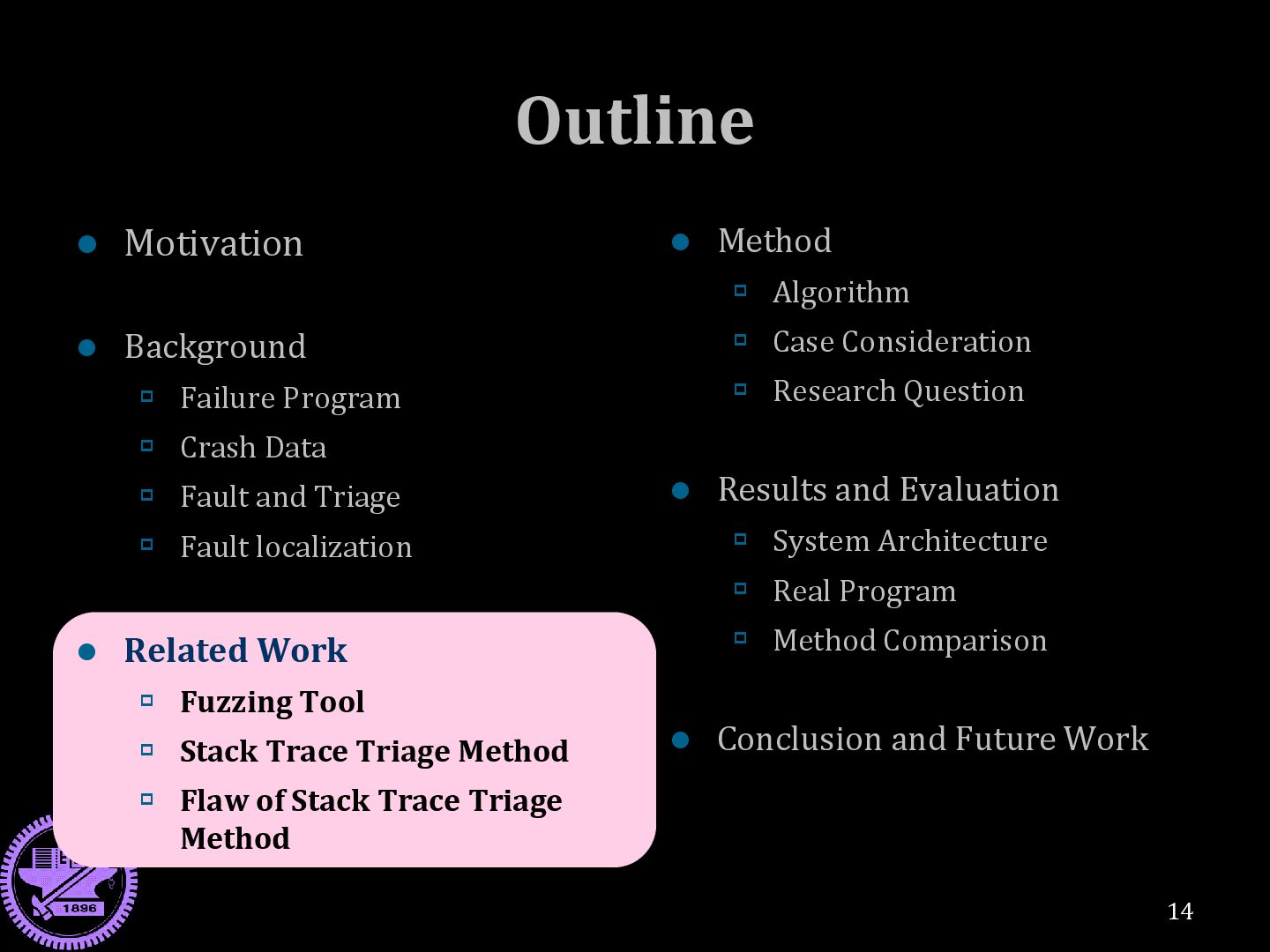 Data Fault and Triage Fault localization Related Work Fuzzing Tool Stack Trace Triage Method Flaw of Stack Trace Triage Method 14 Method Algorithm Case Consideration Research Question Results and Evaluation System Architecture Real Program Method Comparison Conclusion and Future Work
