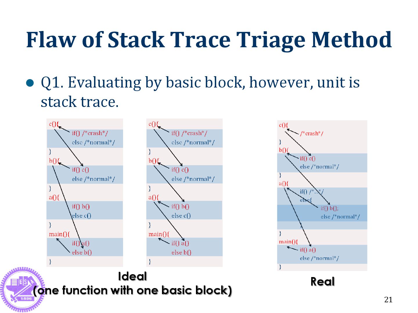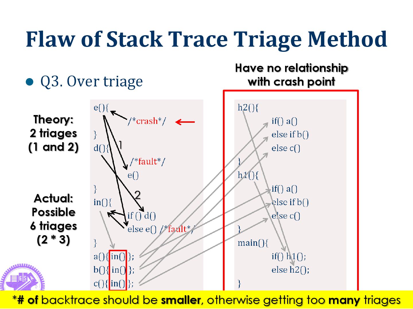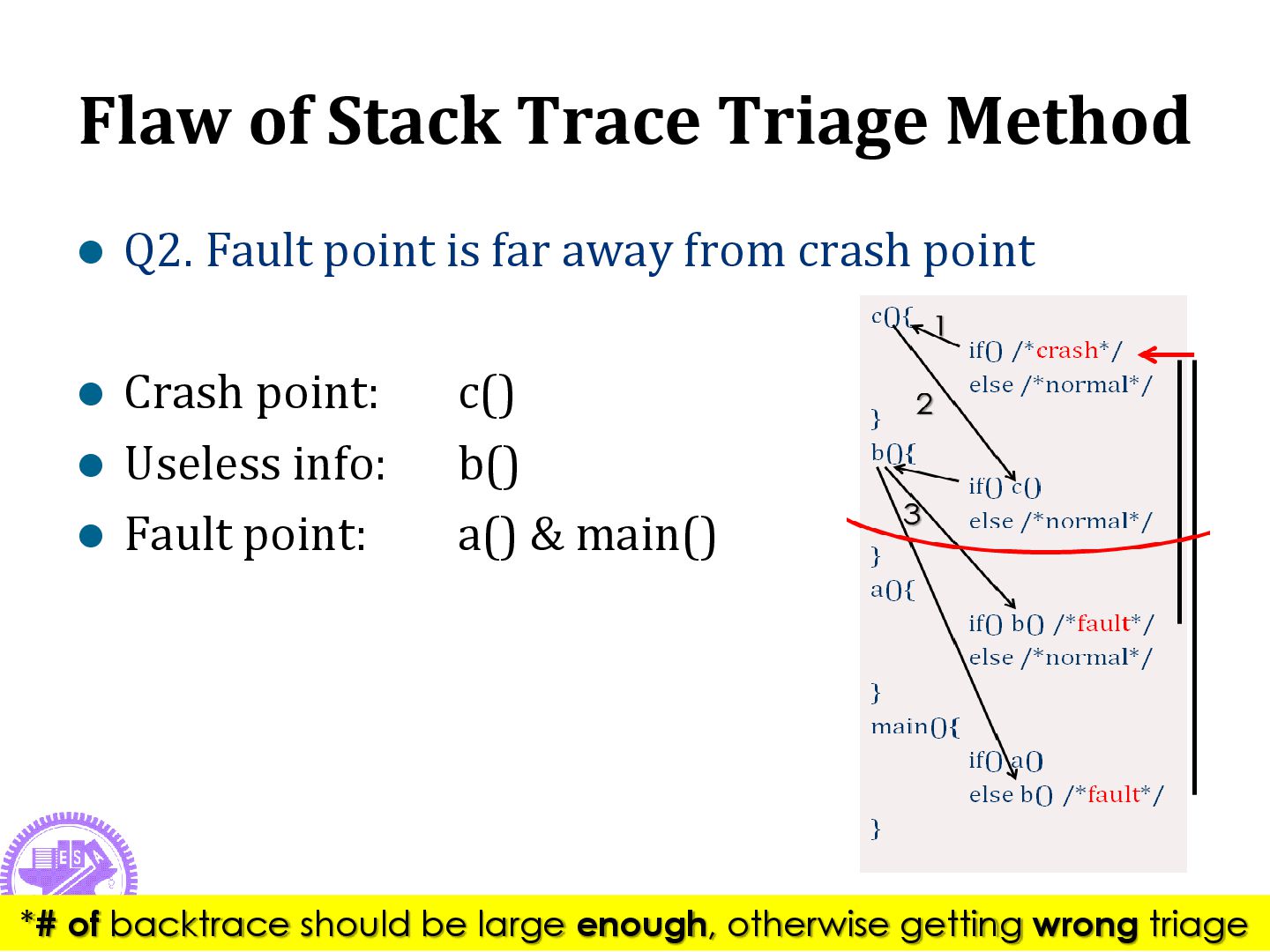 is far away from crash point Crash point: c() Useless info: b() Fault point: a() & main() 22 *# of backtrace should be large enough, otherwise getting wrong triage