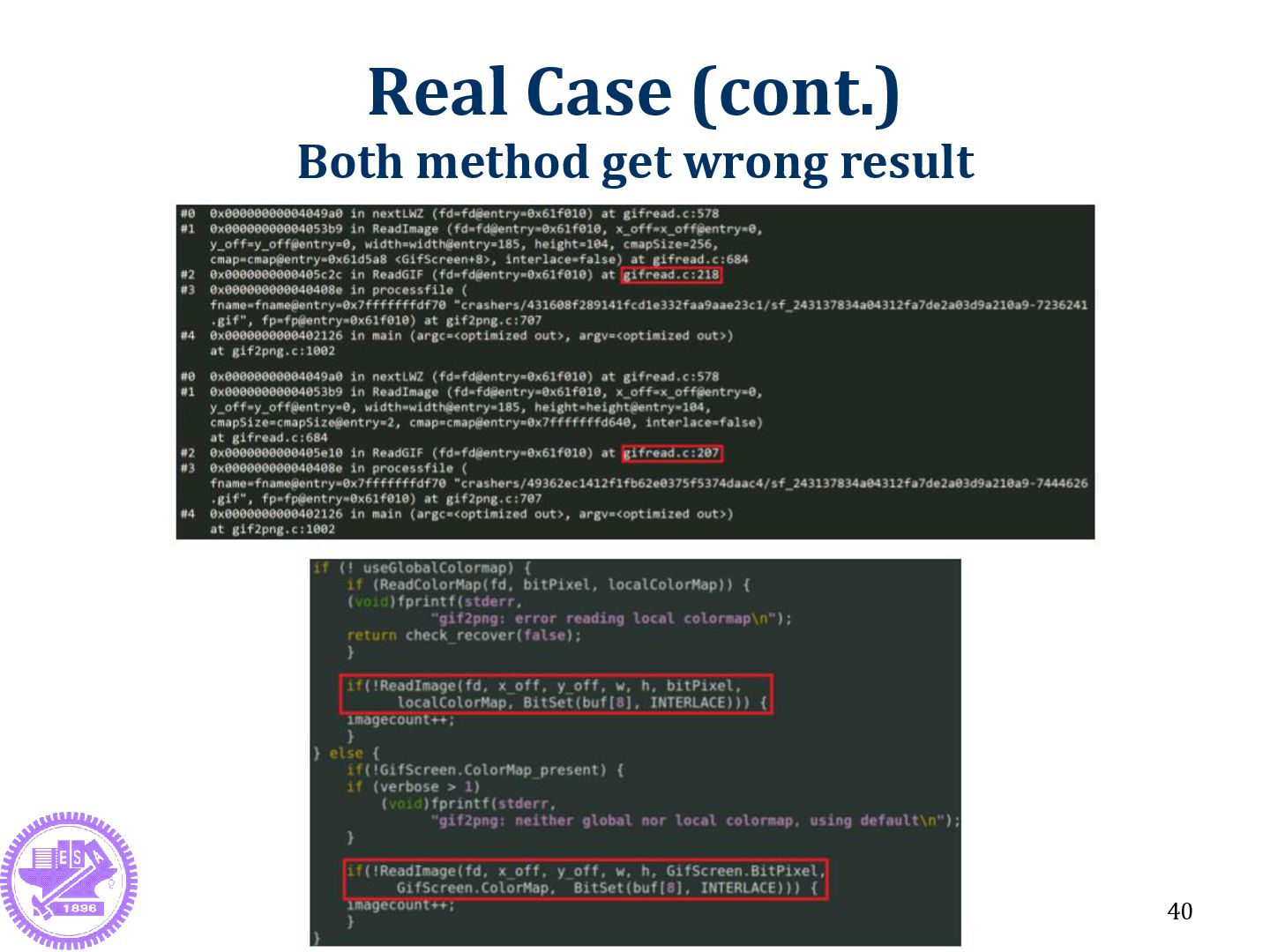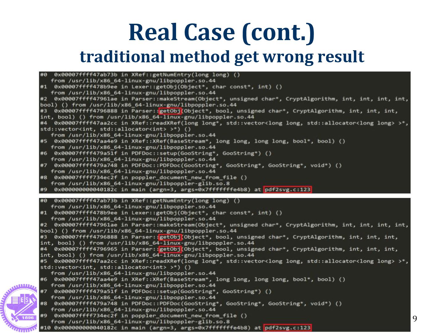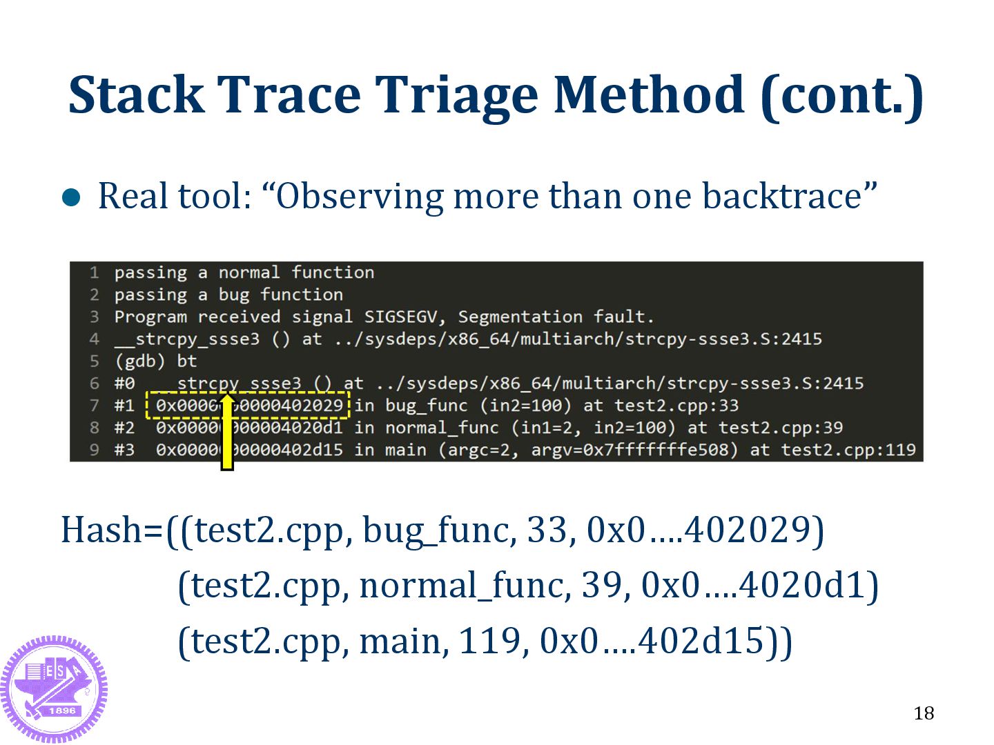 is far away from crash point Crash point: c() Useless info: b() Fault point: a() & main() 22 *# of backtrace should be large enough, otherwise getting wrong triage