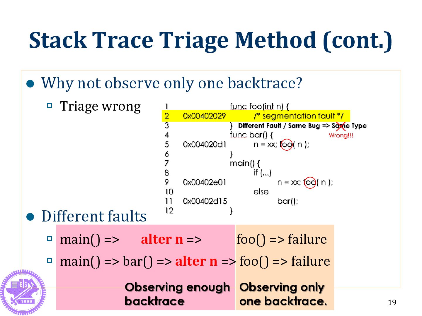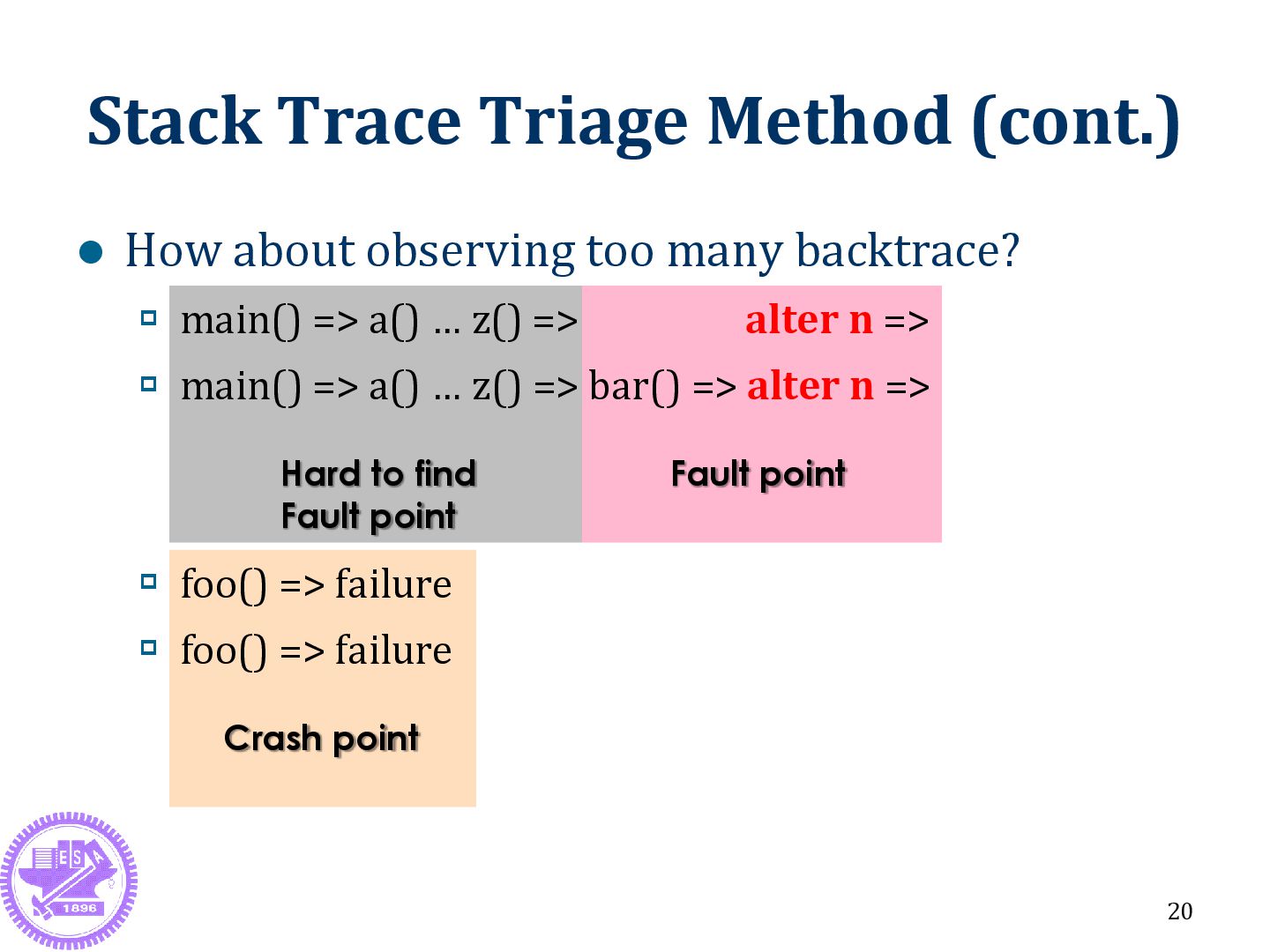 one backtrace? Triage wrong Different faults main() => alter n => foo() => failure main() => bar() => alter n => foo() => failure 19 Observing only one backtrace. Observing enough backtrace