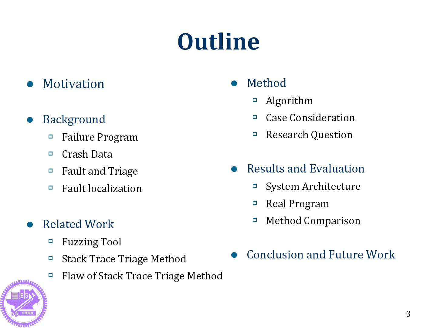 Data Fault and Triage Fault localization Related Work Fuzzing Tool Stack Trace Triage Method Flaw of Stack Trace Triage Method 3 Method Algorithm Case Consideration Research Question Results and Evaluation System Architecture Real Program Method Comparison Conclusion and Future Work