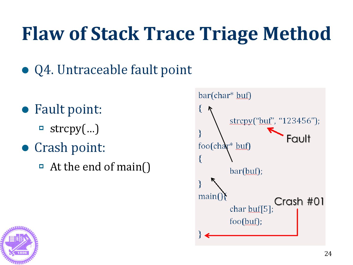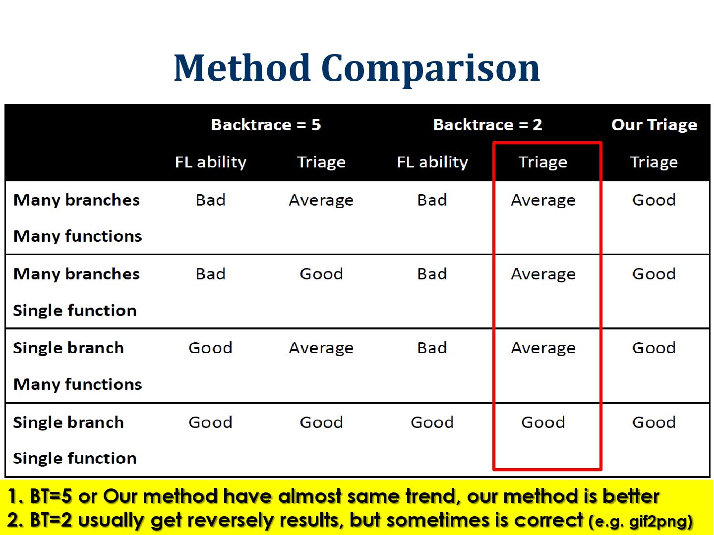 23 Have no relationship with crash point Theory: 2 triages (1 and 2) Actual: Possible 6 triages (2 * 3) *# of backtrace should be smaller, otherwise getting too many triages