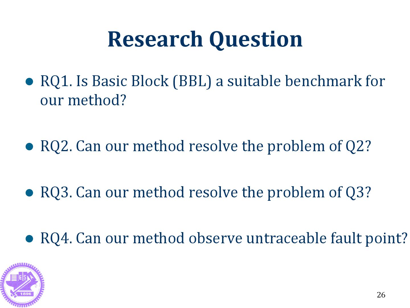 benchmark for our method? RQ2. Can our method resolve the problem of Q2? RQ3. Can our method resolve the problem of Q3? RQ4. Can our method observe untraceable fault point? 26