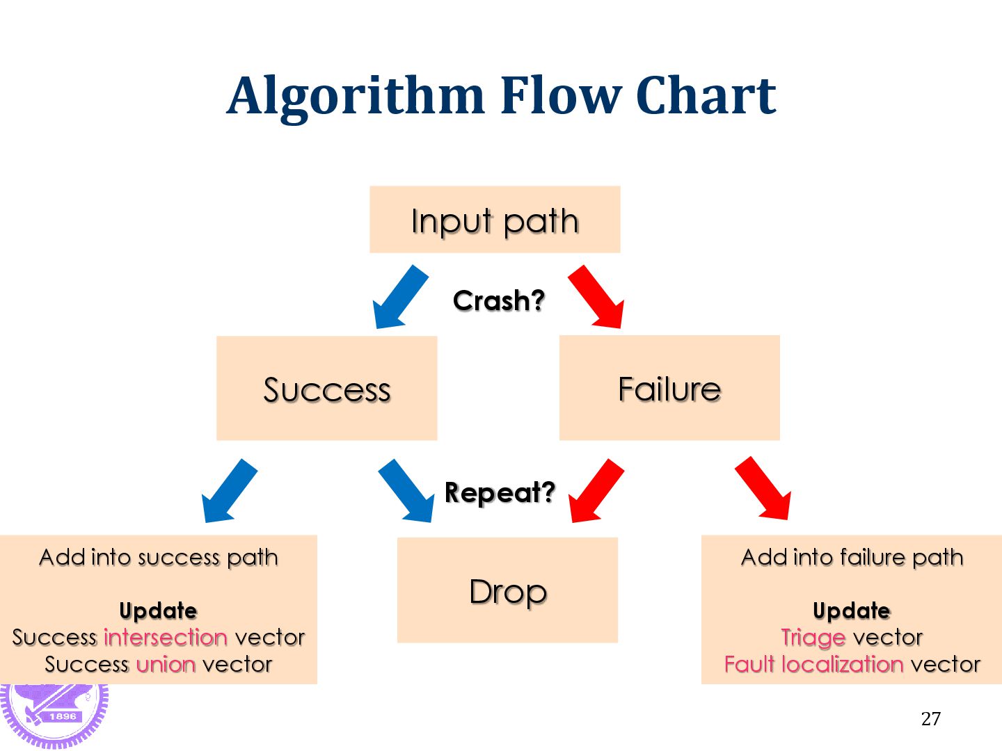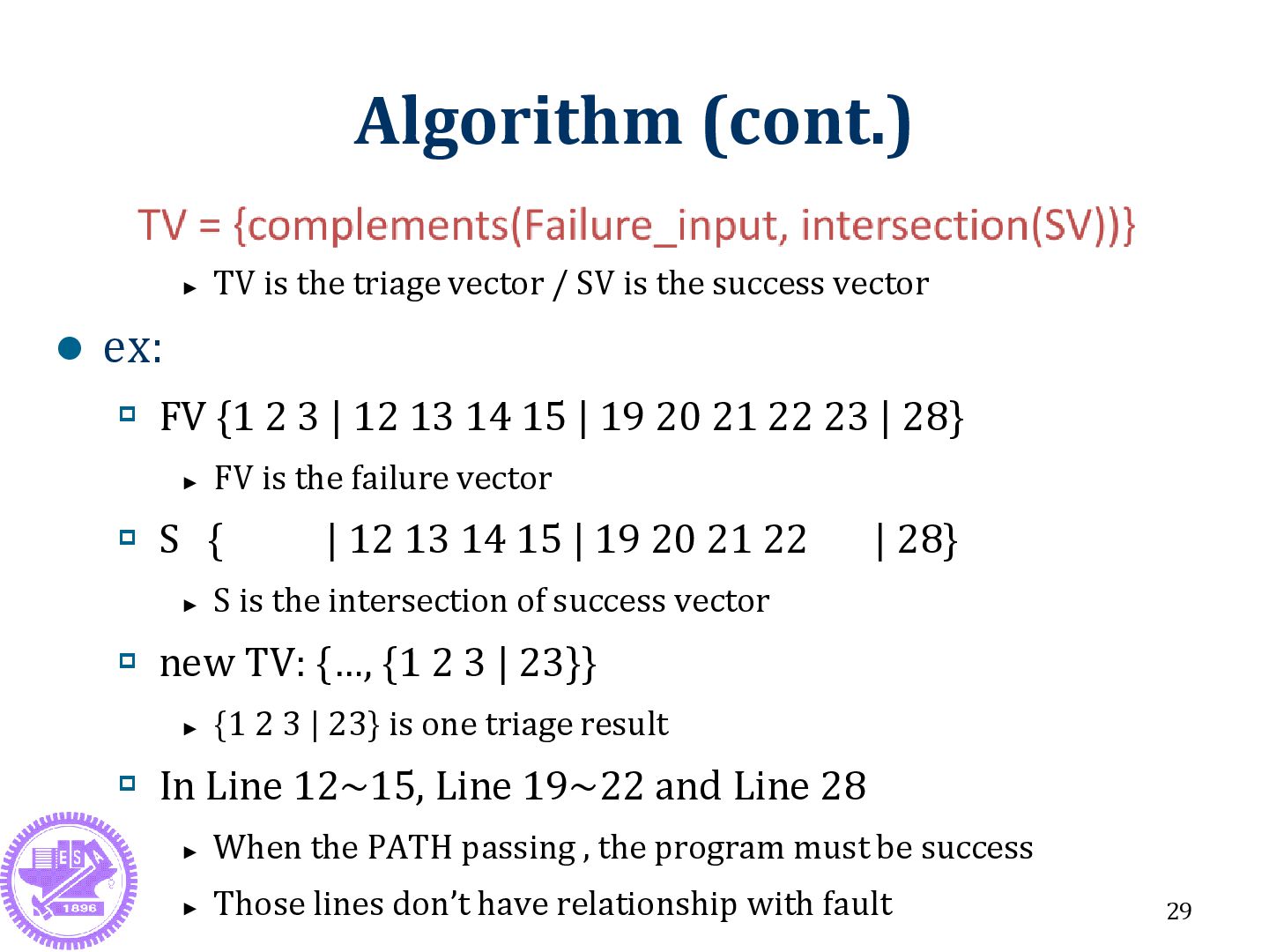 is the success vector ex: FV {1 2 3 | 12 13 14 15 | 19 20 21 22 23 | 28} ► FV is the failure vector S { | 12 13 14 15 | 19 20 21 22 | 28} ► S is the intersection of success vector new TV: {…, {1 2 3 | 23}} ► {1 2 3 | 23} is one triage result In Line 12~15, Line 19~22 and Line 28 ► When the PATH passing , the program must be success ► Those lines don’t have relationship with fault 29