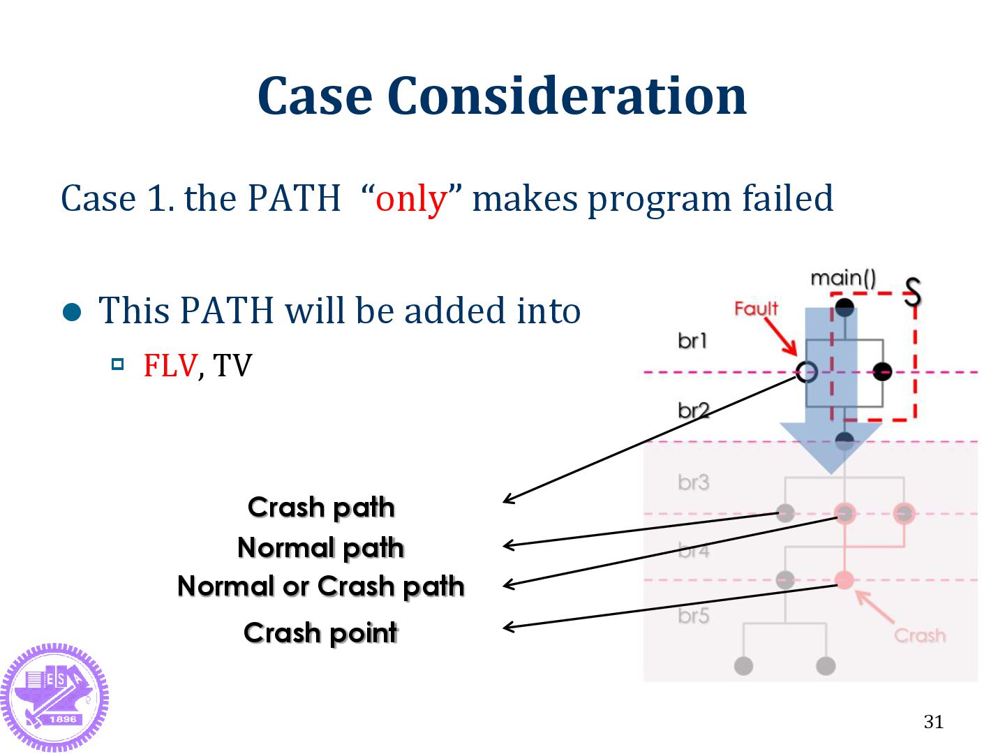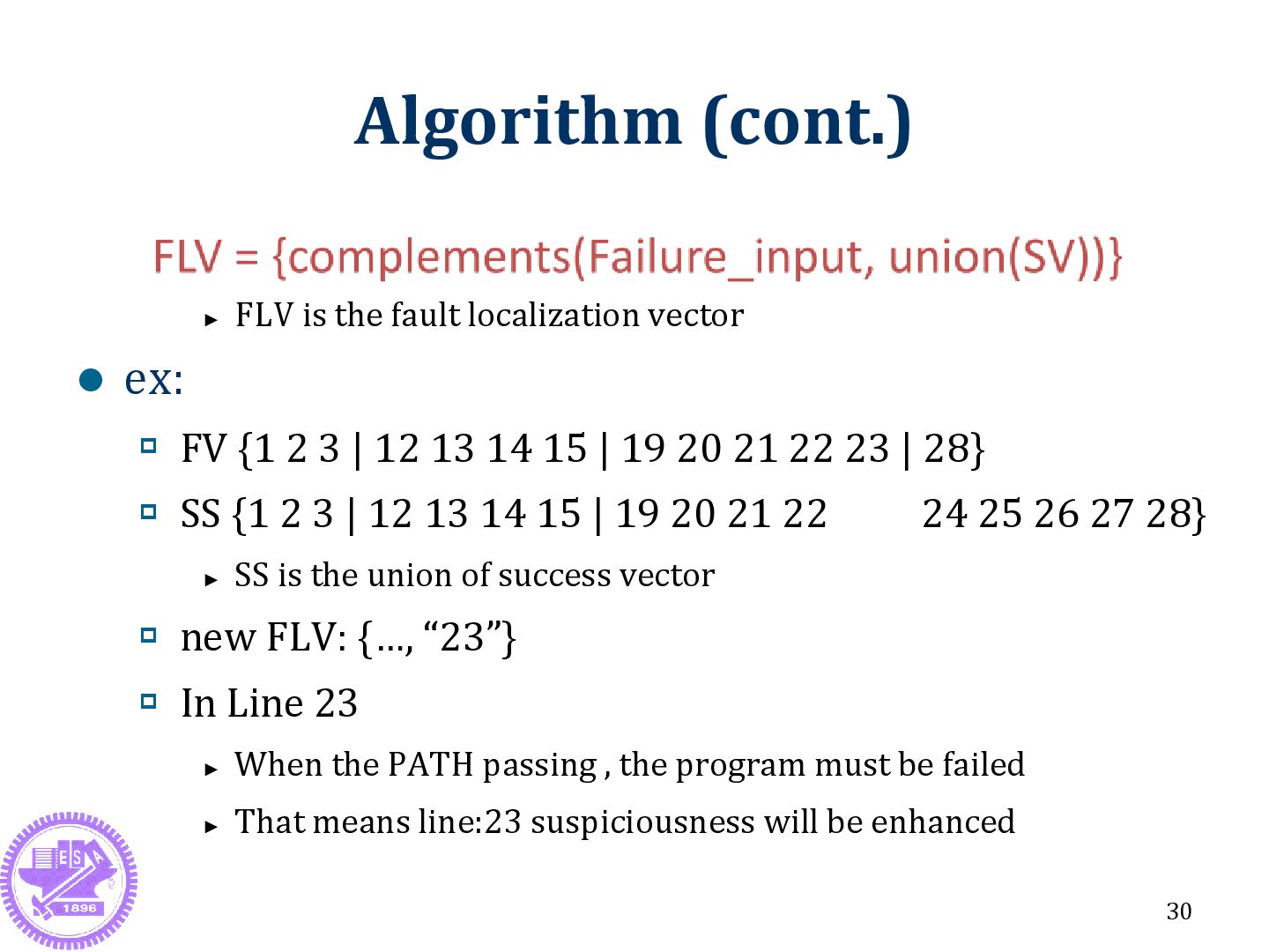 ex: FV {1 2 3 | 12 13 14 15 | 19 20 21 22 23 | 28} SS {1 2 3 | 12 13 14 15 | 19 20 21 22 24 25 26 27 28} ► SS is the union of success vector new FLV: {…, “23”} In Line 23 ► When the PATH passing , the program must be failed ► That means line:23 suspiciousness will be enhanced 30