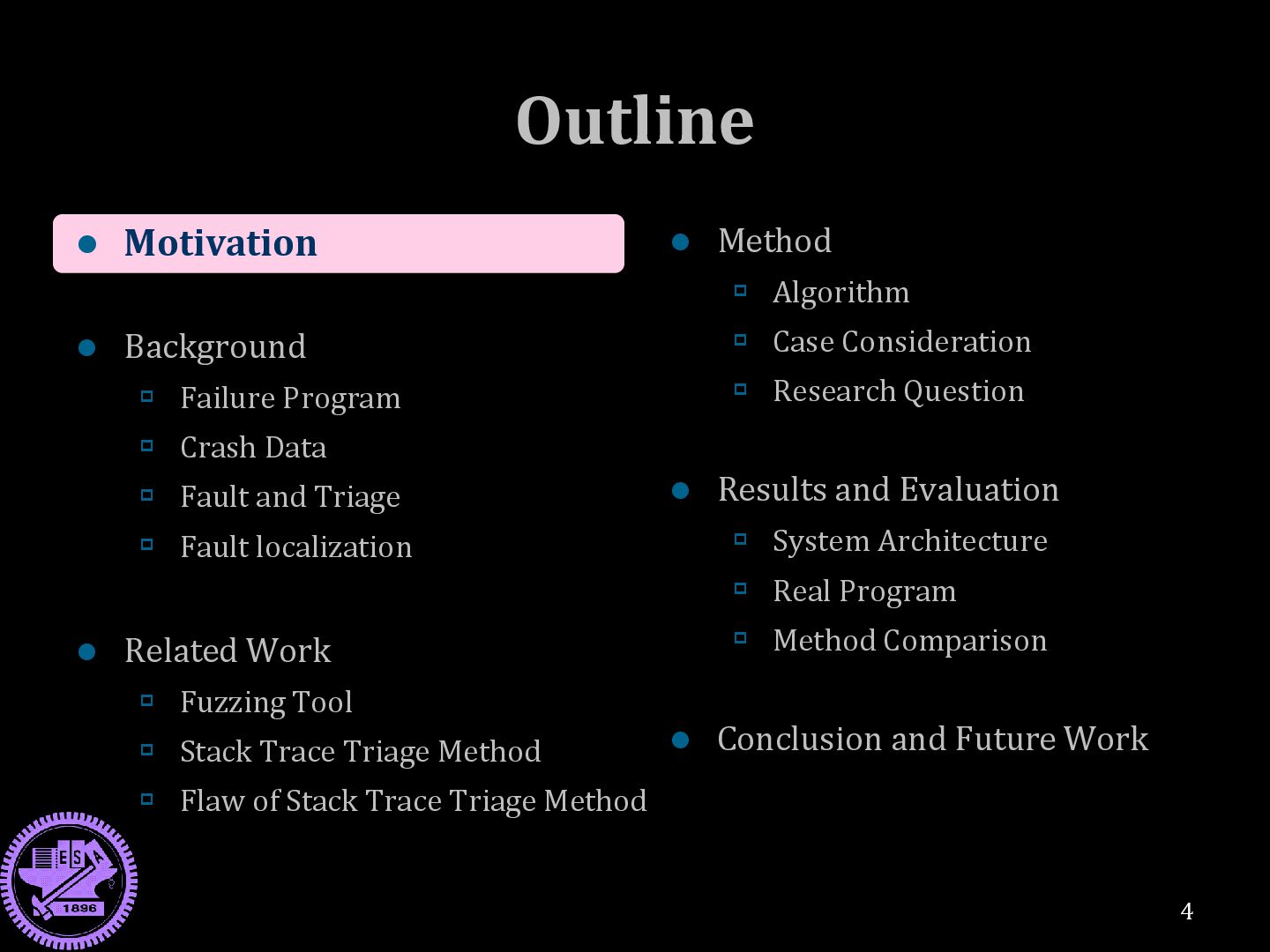Data Fault and Triage Fault localization Related Work Fuzzing Tool Stack Trace Triage Method Flaw of Stack Trace Triage Method 4 Method Algorithm Case Consideration Research Question Results and Evaluation System Architecture Real Program Method Comparison Conclusion and Future Work